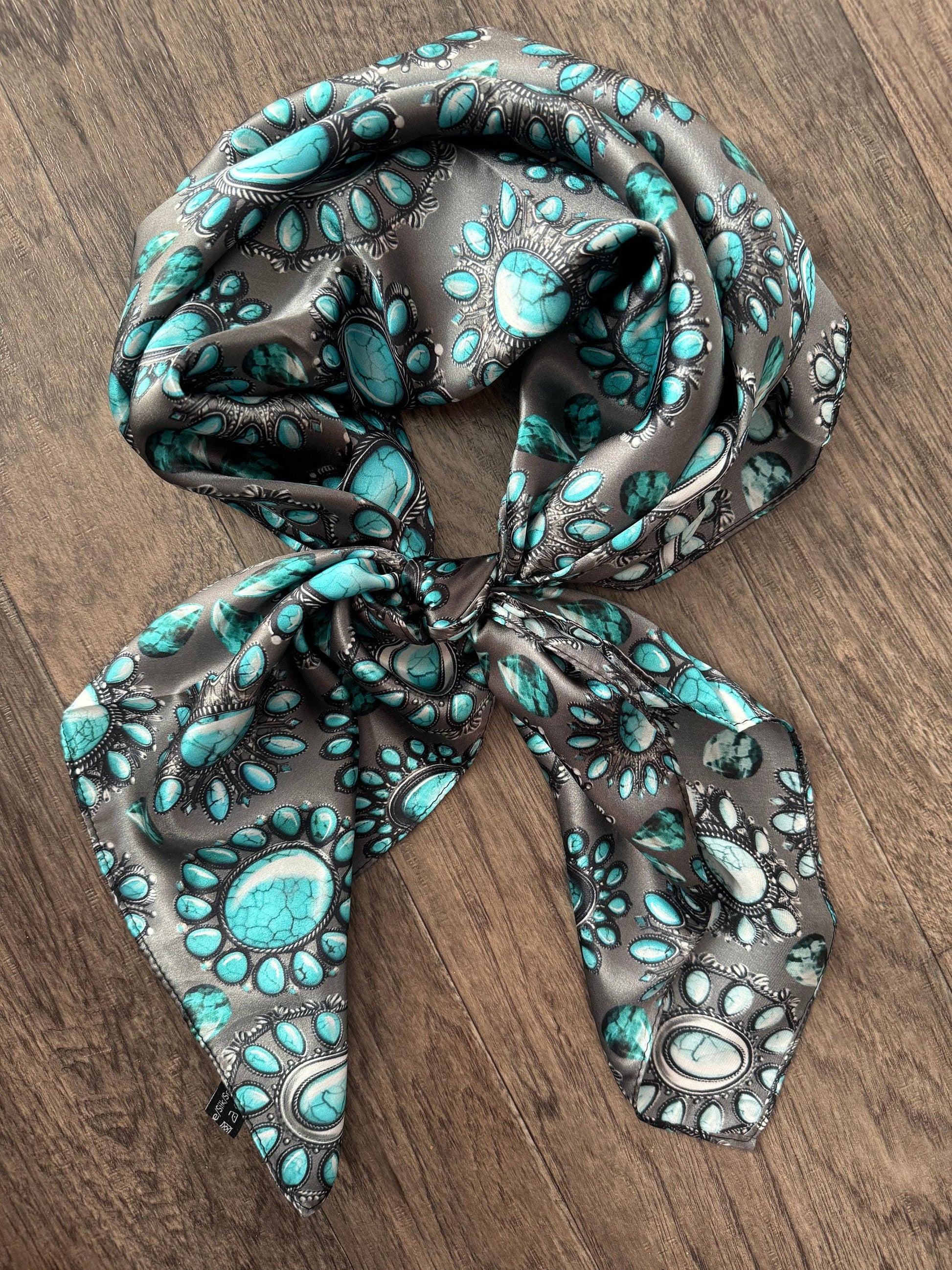 100% Silk Wild Rag Turquoise and Silver jewels and stones on charcoal grey by Double B Wild Rags