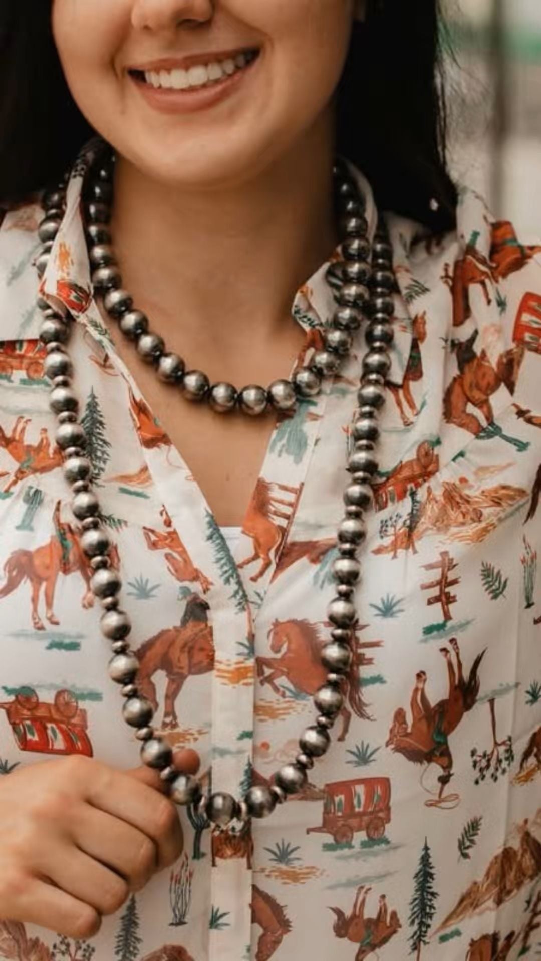 Enhance your jewelry collection with this bold 16-inch Sterling Pearl necklace featuring massive 14mm Sterling silver beads and a 2-inch extender chain. Perfect for adding a BIG punch of casual elegance to any western outfit, this necklace is a must-have.