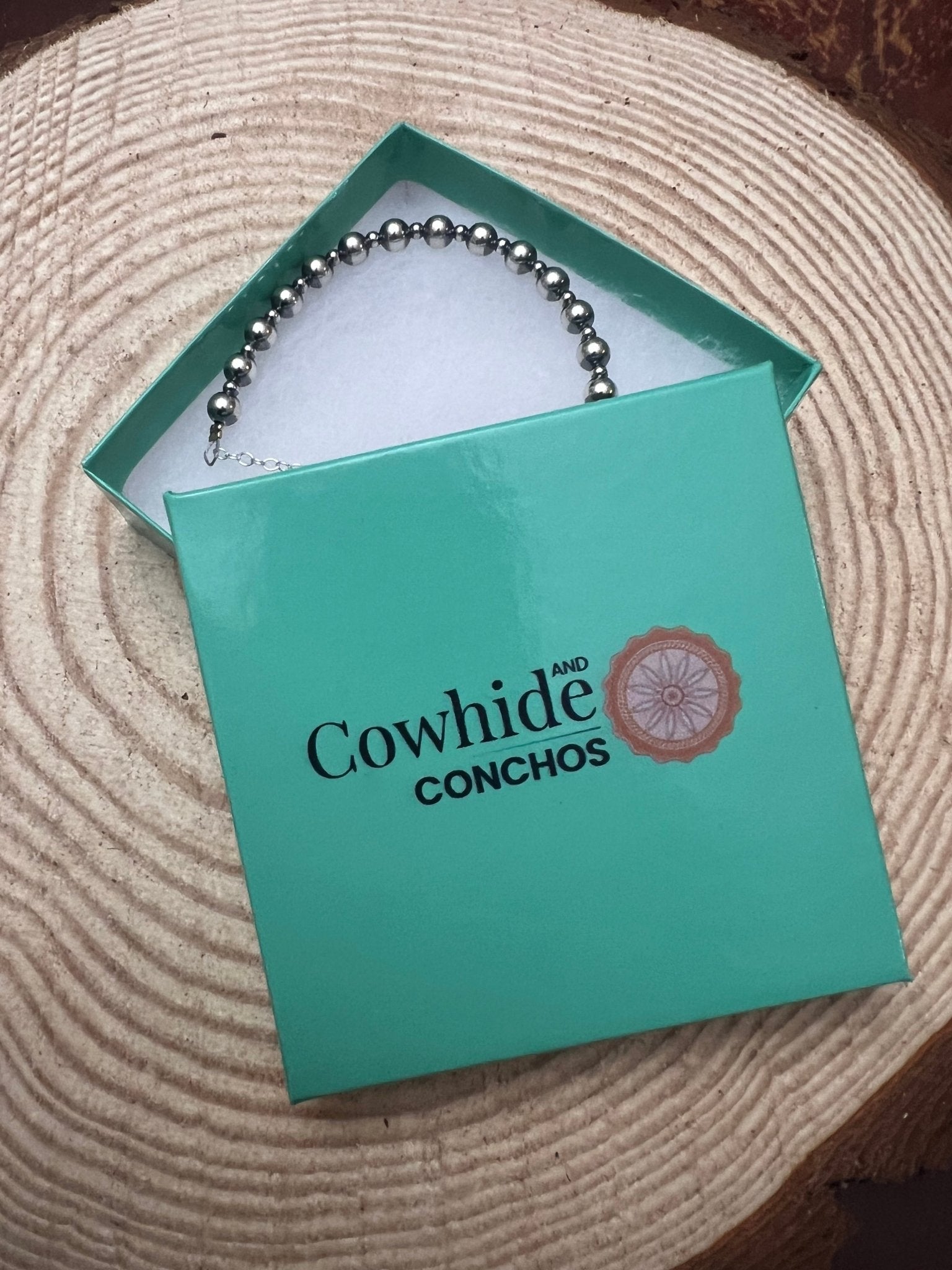 This 3 mm and 6mm Sterling Silver Pearl bracelet features a length of 6 inches with an additional 3 inch chain for easy adjustment. Crafted with genuine sterling silver, it adds a touch of elegance to any western outfit.