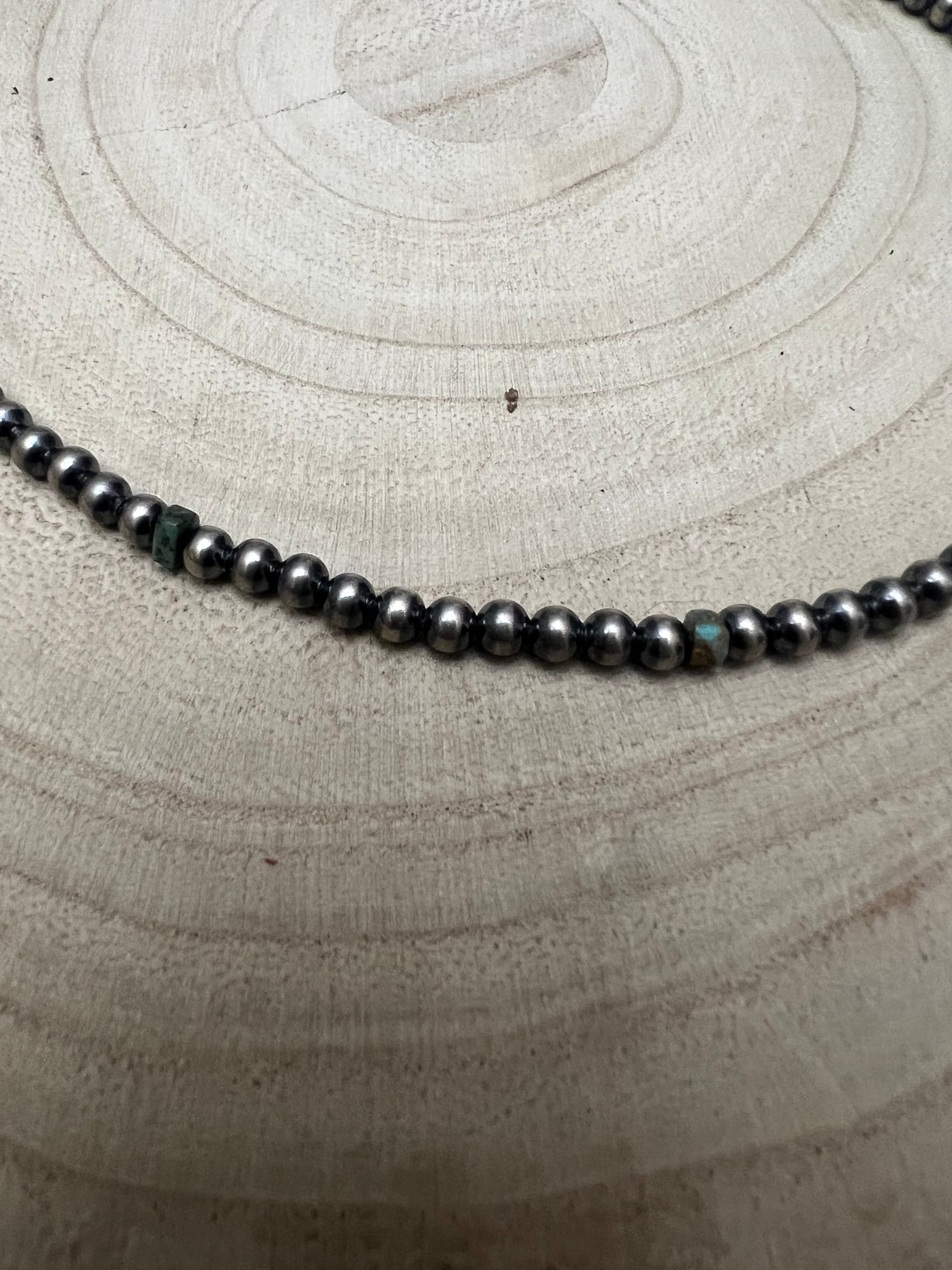 Add a touch of elegance to any outfit with this beautiful Sterling Silver Pearls and Turquoise choker. The 14 inch length, paired with 4 mm Sterling Silver Pearls and real turquoise heishi, makes for a versatile piece. The added 3 inch chain provides adjustability for the perfect fit. Effortlessly elevate your style with this stunning choker!