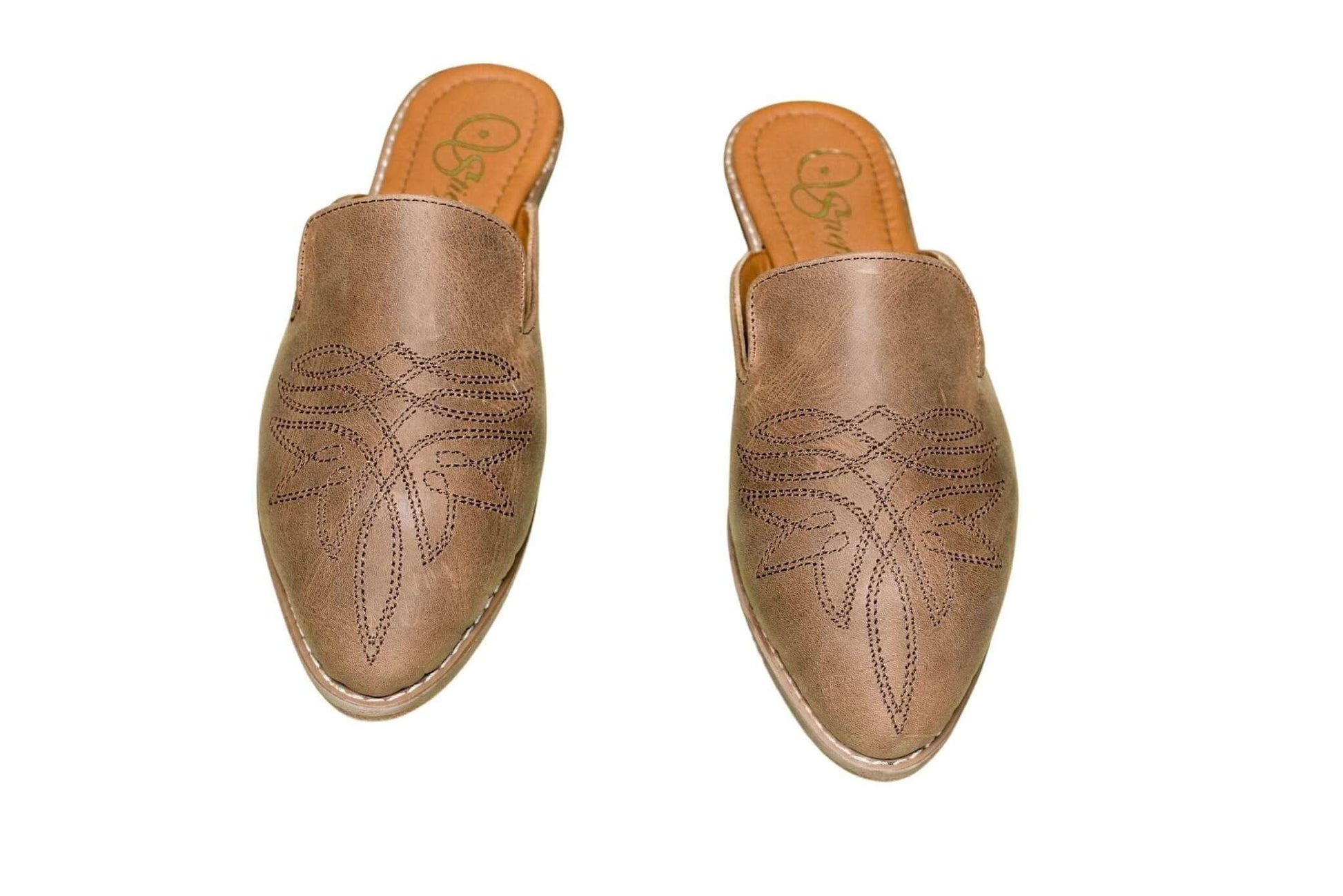 Beautiful brown leather mules with a gold western stitching. The Abby brown has a padded bovine insole, leather sole, and rubber heel cap.