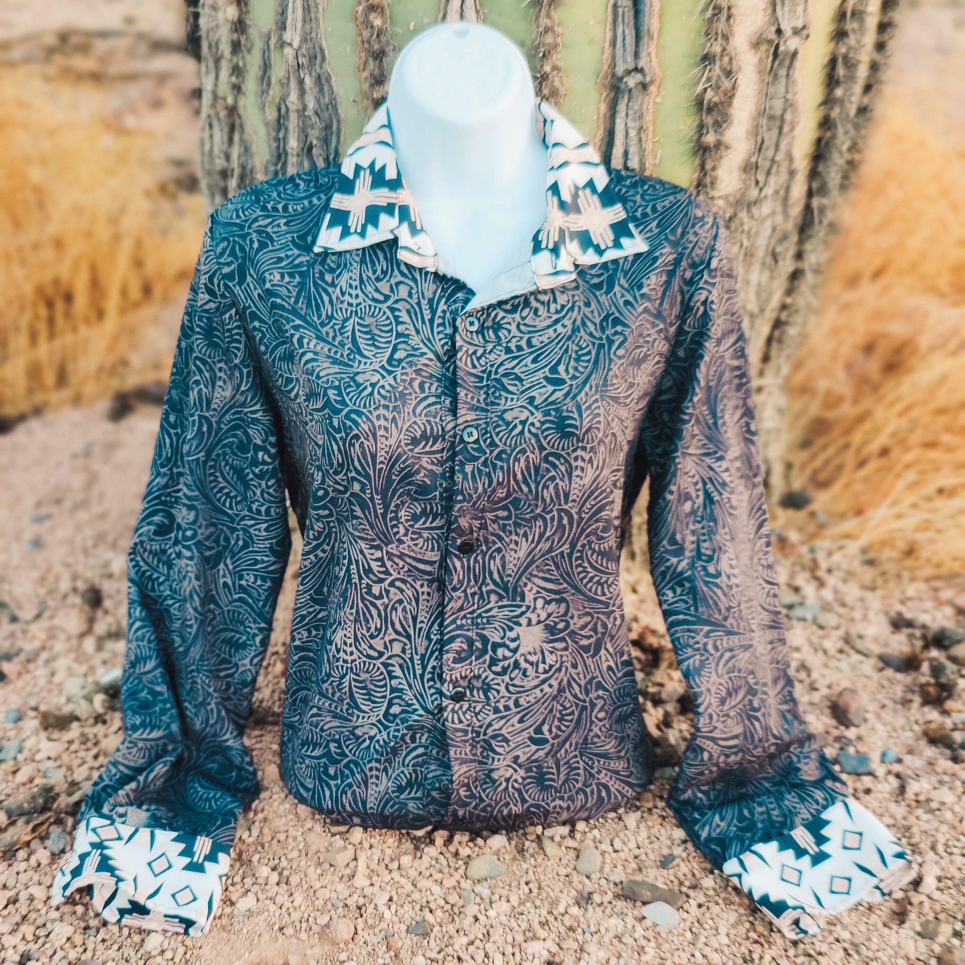 Tooled leather and aztec are to cowgirls like peanut butter is to jelly. They just make sense together. Which is why we paired this fun black leather print button down with bold aztec cuffs for a classy, showstopping look that is sure to make people go "oh wow" as you walk by.