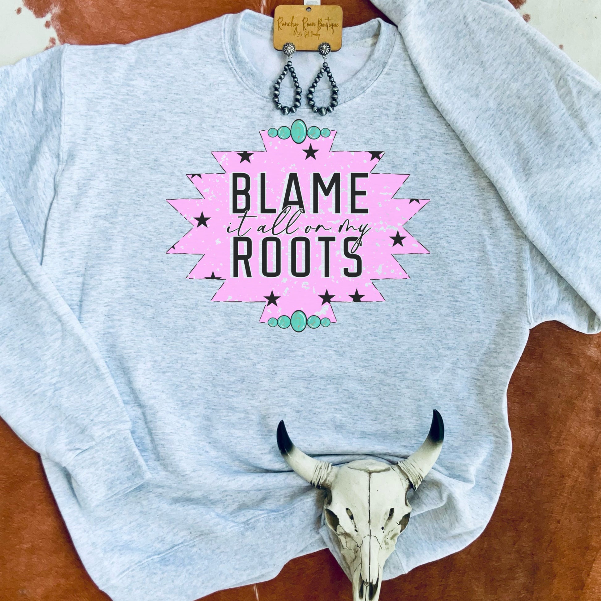 Add a playful touch to your wardrobe with the Blame It All On My Roots Graphic Sweatshirt. This cozy poly/cotton blend sweatshirt features a striking pink Western design that reads “Blame It All On My Roots,” surrounded by black star accents and turquoise details. It’s perfect for casual days or Western-themed events.