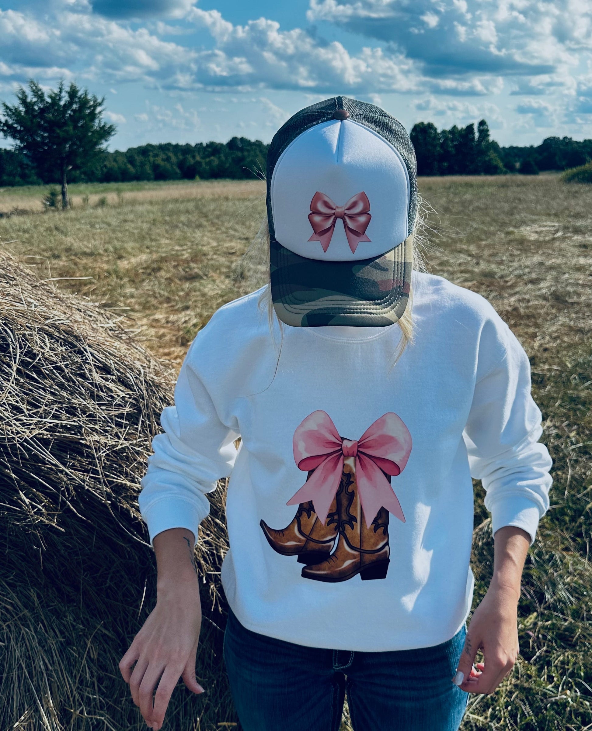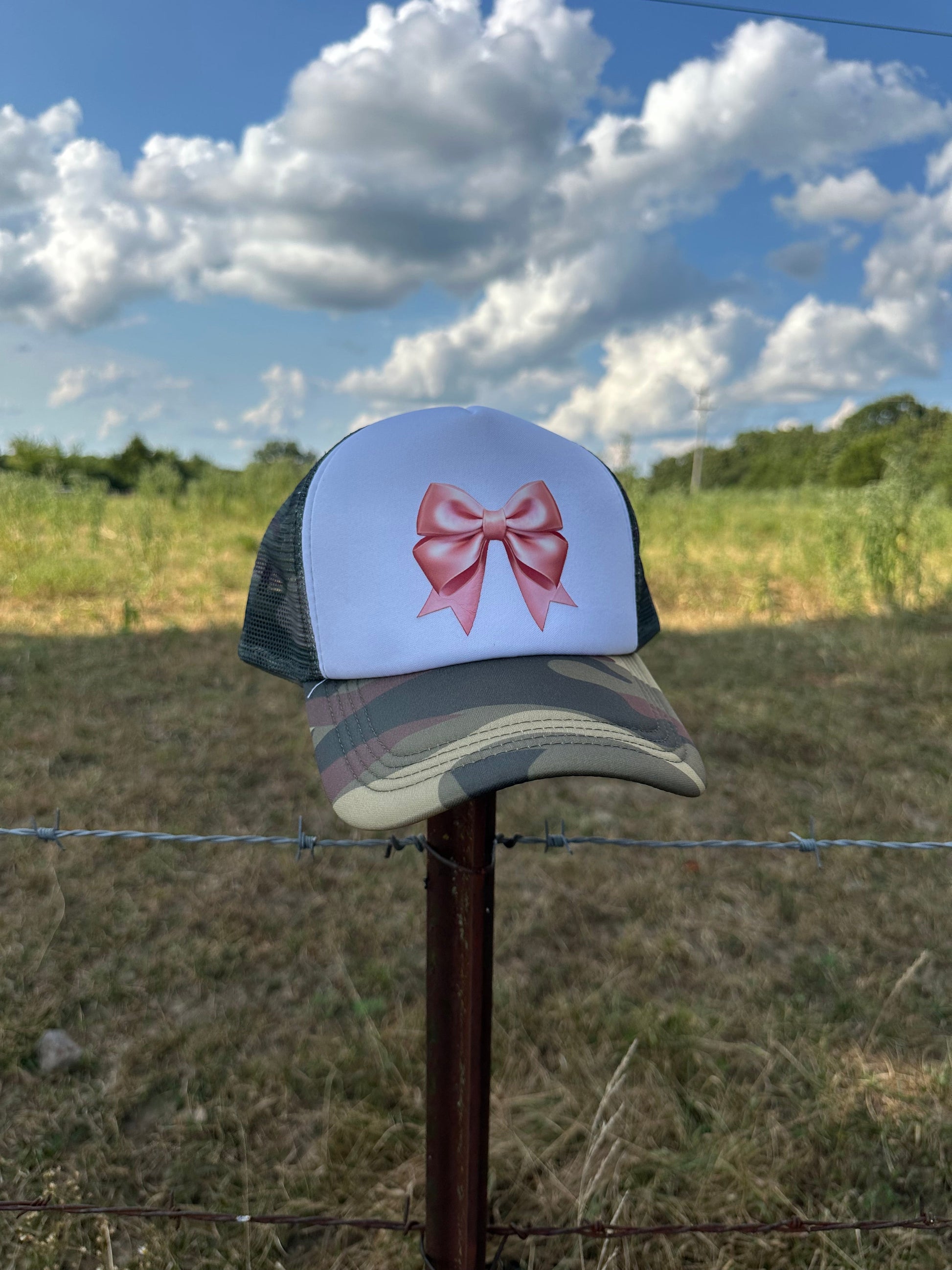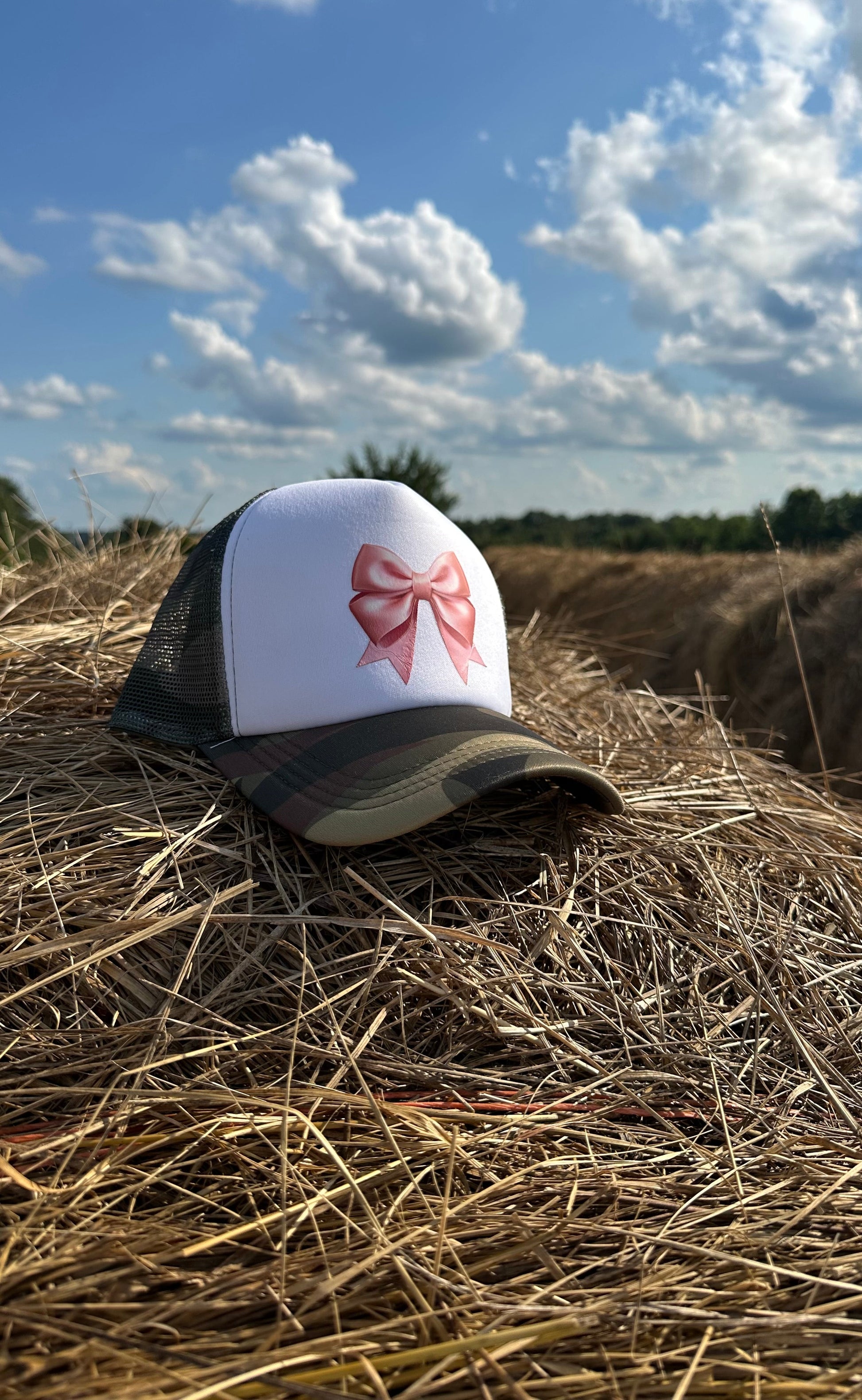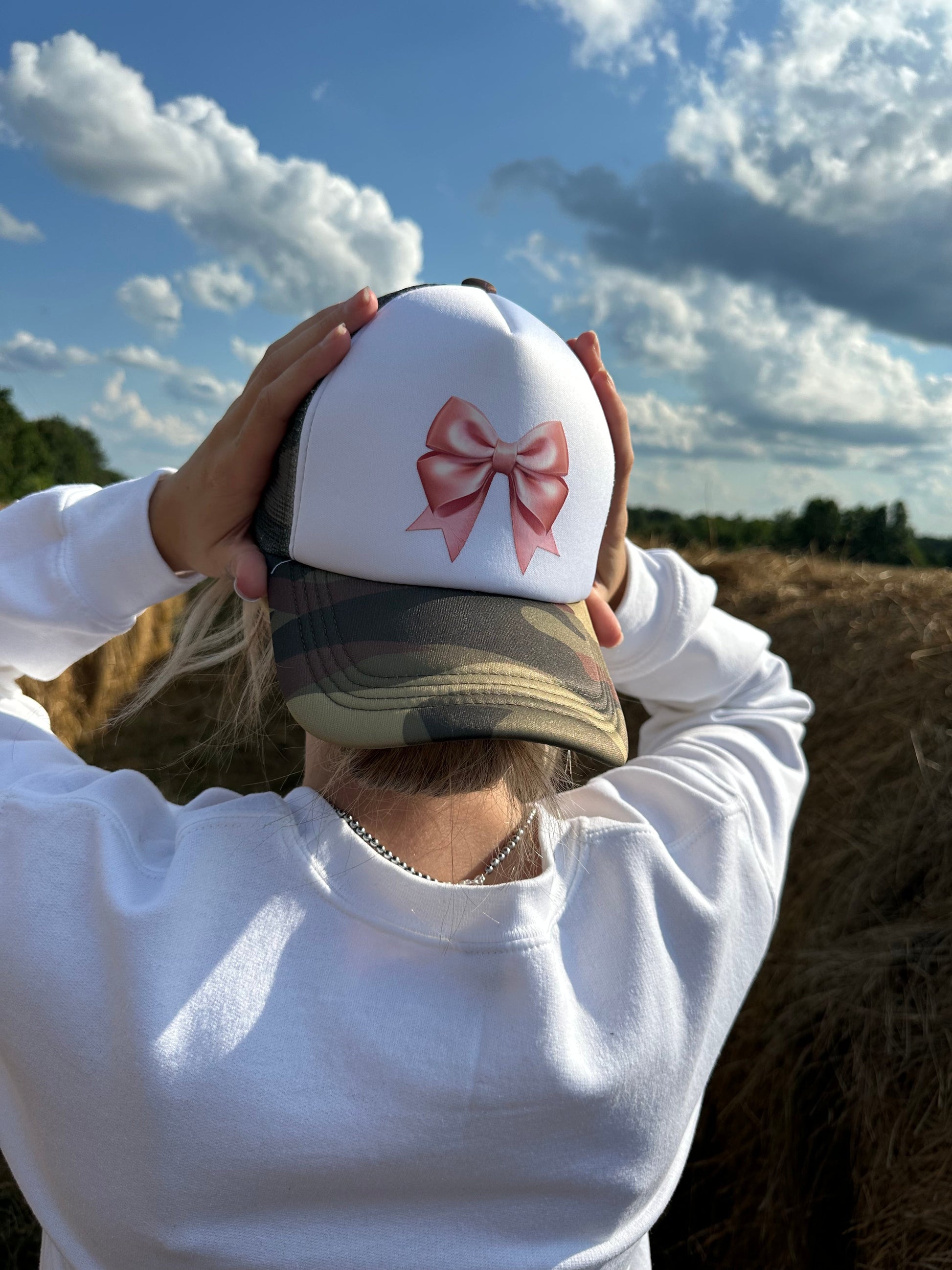 Turn heads with a little country sass in our Bow’d Up camo trucker hat. This western-inspired cap blends rugged style with a girly twist, featuring a bold camo print topped with a sweet pink bow right in the center. The DTF transfer design pops against the earthy tones, making it the perfect statement for hunting season, rodeo nights, or casual days out.