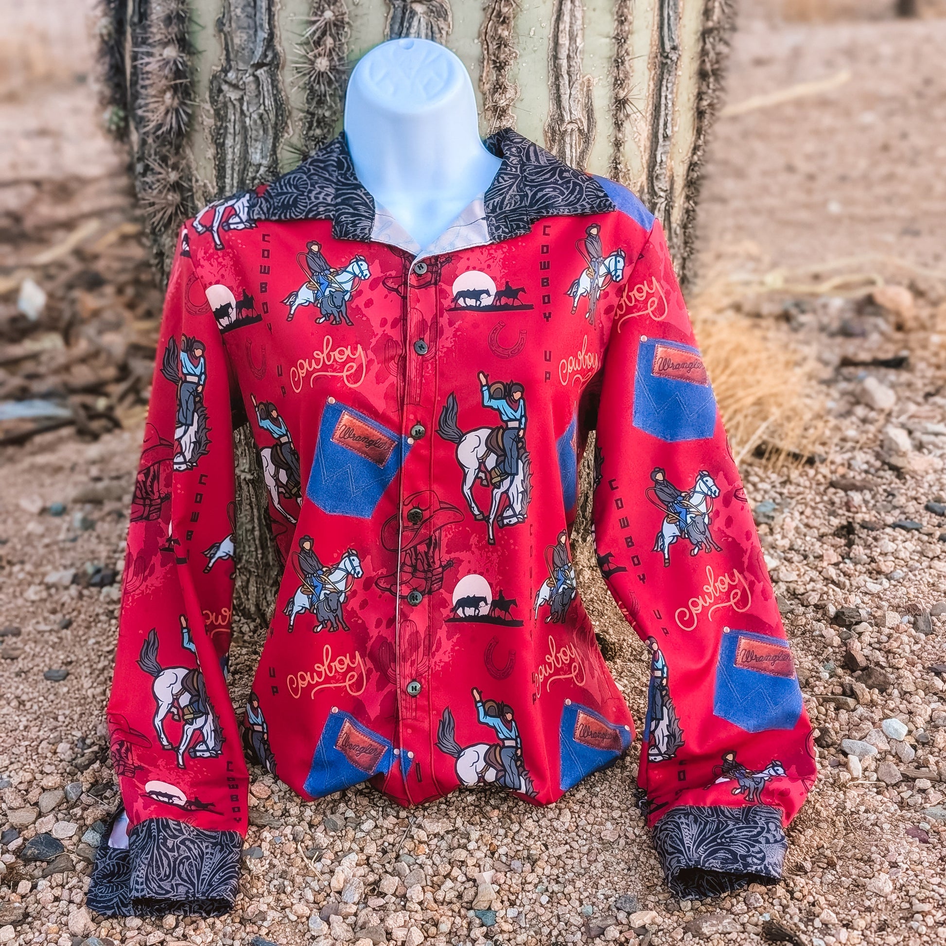 Why are our TGC button downs a must have? Not only are they bold and unique, just like you, but they are also extremely comfortable. They are made out of a lightweight, breathable stretch satin that is comfortable to wear year round and feels like wearing a pajama top. The subtle sheen makes it gorgeous in photos without the fabric looking cheap and shiny. We included extra length in the body so it always stays tucked regardless of your torso length and how far forward you move your arms when pushing your horse home or throwing a rope.