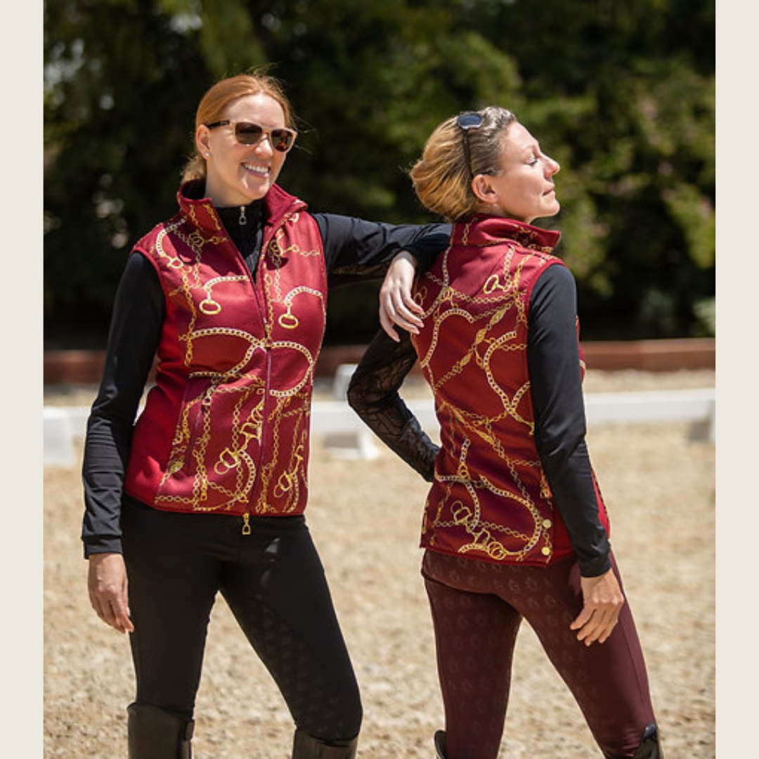 A burgundy colored, fleece-lined chain link print design vest perfect for cooler mornings and evenings, or as an added layer of warmth on more chilly days. Designed with mono-colored side panels for an extra flattering silhouette. Double stirrup zipper down the front and two push buttons on each side in the back for additional comfort when riding. The gold hardware pops against the rich burgundy color and picks up the gold of the classic signature chain-link print.