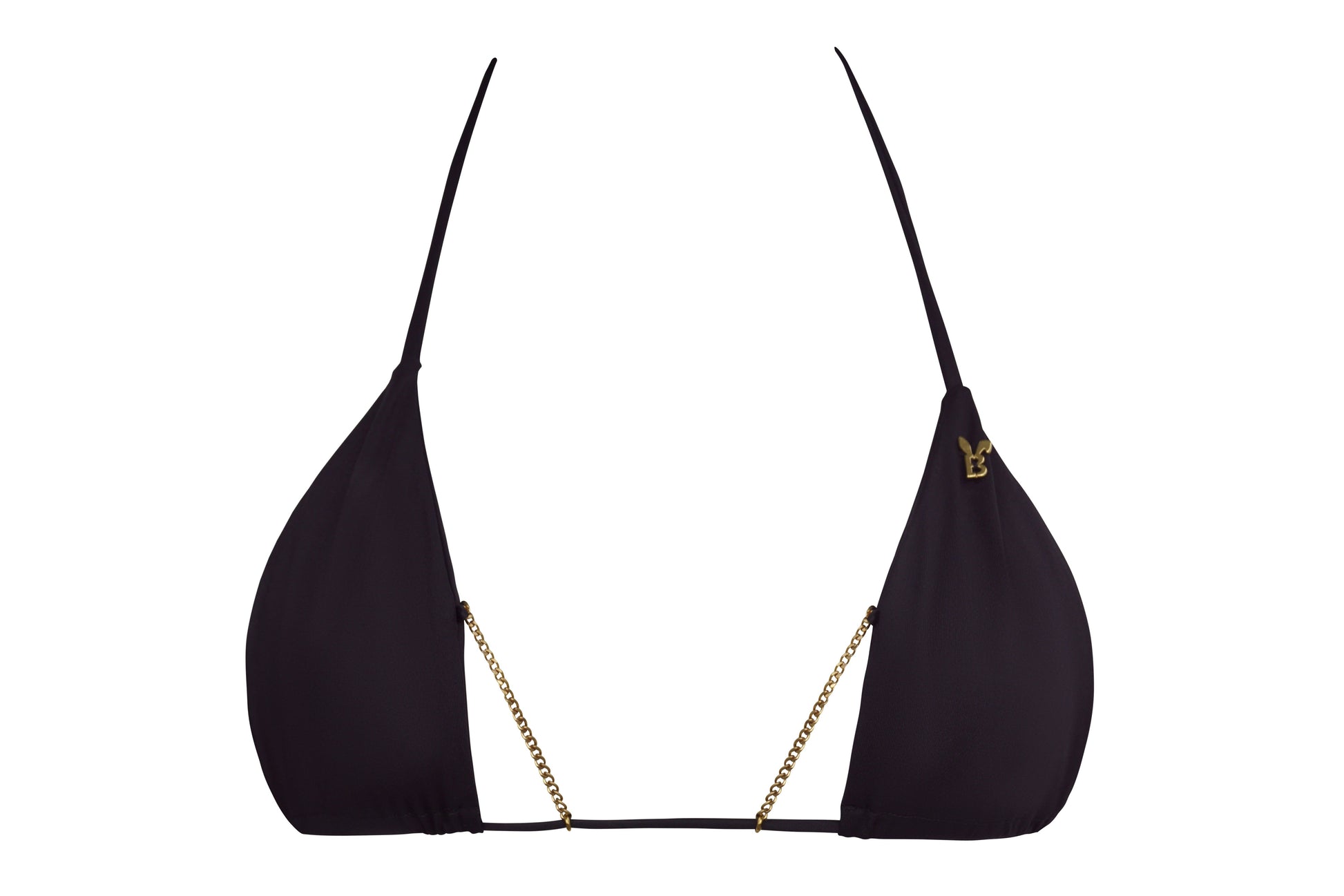 Triangle Bikini Top & Tanga Bottoms in Black with adjustable straps featuring gold chains and Bunnies' Room logo charm in shiny gold.