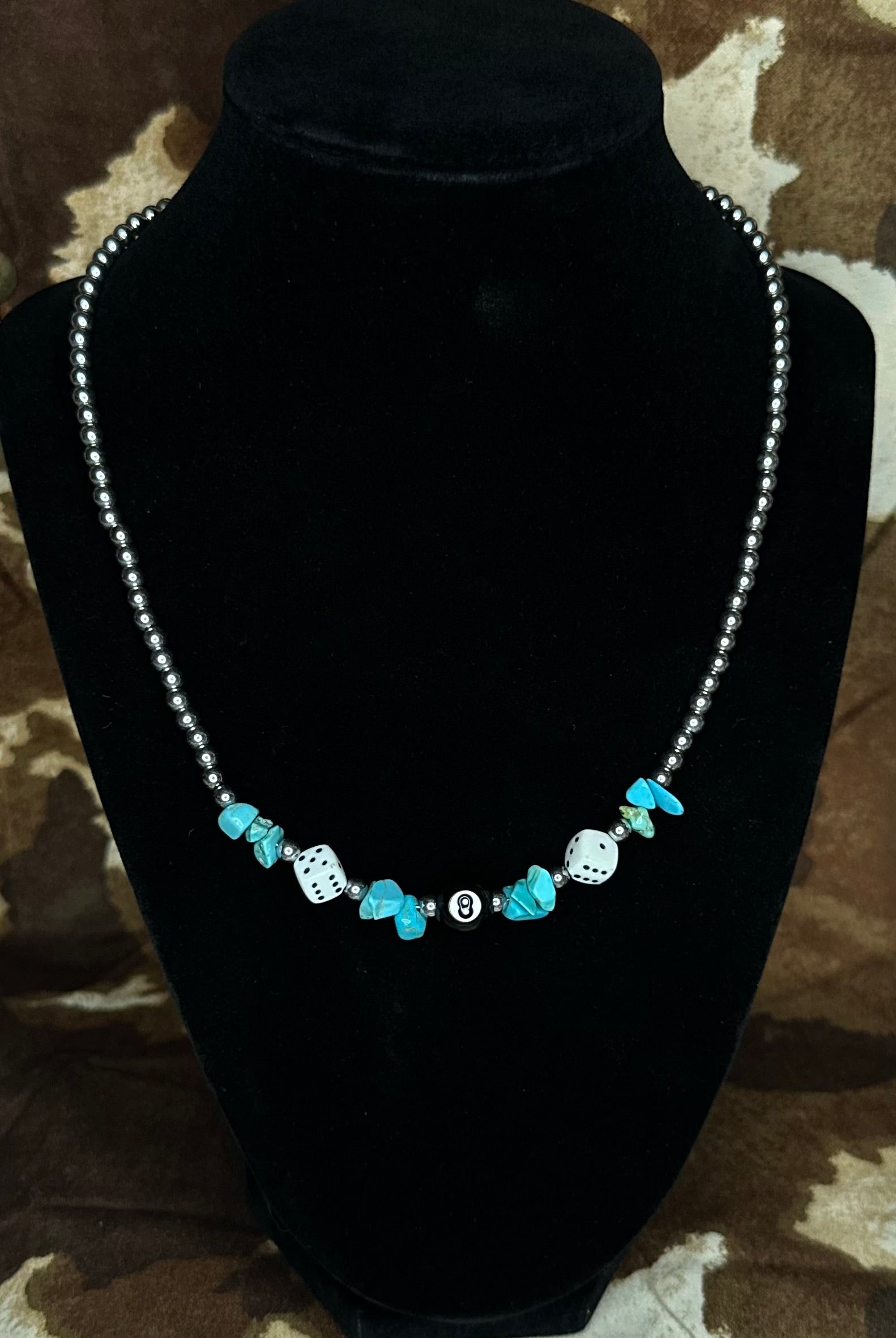 - Handmade with turquoise chip beads, silver spacers, white dice, and an 8 ball centerpiece