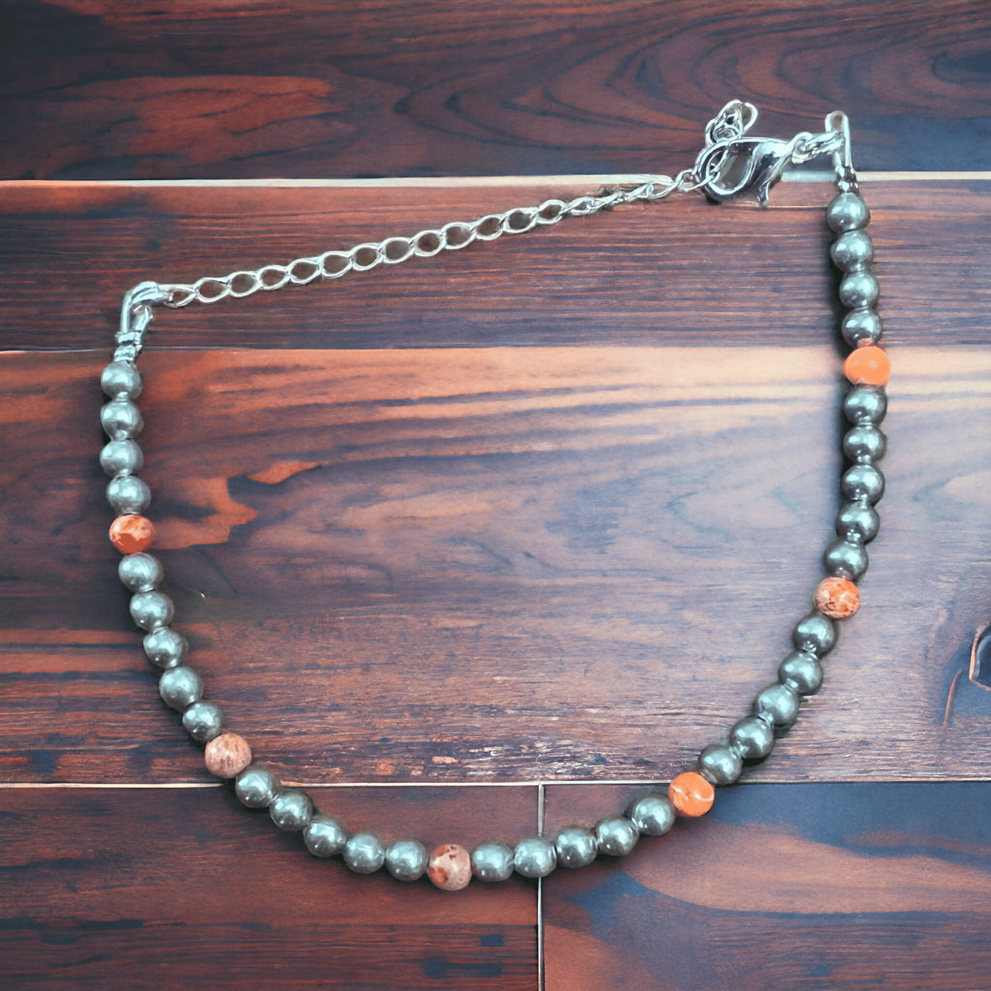 This stunning Sterling Pearl Bracelet features a touch of vibrant orange with 6 inch beads, a 3 inch chain, silver plating, and 4 mm magnesite orange beads. Perfect for adding a pop of color to any outfit!