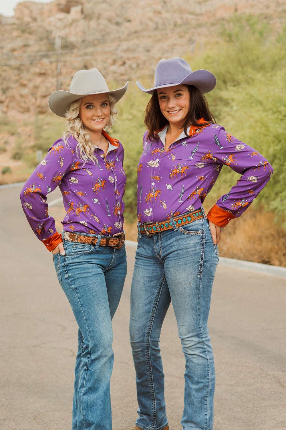 With a purple print that's bolder than a UFO sighting and brown collar and cuffs that say "Howdy, extraterrestrials," you'll be ready for any close encounters in our Give Me Space Button Down. Whether you're wrangling cattle, chasing cans, or navigating the cosmos, this shirt guarantees you'll be the star – cowgirl and space explorer, all in one.