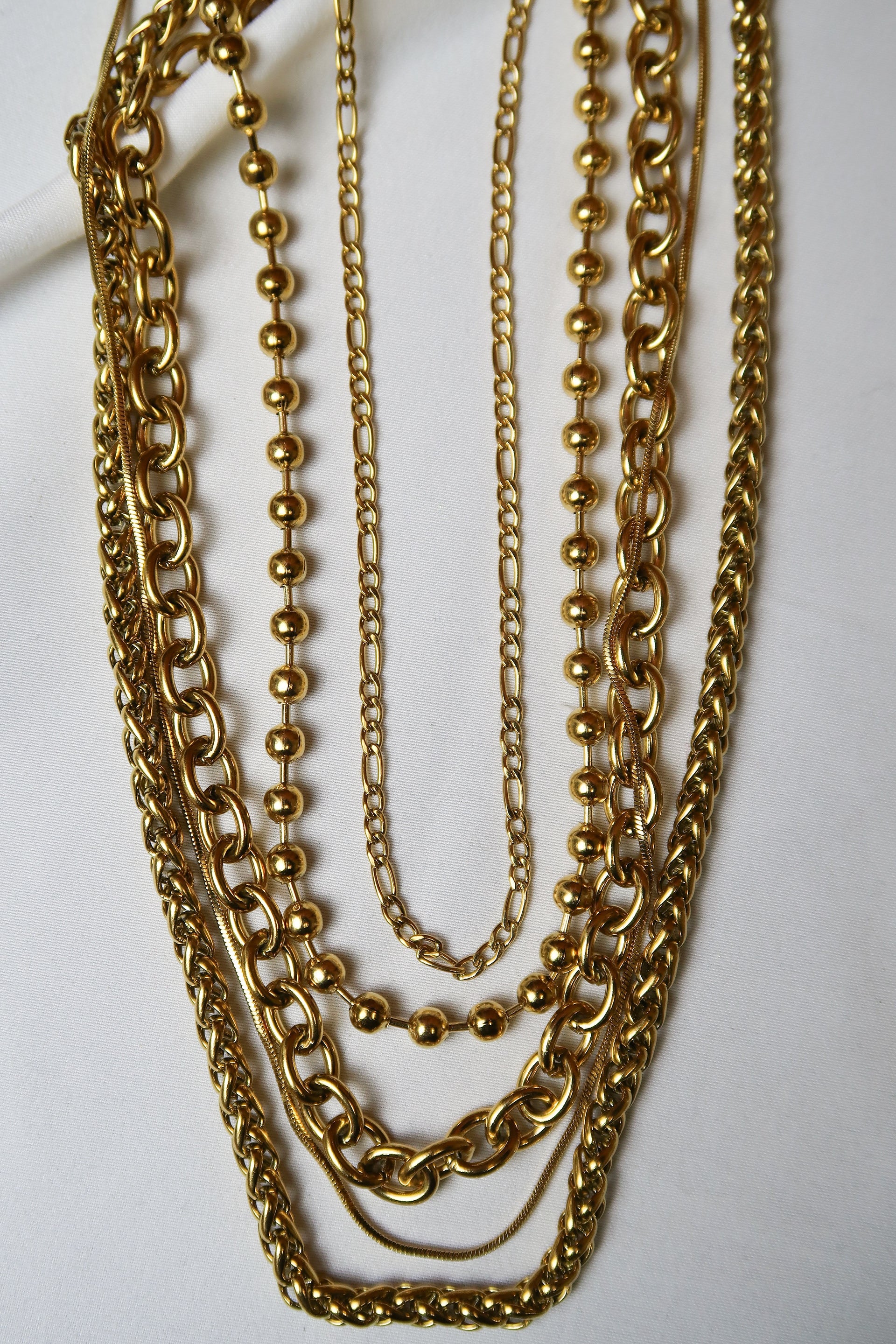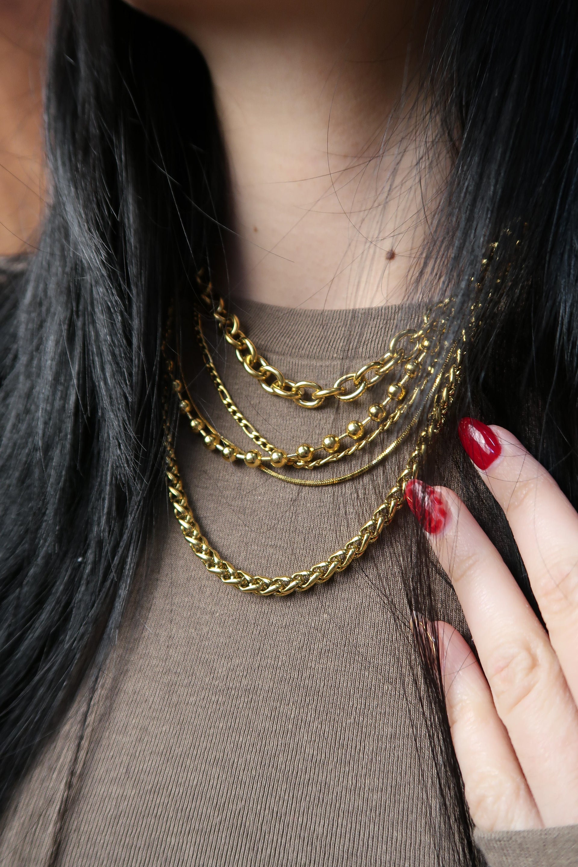 Dress up any outfit with our Golden Muse 5 piece necklace set featuring various style and adjustable stainless steel chains, ranging from 17 to 21 inches, for the perfect layering look. Your new go-to for a touch of elegance and versatility. Shine like a muse!