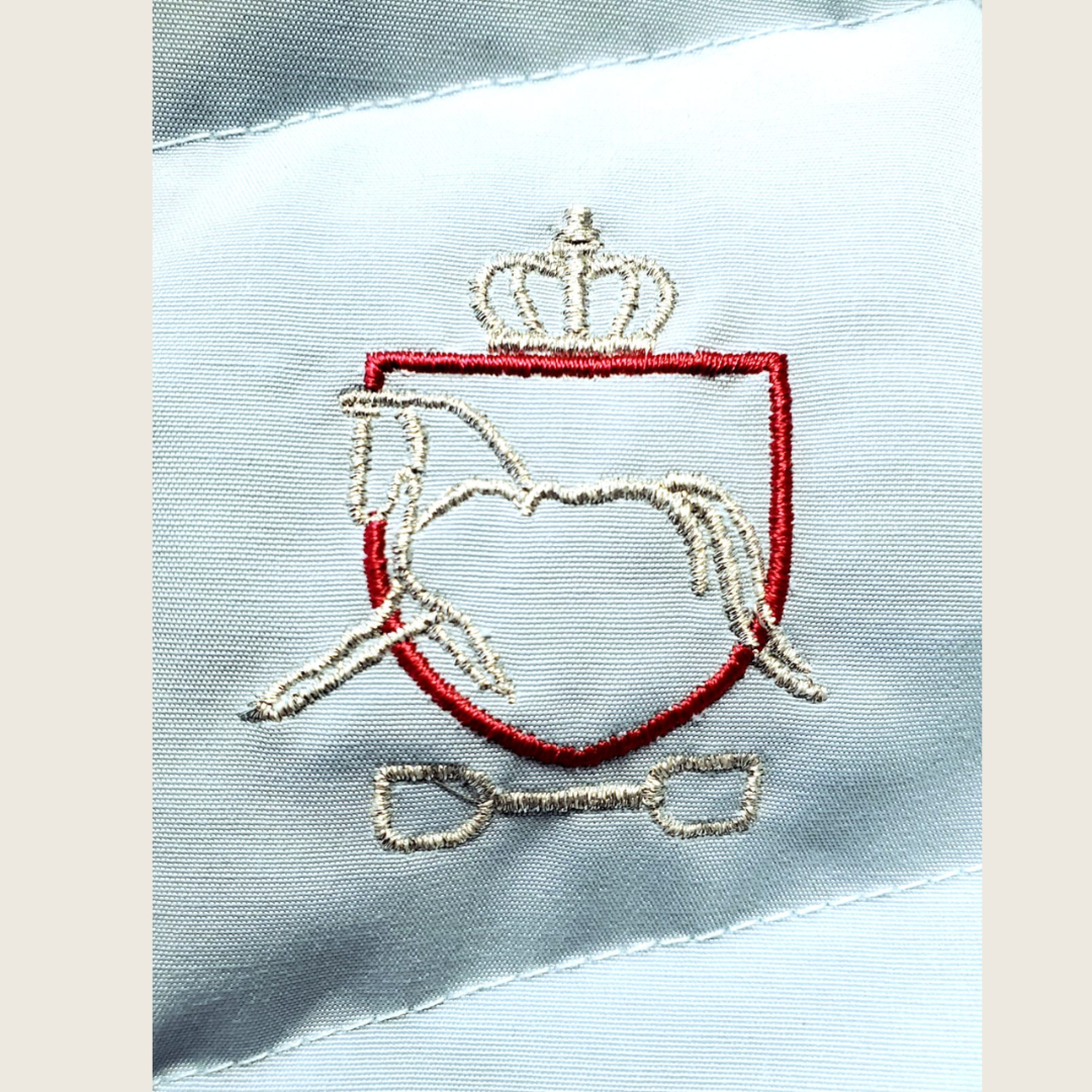 The perfect winter puffer jacket with a plush duck-down filling featuring a detachable hood, dual front paneling, two double stirrup zippers down the front, and a zipper down the back to create a unique and extra-flattering silhouette. The ice blue color is offset by the magenta-laced brand-new chain link pattern design on the inside of the hood and the lining.