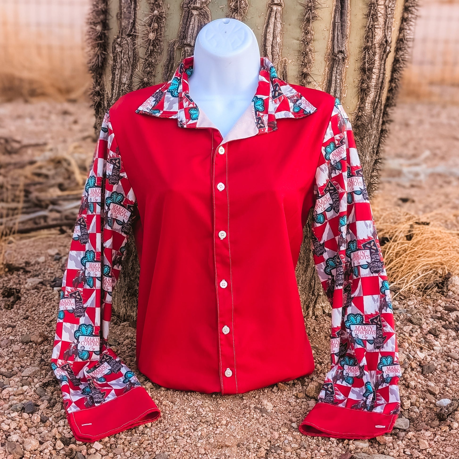 She’s bold, she’s unbothered, and she’s here to cash checks and turn heads. Making Money Moves is in a class of its own. With a fiery red body and sleeves decked out in cowgirl glam graphics (think lipstick, turquoise, and sass), this button-down is for the go-getters, the game-changers, and the girls who know exactly what they want and aren’t afraid to ride straight toward it. Whether you're chasing cans or chasing goals, this shirt brings the heat and the hustle. This button down is proof that cowgirls can look cute, win big, and handle business.