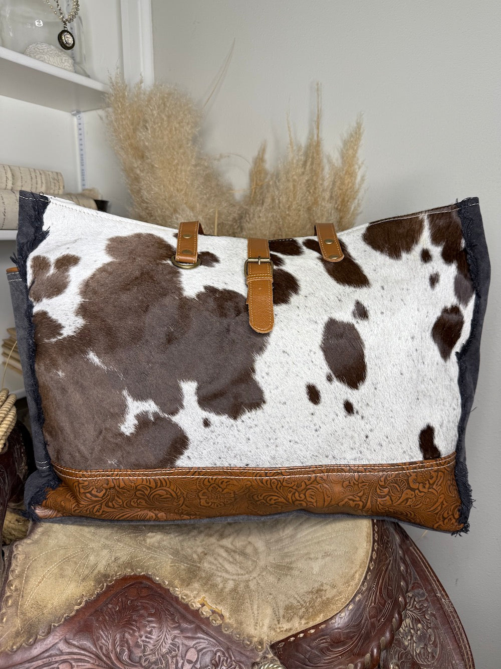 This designer tote bag from Myra has everything you need for your casual adventures with its spacious interior and chic cowgirl style. The bag is made with charcoal-colored upcycled canvas for a versatile western look that can match any outfit. The front features a unique black and white hair on cowhide leather pattern. It is accented with a strip of artisanal brown leather at the bottom and small fringes on the sides. With an added water bottle compartment, back zippered pocket and a belt top closure, this hairon leather bag is a perfect accessory for you.