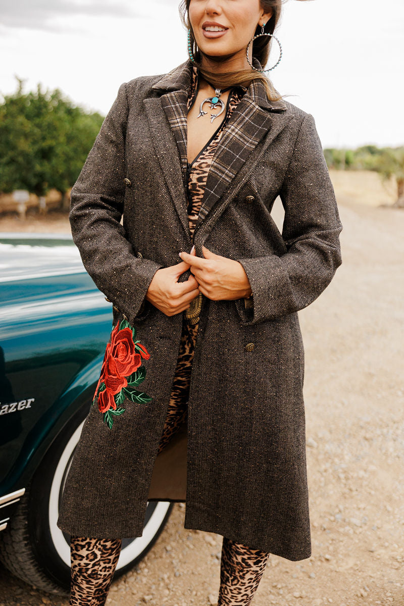 Wrap yourself in Western elegance with the Mrs. Marvel Coat—a long wool beauty that drapes past the knee and blooms with bold red roses by the pocket. Finished with a luxe, removable fur collar, it’s the perfect mix of vintage romance and modern cowgirl spirit. Wear it your way and make every entrance unforgettable.