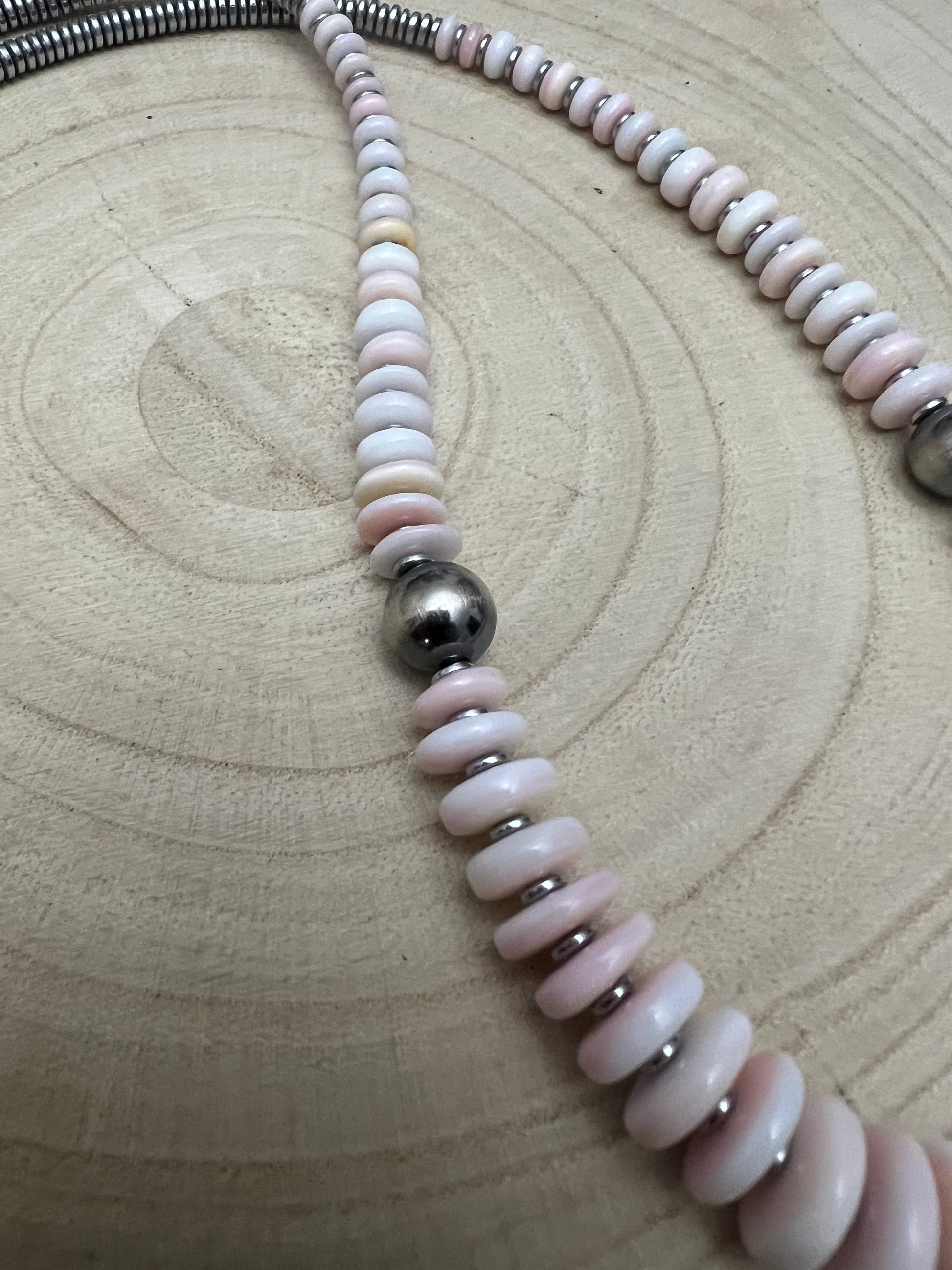 This rare gem quality soft pink conch necklace is handcrafted with love in North Texas. This 23-inch necklace features graduated pink conch beads paired with hematite saucers and finished with 10mm sterling silver pearls and a non-tarnish sterling hook. Every necklace is one of a kind—each bead varies slightly in shape and color, making yours completely unique.