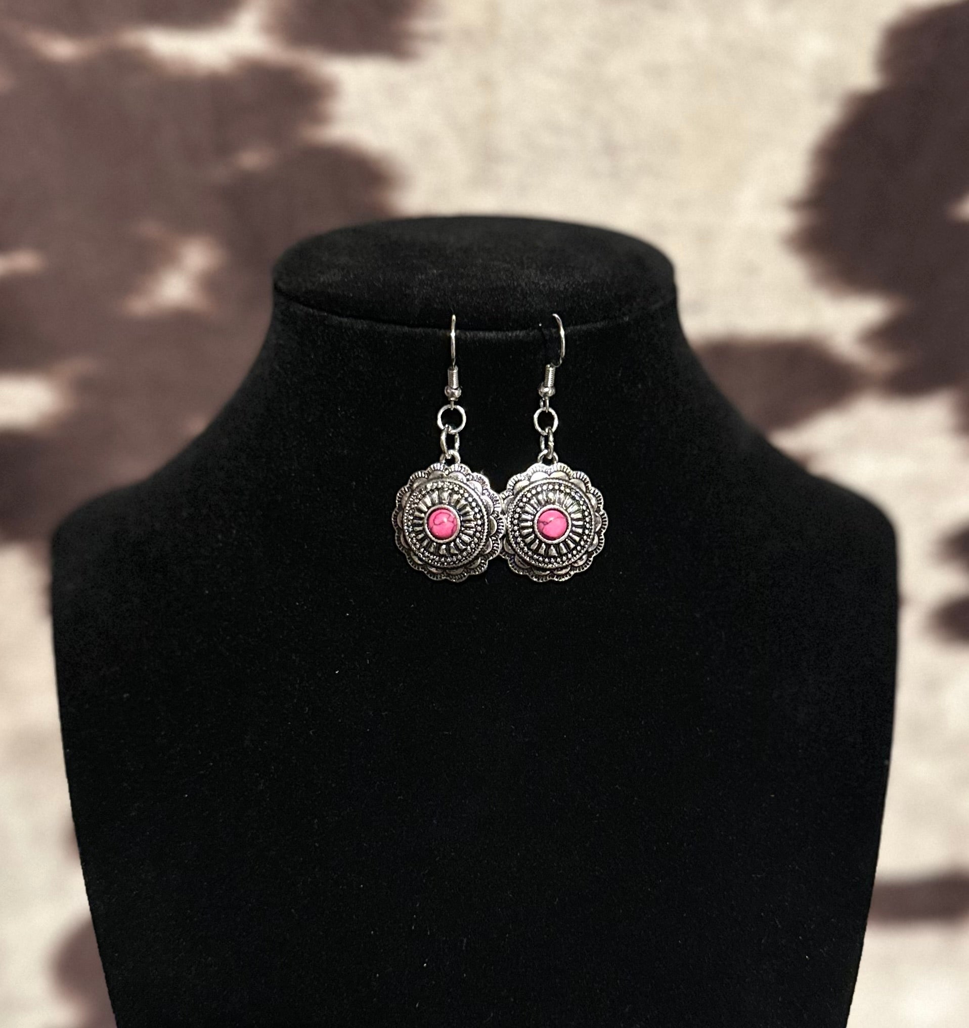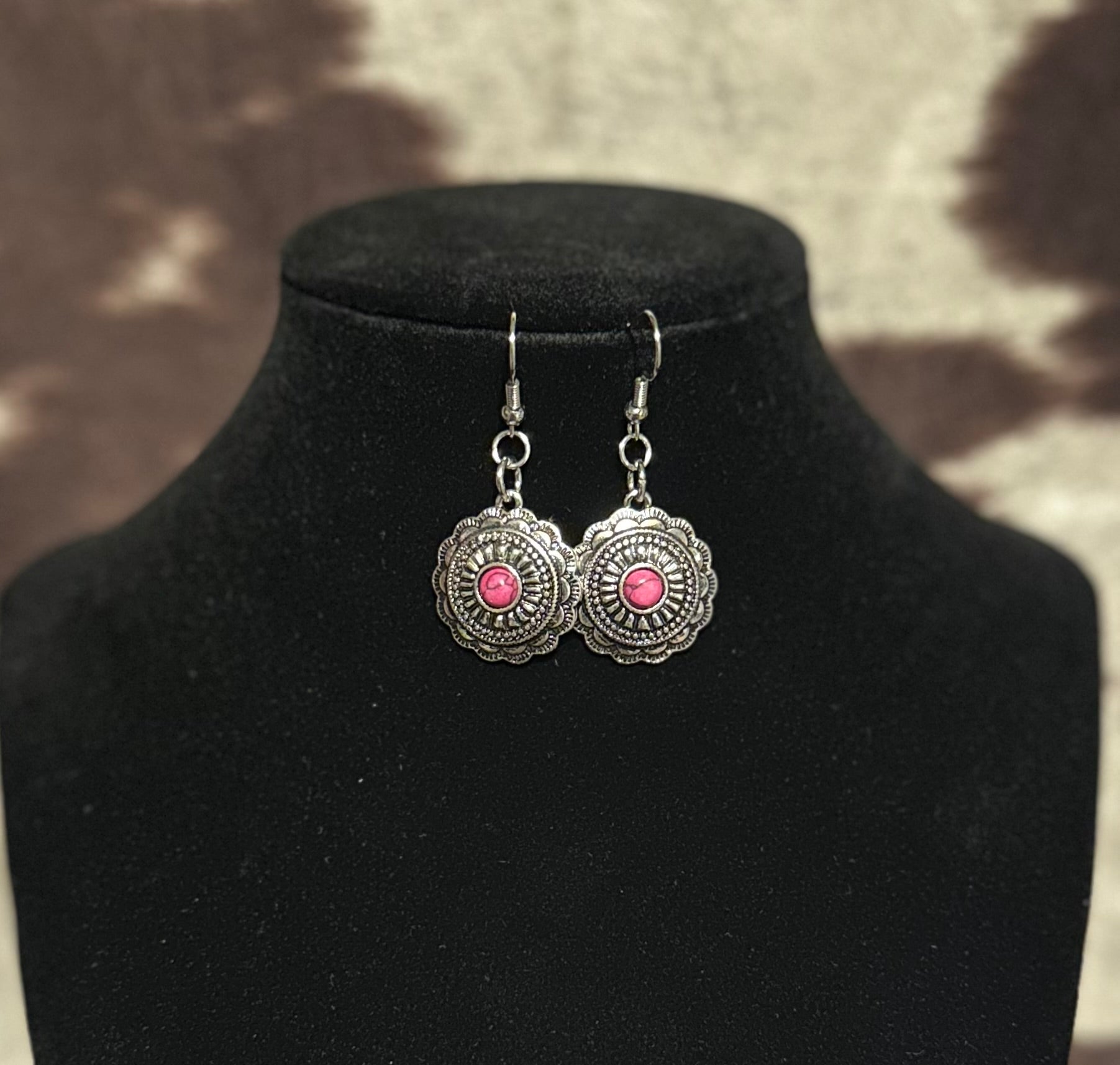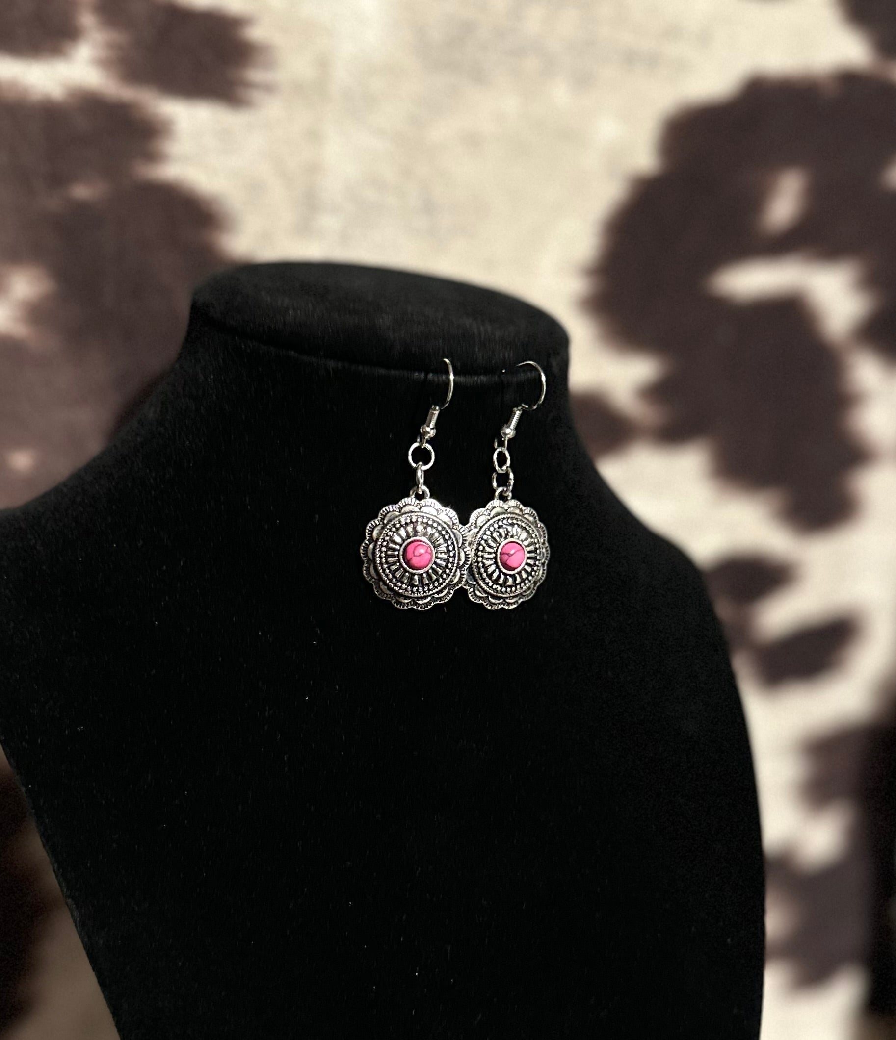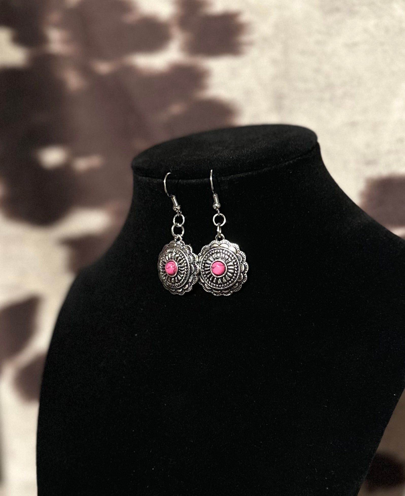 Soft, sweet, and a little bit western—our Pink Prairie earrings are the perfect blend of feminine charm and cowgirl flair. Designed with a faux pink turquoise center and a silver conch shell setting, these lightweight dangles add just the right amount of rustic sparkle to any look. Dress them up or wear them with boots and denim—they’re made to go wherever your wild heart leads.