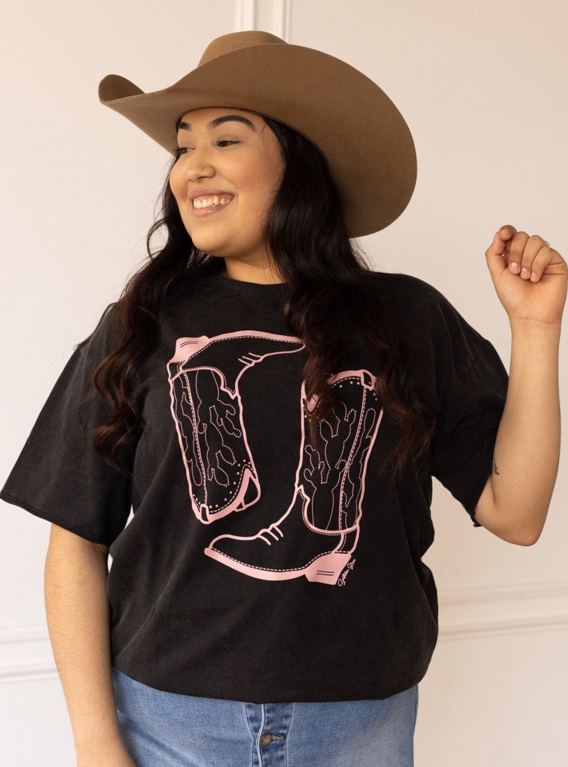 This graphic tee is a stylish homage to the iconic footwear of the Wild West. Perfect for adding a pop of color and Western flair to your outfit, this tee is sure to become a favorite for casual days and country adventures alike. Embrace your love for Western fashion and strut your cowgirl style with confidence.
