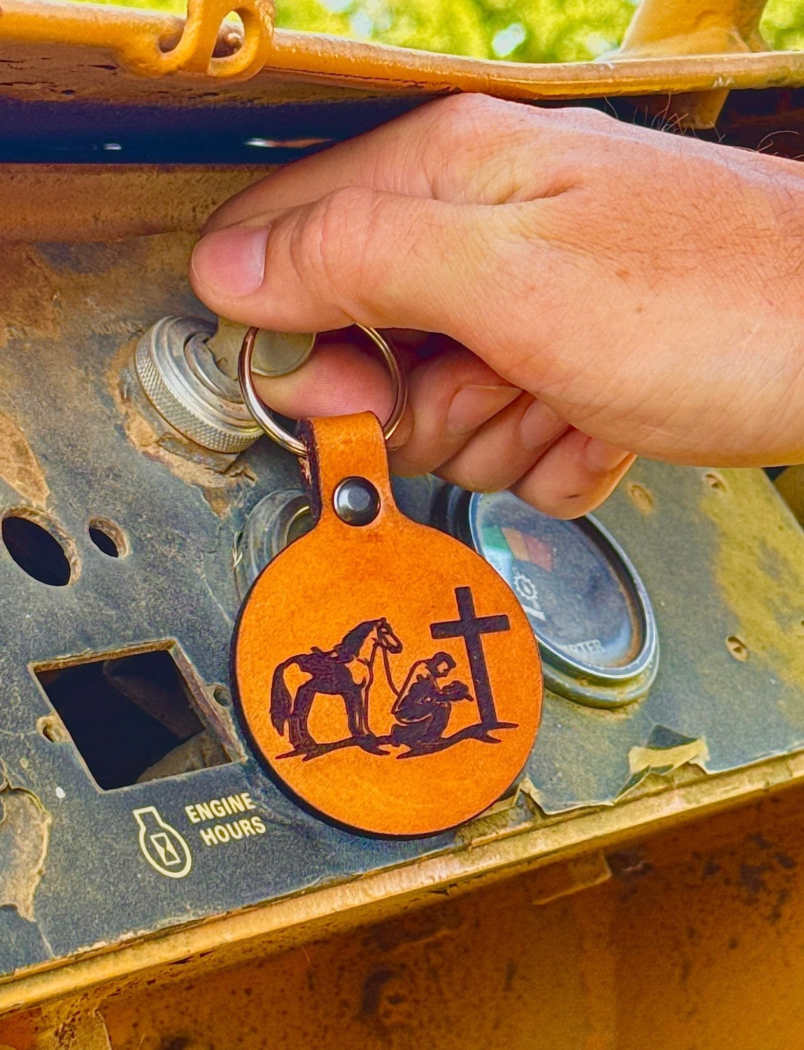 Pray in style with our Praying Cowboy Leather Keychain, handcrafted from genuine leather. This durable and high-quality keychain is the perfect accessory for your keys, adding a touch of western charm to your everyday essentials.