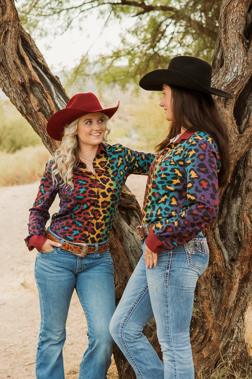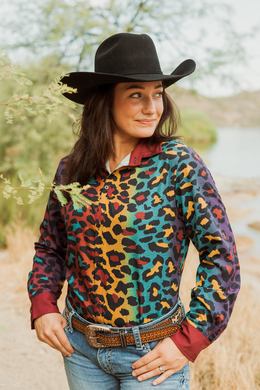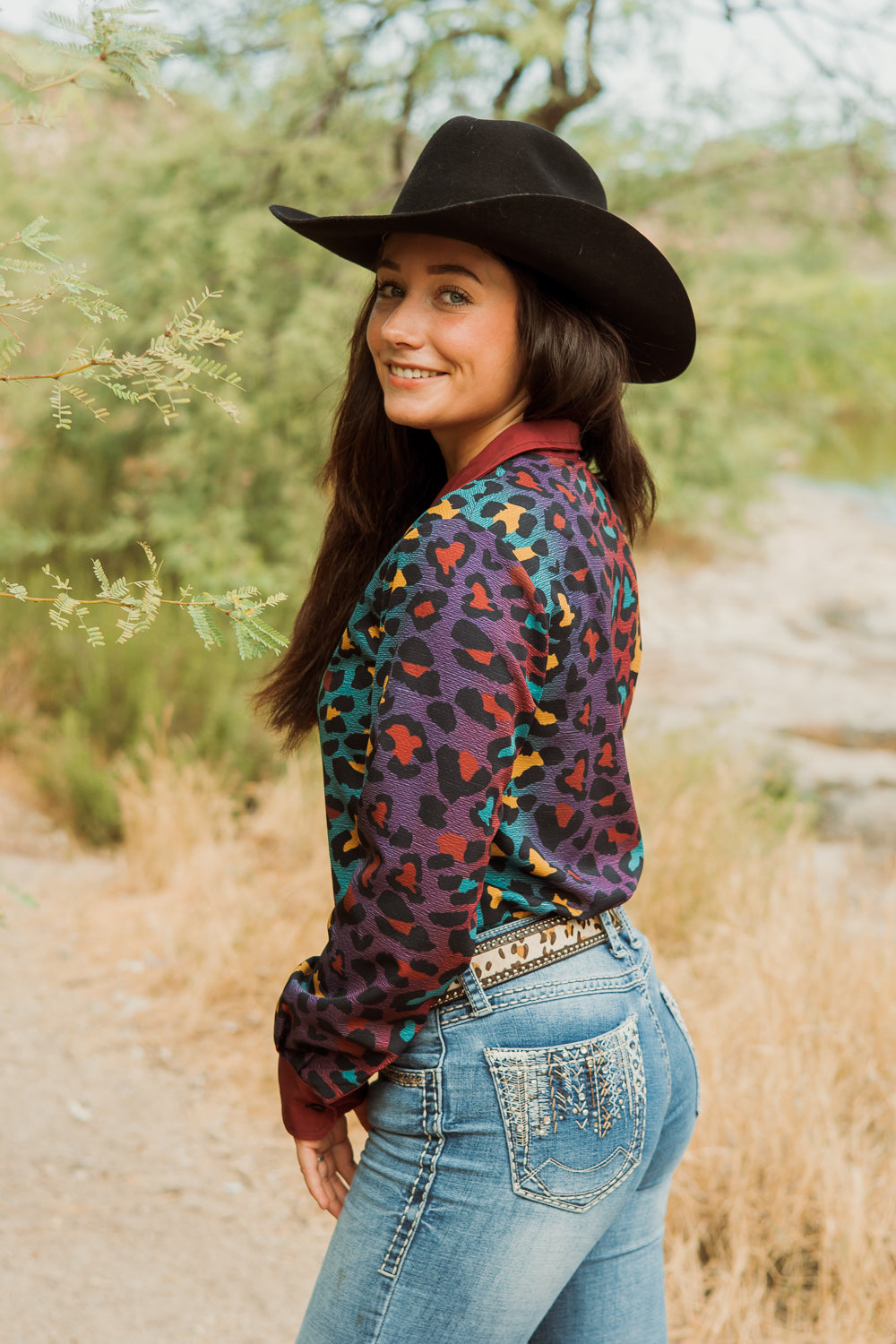 Our Prowling For Pinot Button Down is the ultimate fusion of cowgirl sass and fall finesse. It features a stunning ombre cheetah print, transitioning so beautifully through rich teal, regal purple, deep maroon, and zesty mustard yellow that it makes the changing leaves jealous. Embrace the autumn spirit while riding those extra spicy horses as the temps cool.