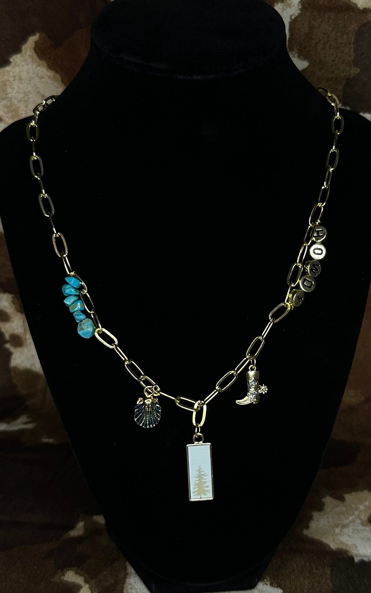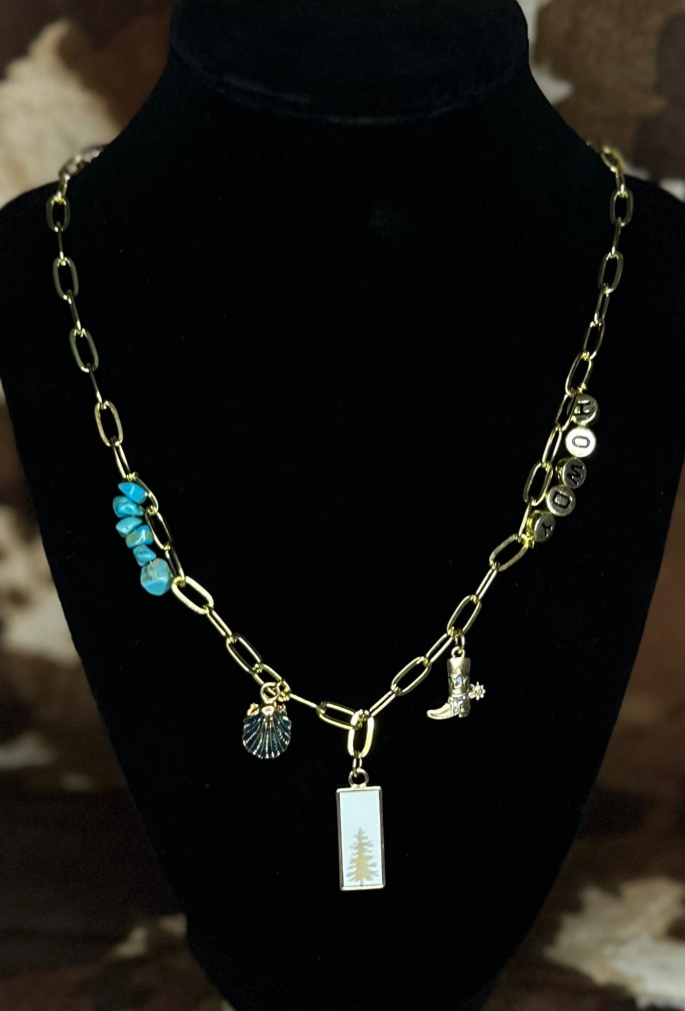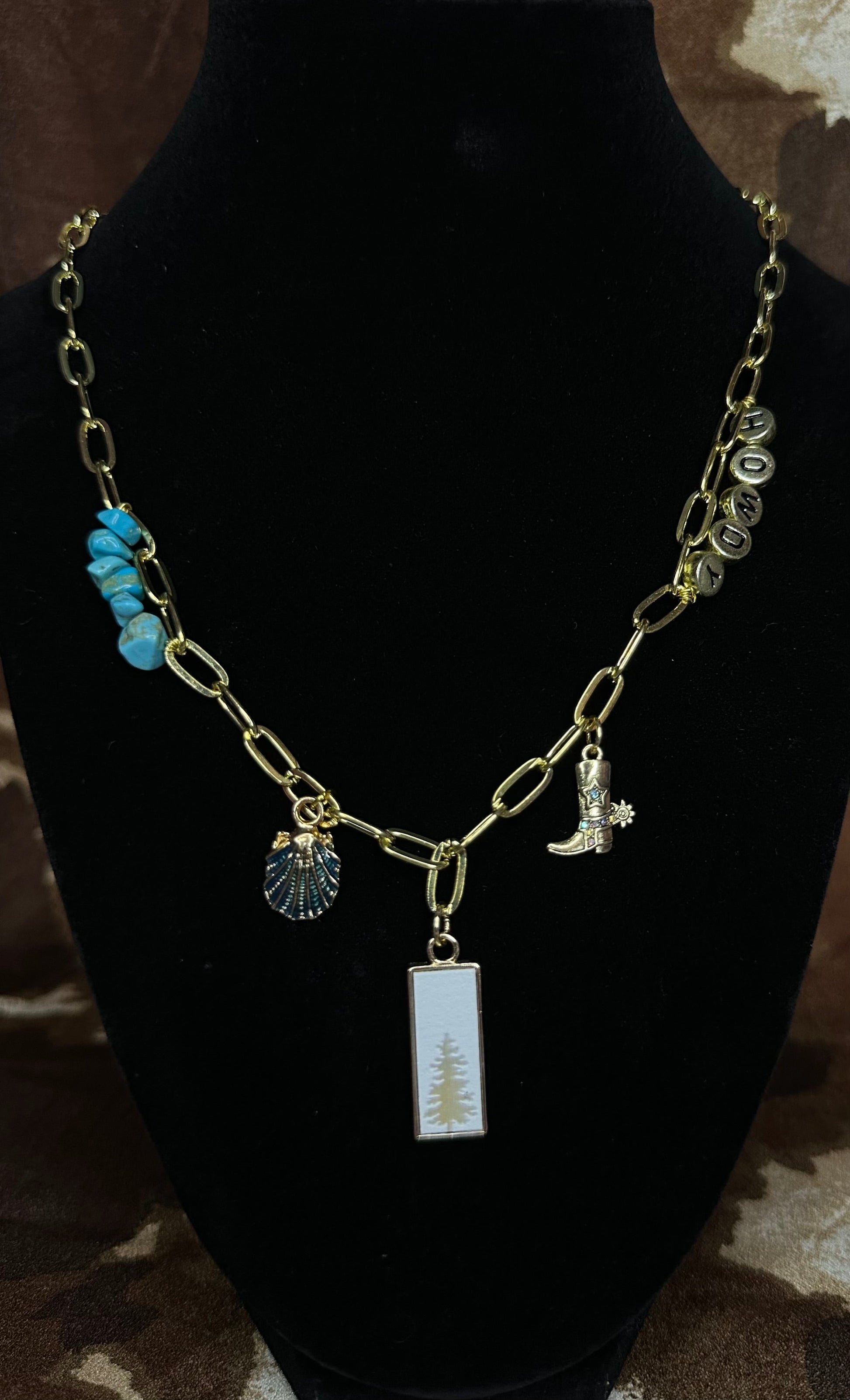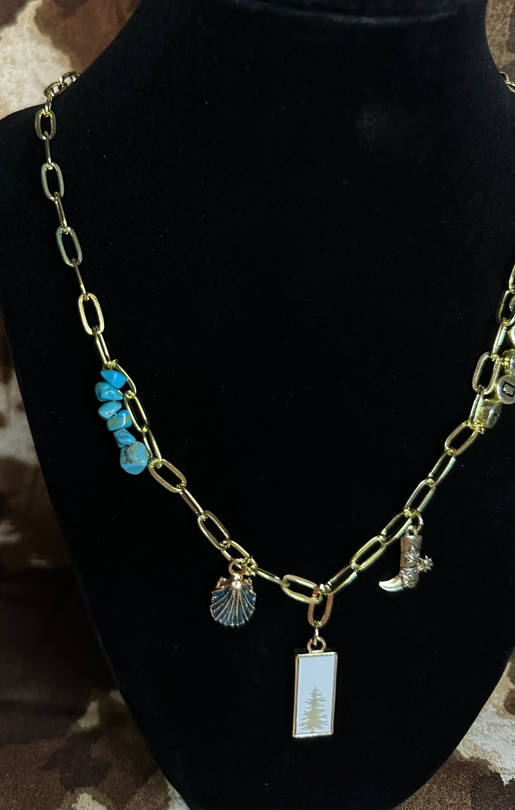 • Charms: blue shell, gold cowboy boot, tree centerpiece