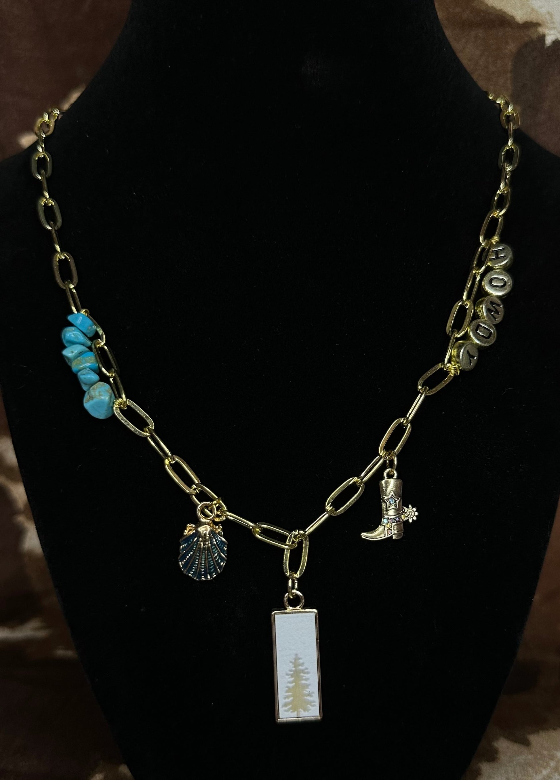 Ground your style with a touch of Western heart and natural beauty. The Rooted Rodeo necklace features a sleek silver paperclip chain adorned on one side with wire-wrapped turquoise stone beads and on the other with “HOWDY” letter beads—both sides balanced with delicate charms: a blue shell, a gold cowboy boot, and a striking tree centerpiece symbolizing strength and roots.