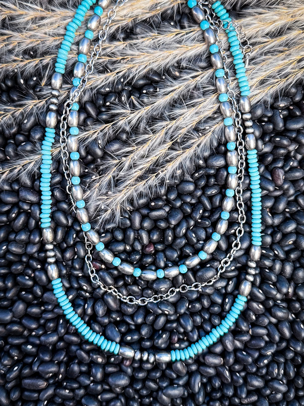 The layered design showcases the rich textures and shimmering pearls alongside sleek chains and turquoise beads, offering versatility for any occasion. Perfect for adding depth to your ensemble, this necklace can be worn alone for a subtle statement or layered with other pieces for a more dramatic effect.