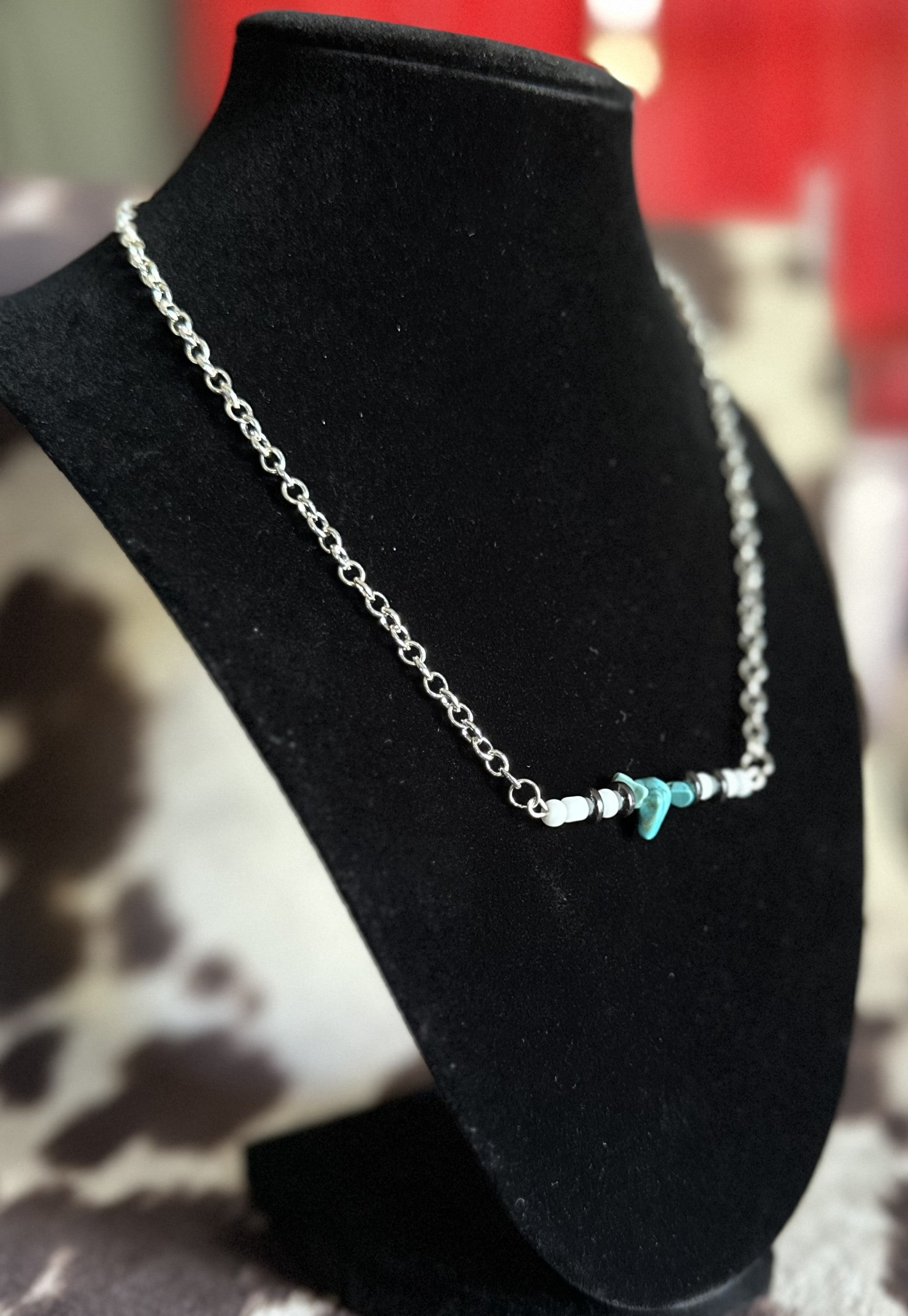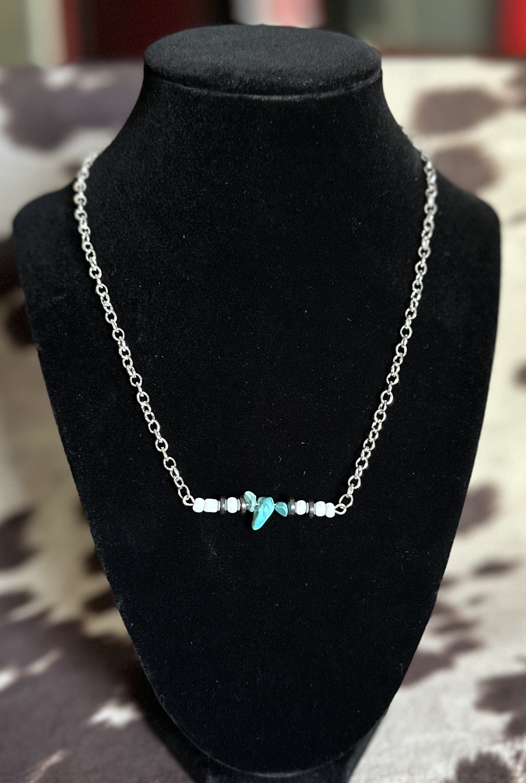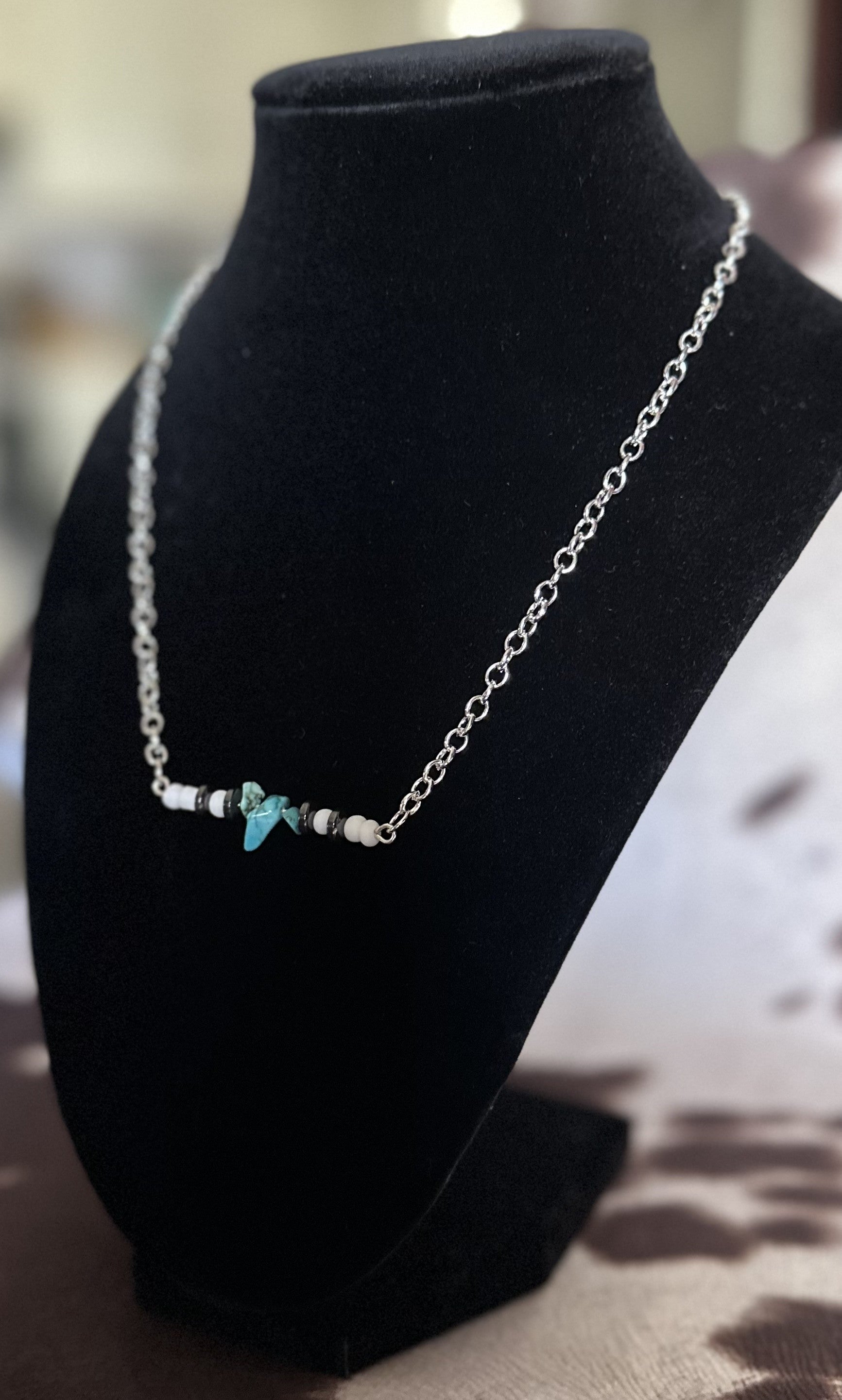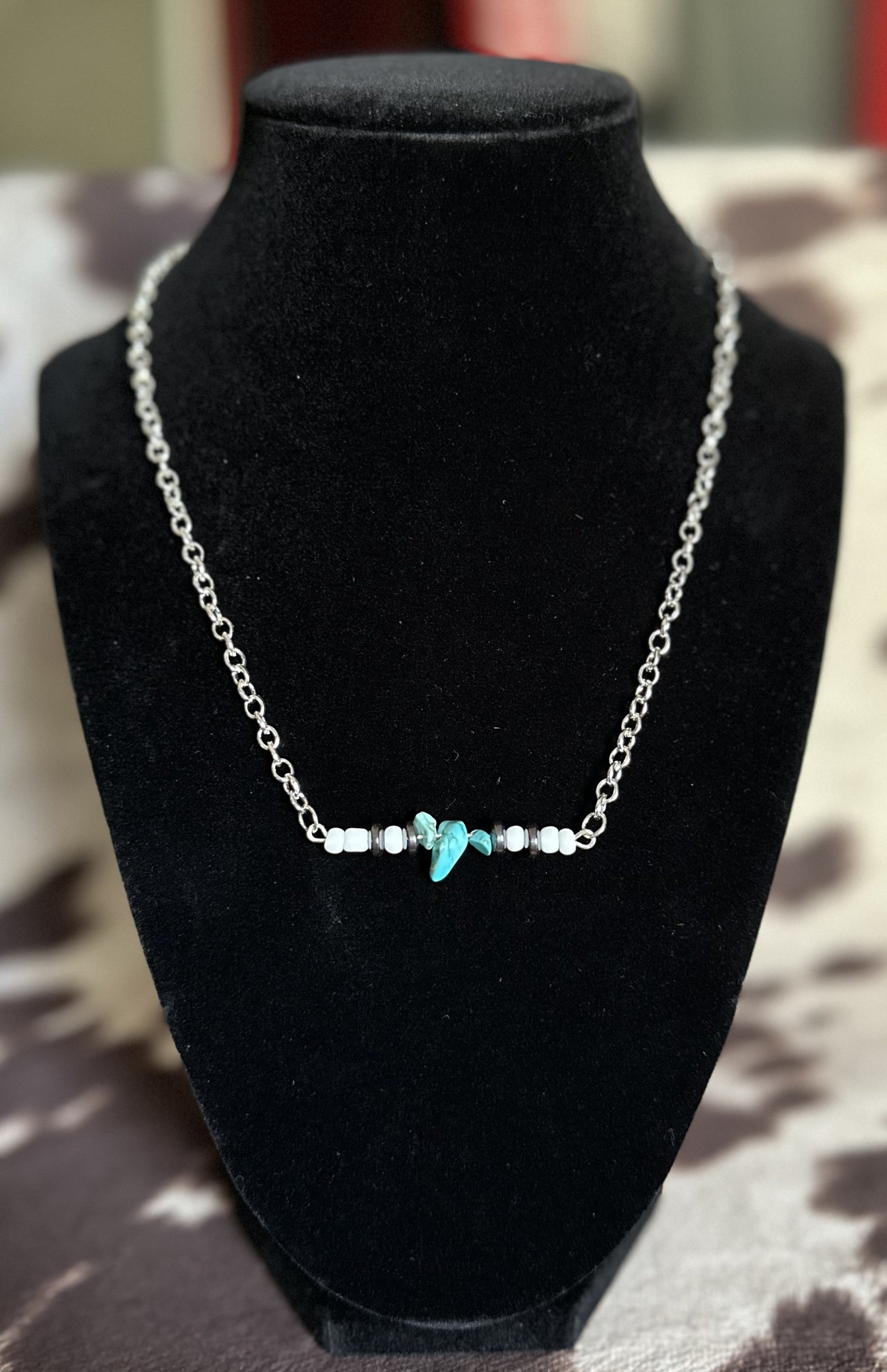 • Handmade with a genuine turquoise bar, white beads, and silver accents