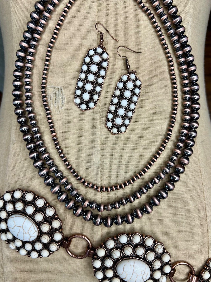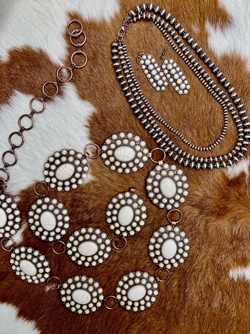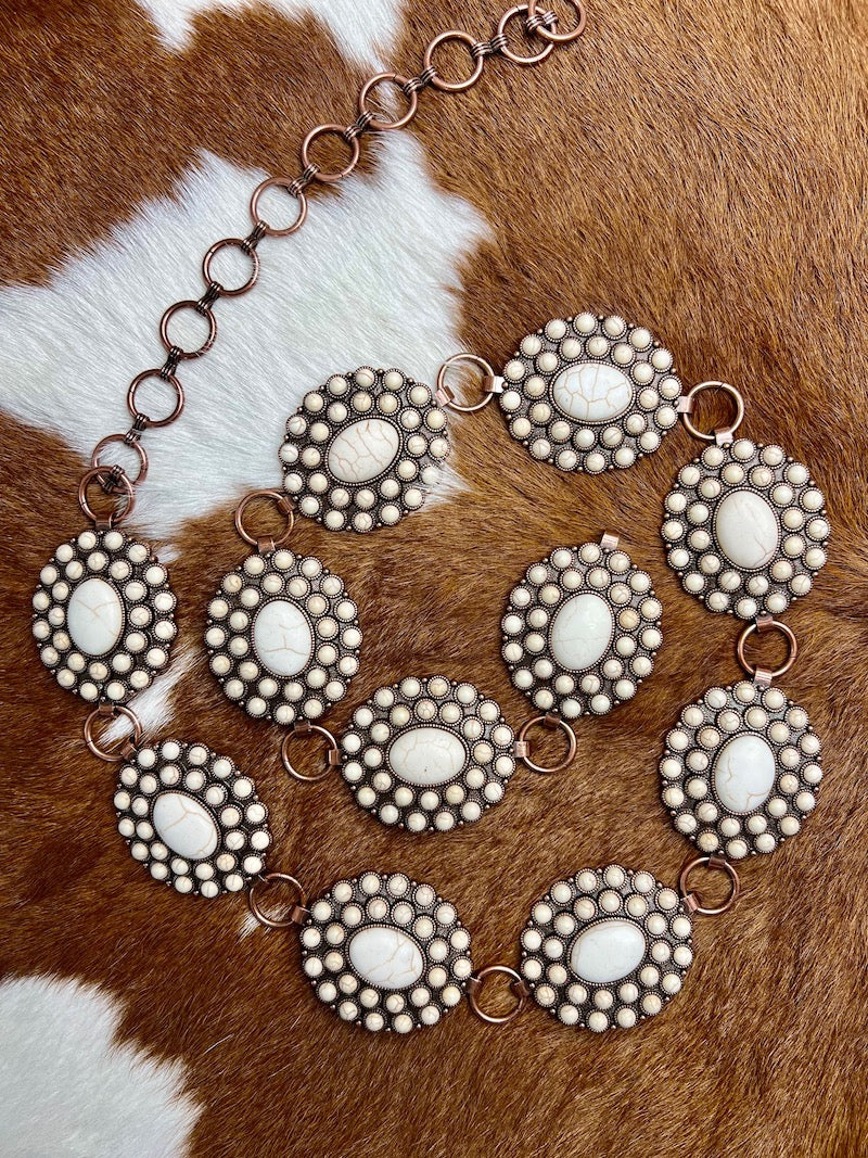Chain belt of large conchos, each measuring 2" x 2.5". Belt comes in two sizes - sm/med and lg/xl. Burnished copper finish with faux white turquoise stones.
