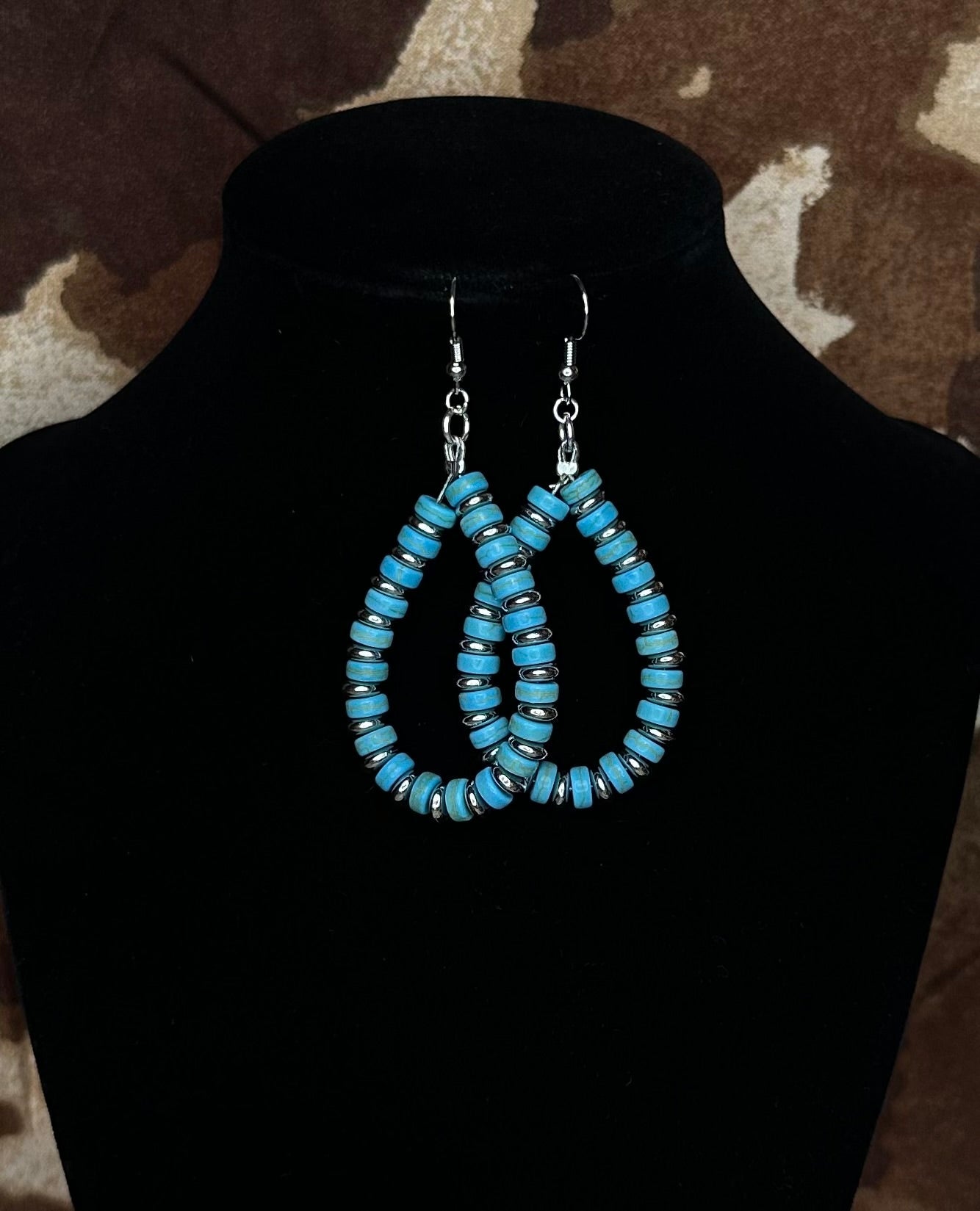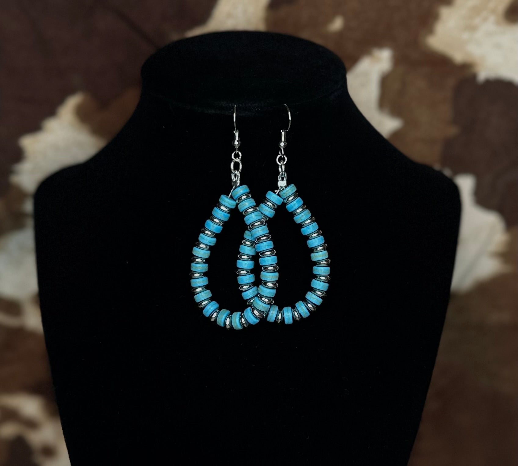 The Sierra Drops bring western elegance to everyday style. These handmade teardrop earrings feature striking turquoise saucer beads paired with silver spacer beads, all set on classic hooks for easy, comfortable wear. Lightweight yet eye-catching, they capture the spirit of open skies and rugged mountain trails—perfect for adding a touch of rustic charm to any outfit.