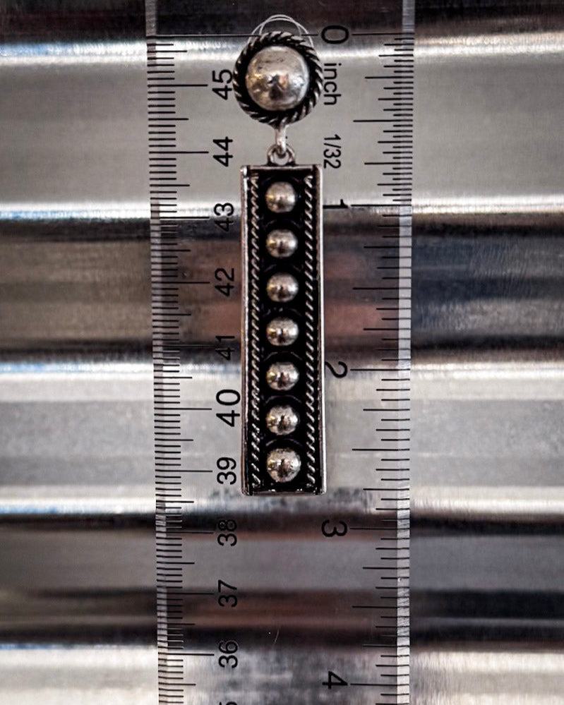 These earrings feature a lightweight metal construction with a distressed silver finish that looks like it’s been loved a little—giving them that worn-in, authentic vibe we all love from true western pieces. The long, rectangular bars are framed in a twisted rope detail, filled with raised bubble-style accents that catch the light with every move. At the top, a round concho-style stud anchors the design, creating a seamless balance between bold and wearable.