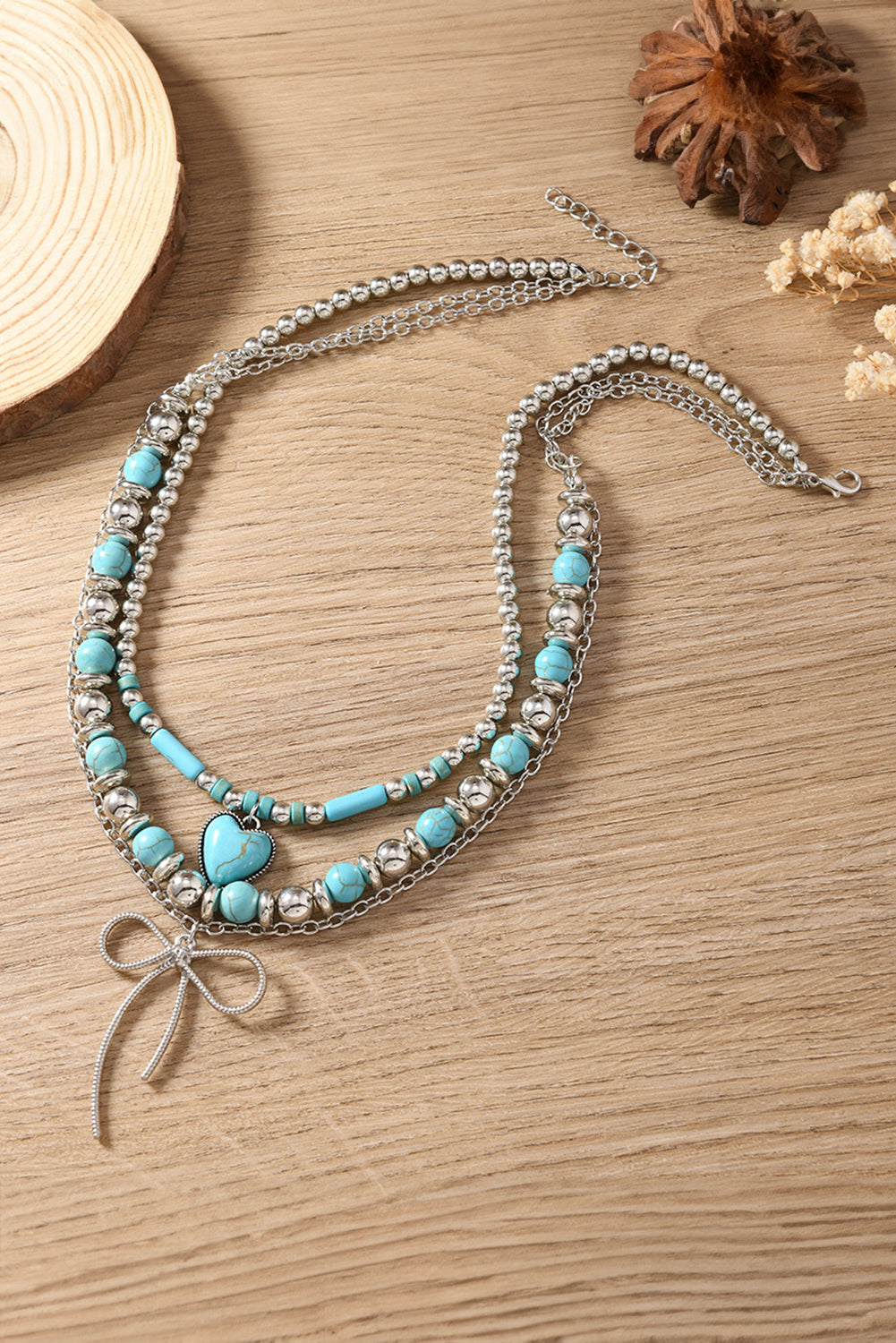 Silvery Bow and Heart Pendants Turquoise Beaded Multi-layered Necklace