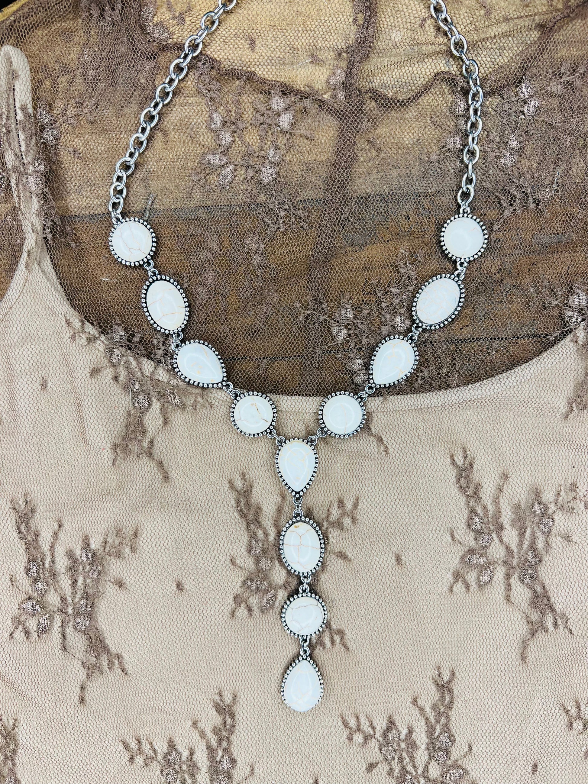 This exquisite Sonora necklace exudes a western chic style with its faux silver and white turquoise design. The 18" necklace, featuring a 4" concho drop, includes a 3" extender for a customizable fit. Elevate any outfit with this stunning piece of jewelry.