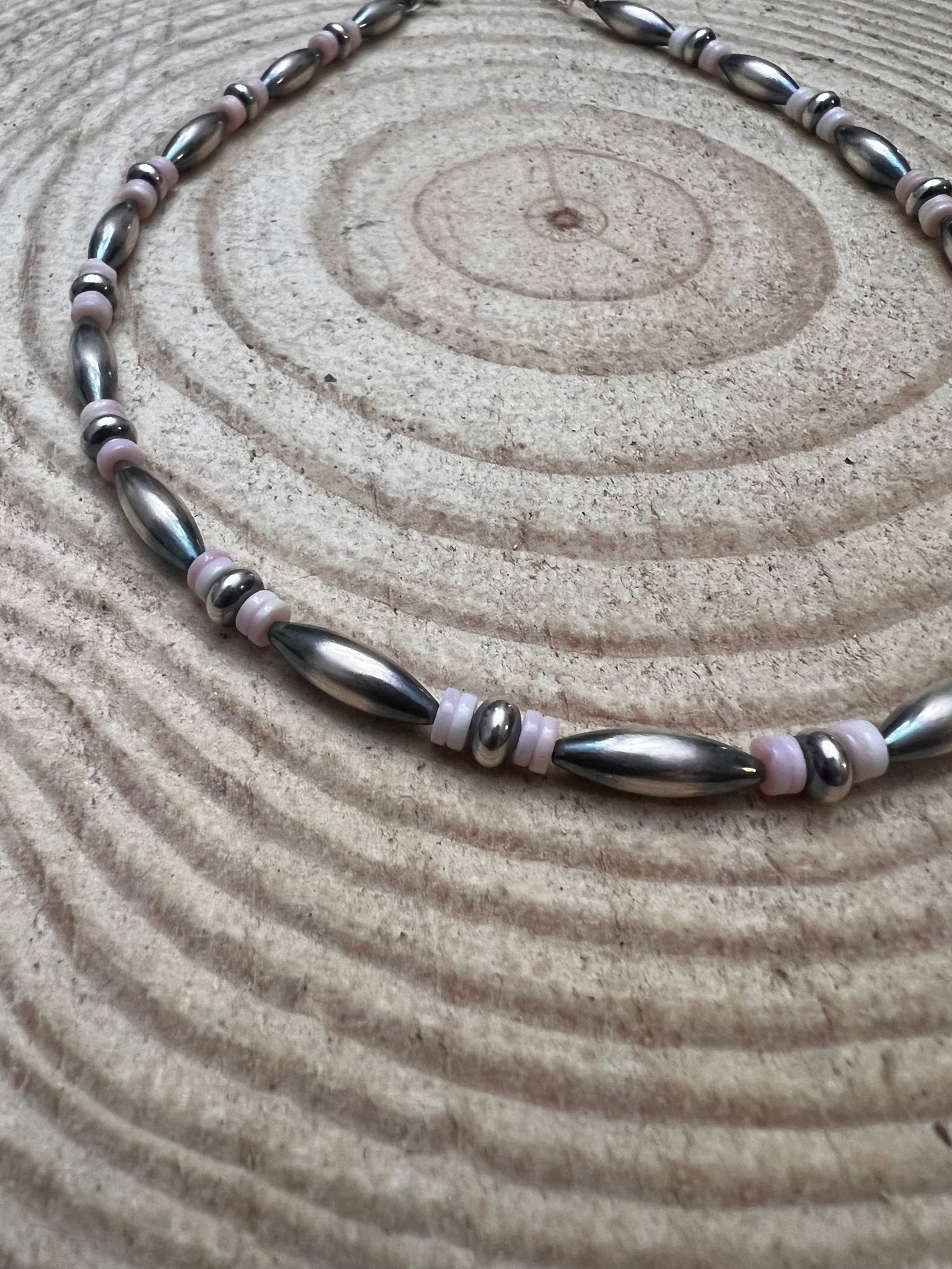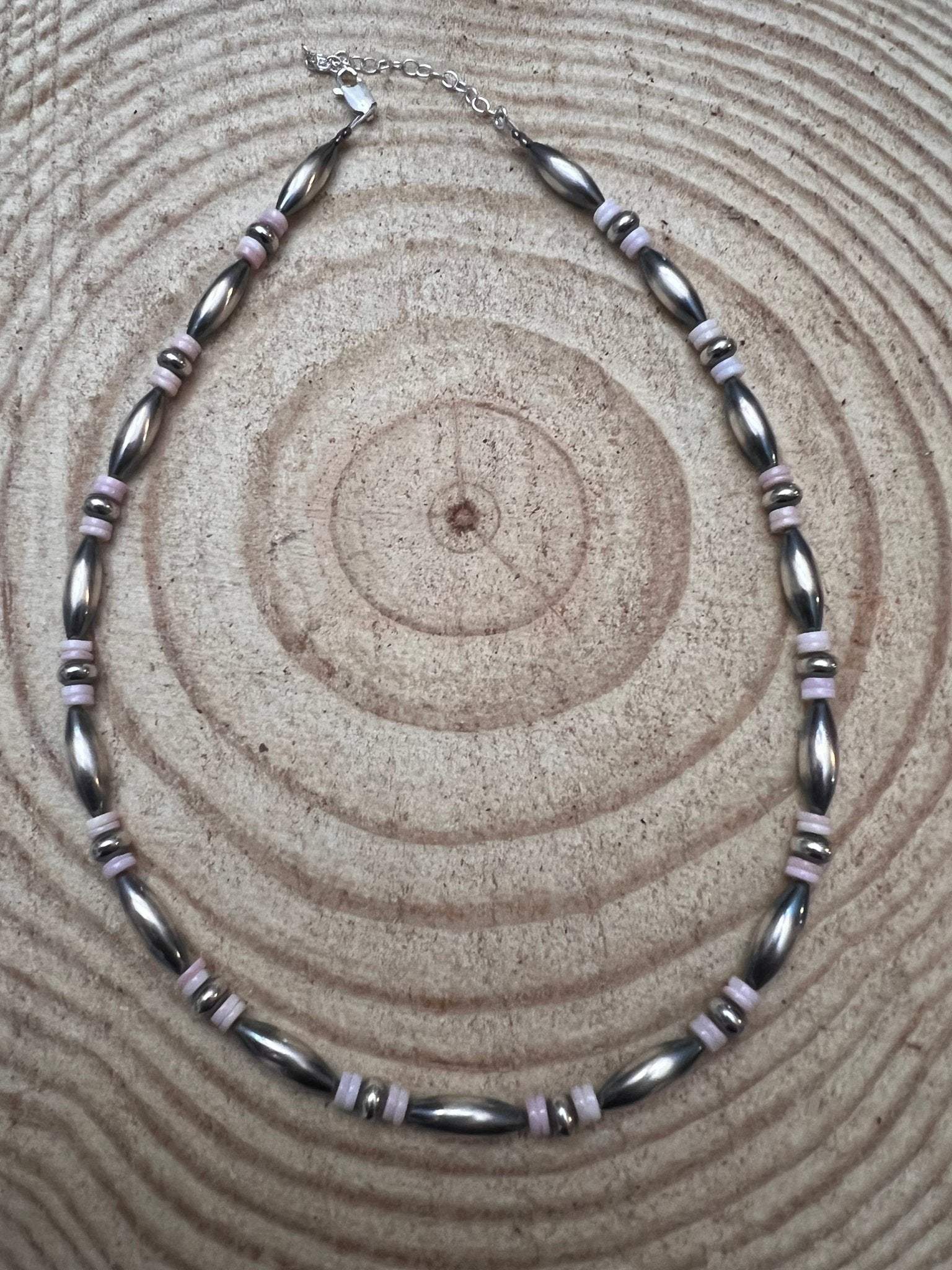 This necklace is a piece of high-quality craftsmanship, showcasing 14 inches of stunning sterling silver beads and a charming 3-inch extender chain. With 15mm torpedo beads, sterling saucer beads, and a delicate pink conch shell beads, this choker is the perfect accessory for any fashion-forward individual looking to add a touch of western elegance to their wardrobe. Embrace your unique style and add a touch of luxury to your next outfit with this exquisite choker.