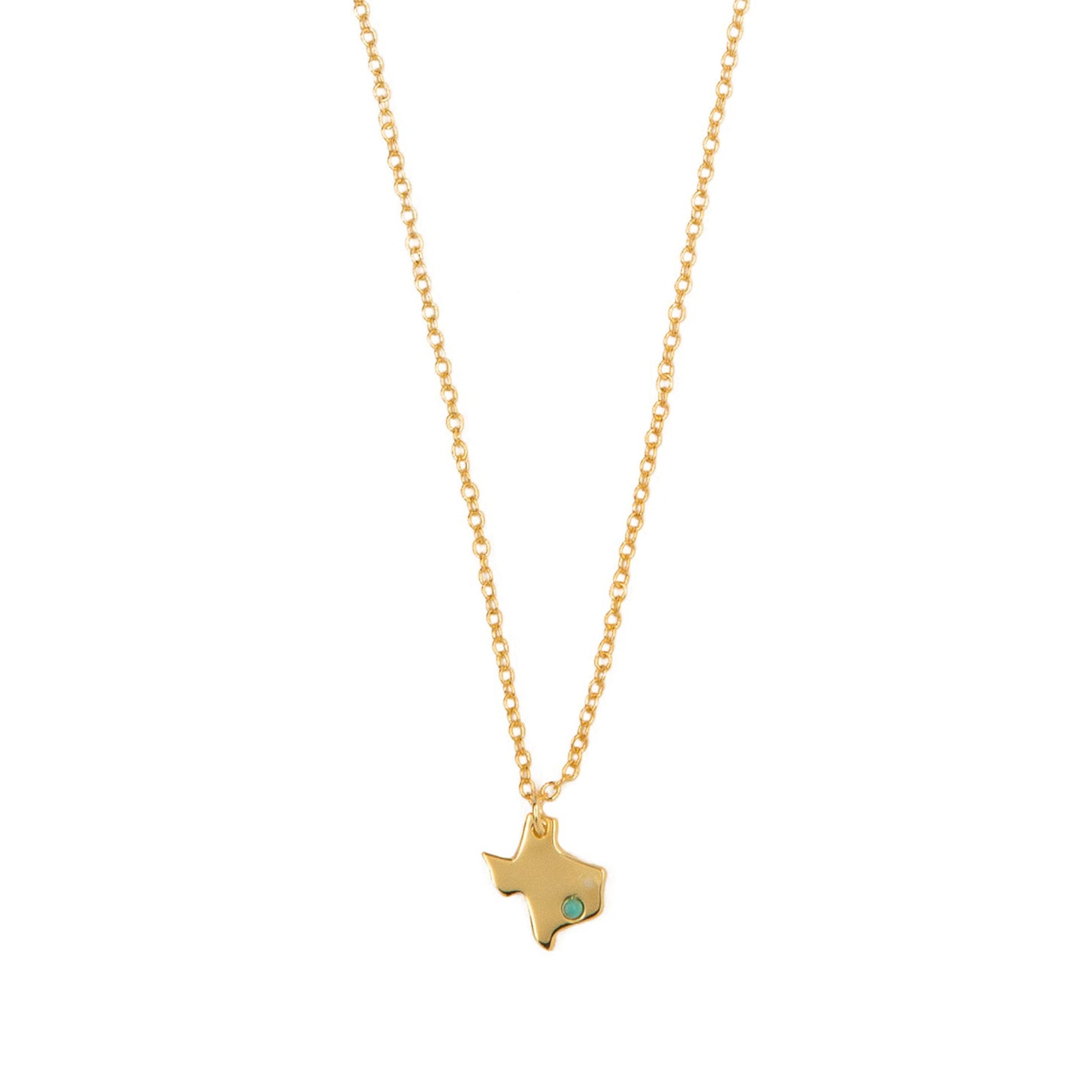 Honor our home with us when you rock the Texas Strong Necklace. Originally crafted in support of the community in the aftermath of Hurricane Harvey, this necklace holds a special place in our hearts featuring a simple gold chain necklace with a Texas shaped pendant. The pendant has our signature turquoise stone marking the location of our beloved hometown. This necklace and its meaning have since supported many relief efforts for our Texas neighbors and is a symbol of our states unity and strength.