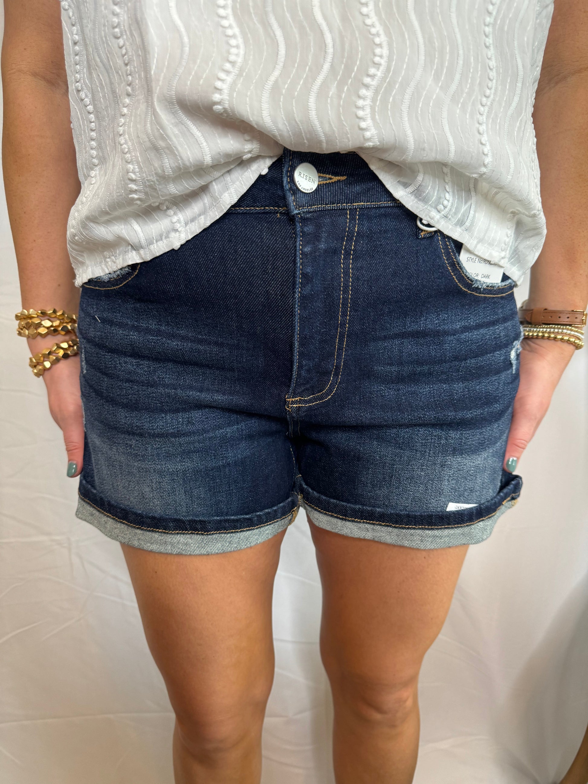 The Cuff Denim Short is a dark denim, high rise short with a turn up cuff! These shorts are perfect because they can be worn longer or cuffed up to wear shorter! These Risen shorts are super soft and stretchy!