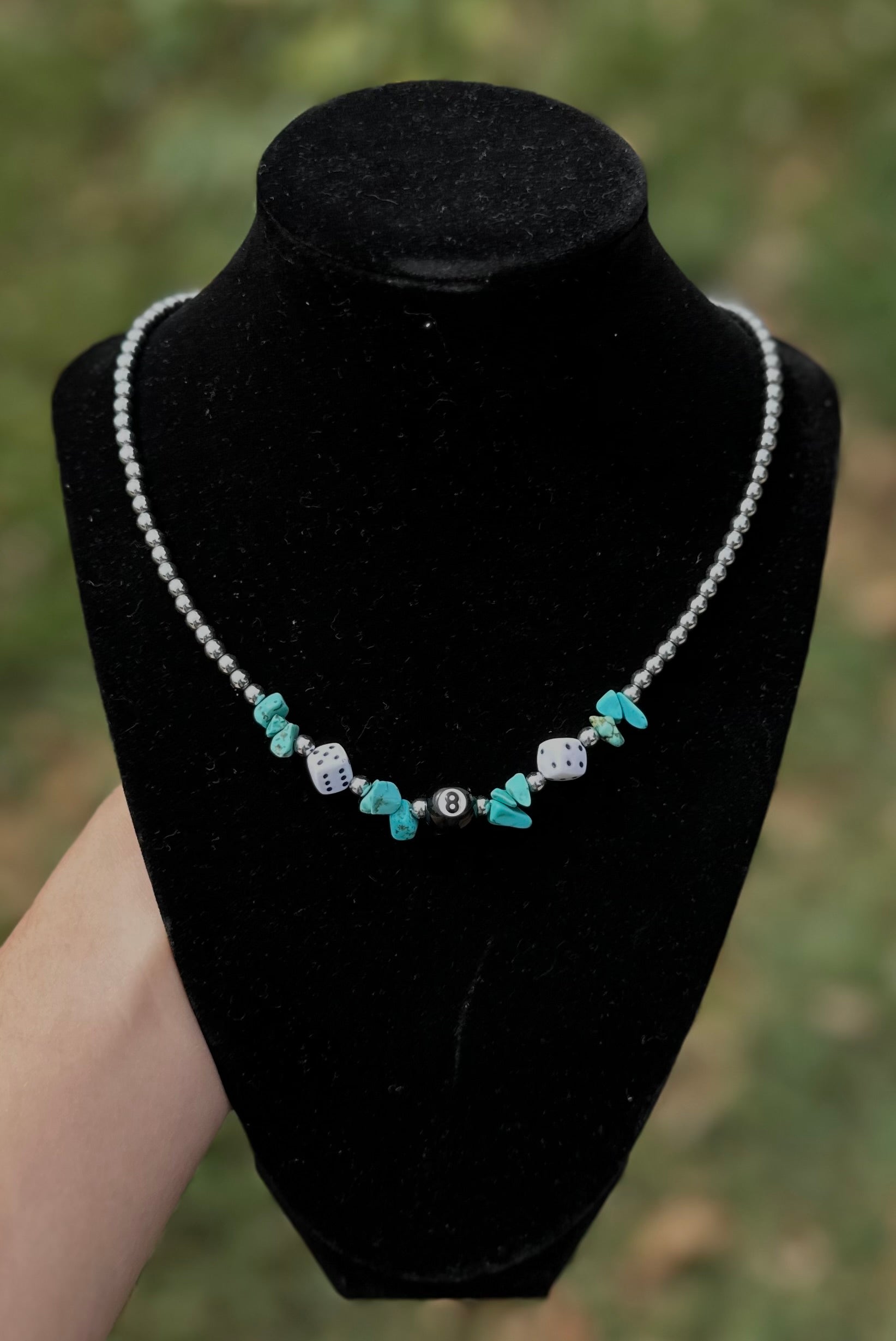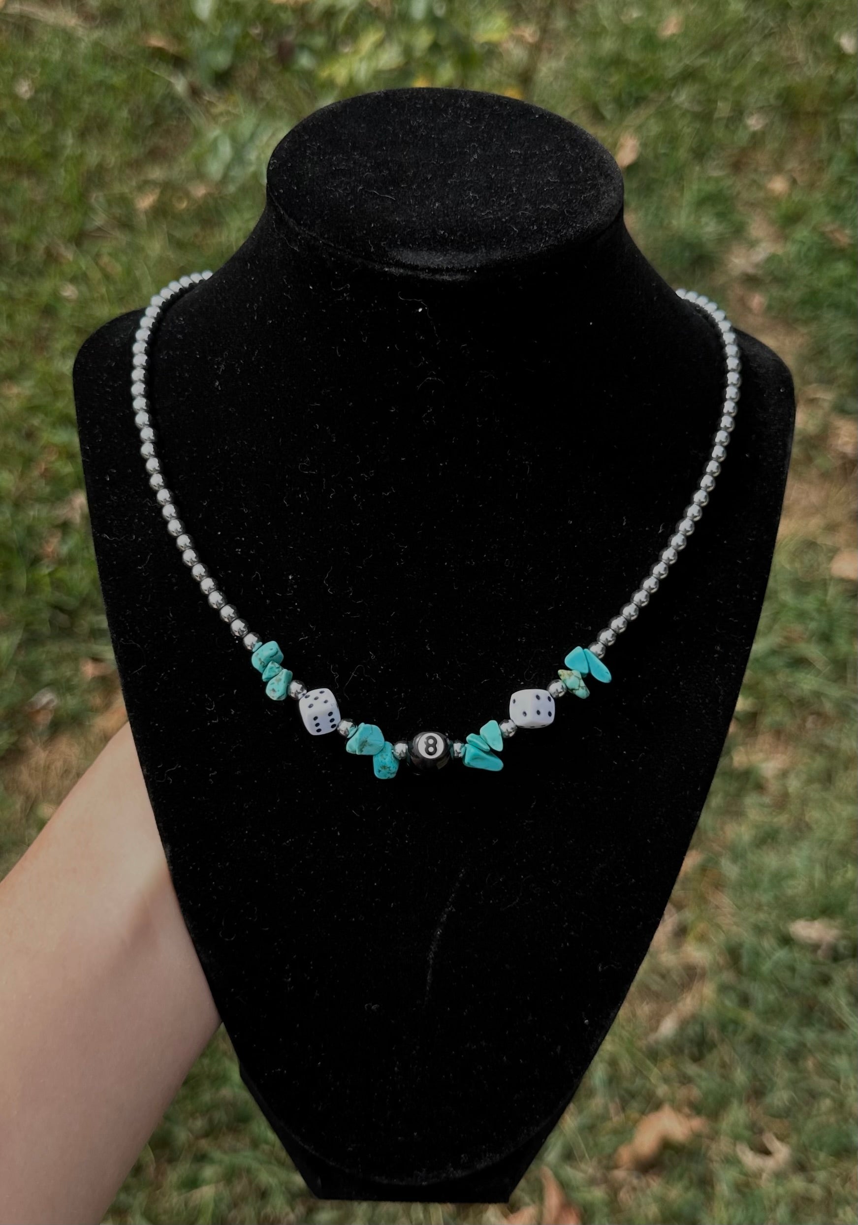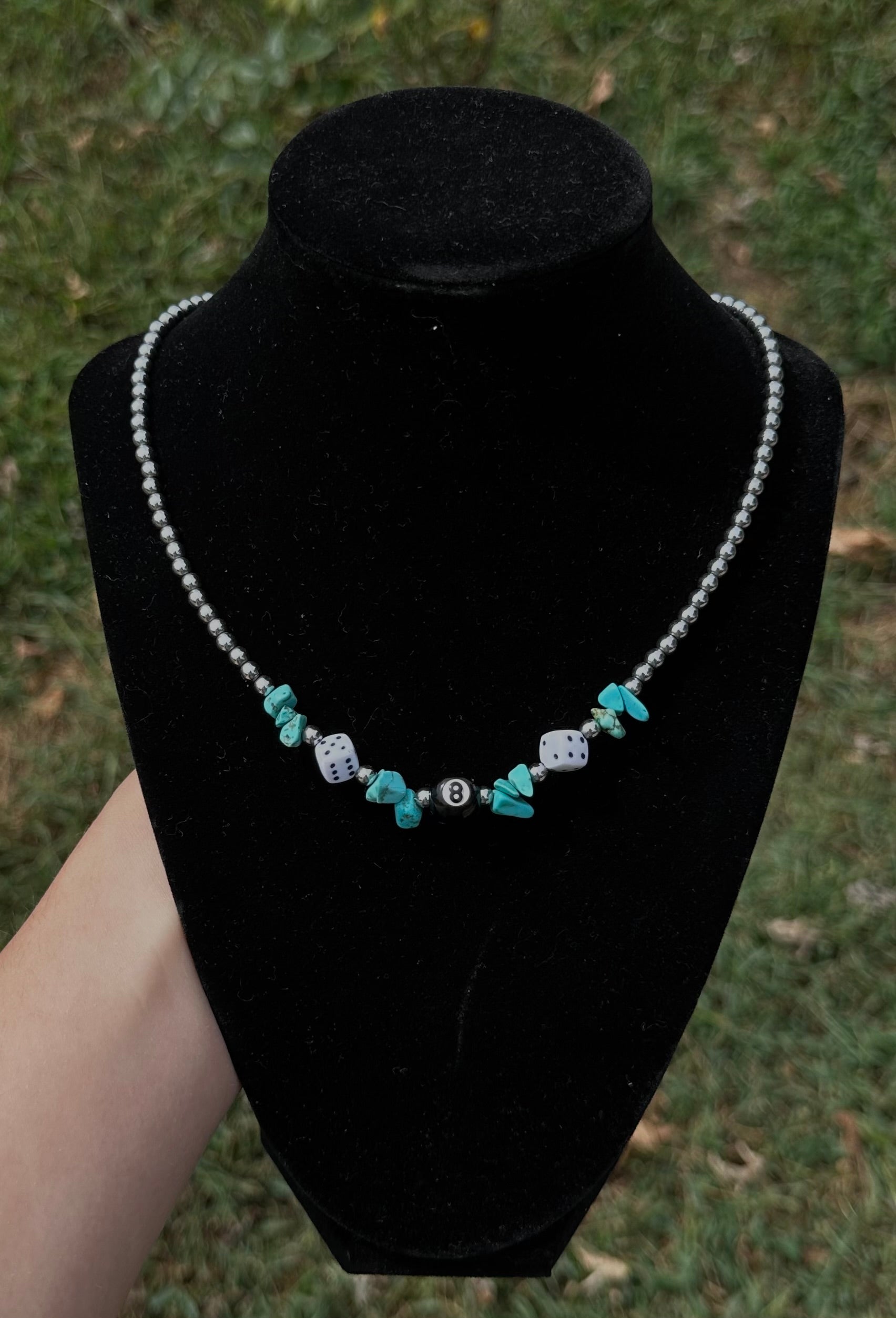- Materials: Dark silver beads, turquoise stones, dice charm, eight ball charm, silver spacers