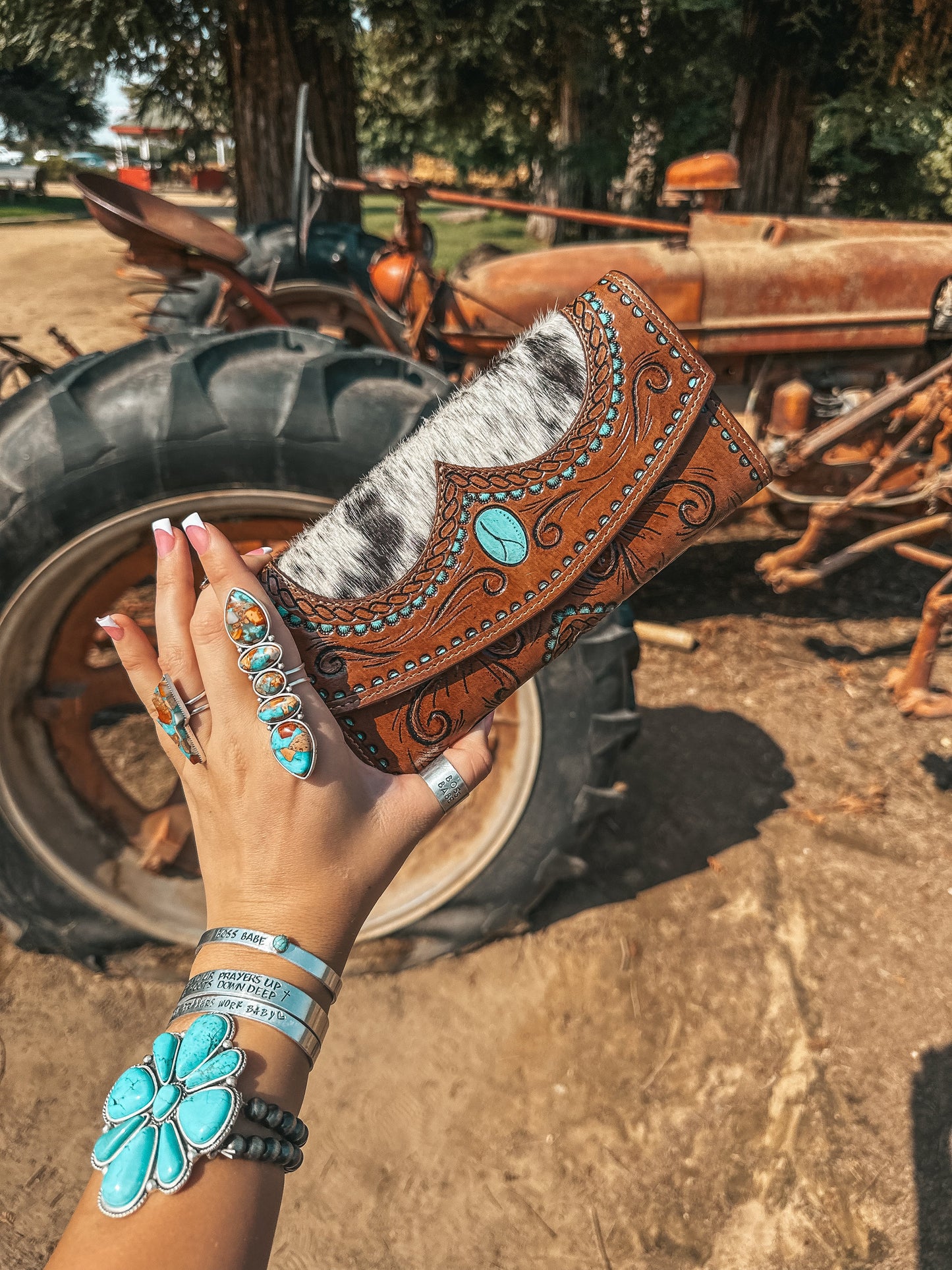 The interior boasts 13 card holder slots with one of them being for your ID card. Don’t go without your change holder either, we got one centrally located for you. When you’re done, snap her and keep all your valuables safe. Please note each wallet will be made with a one of a kind cowhide piece.