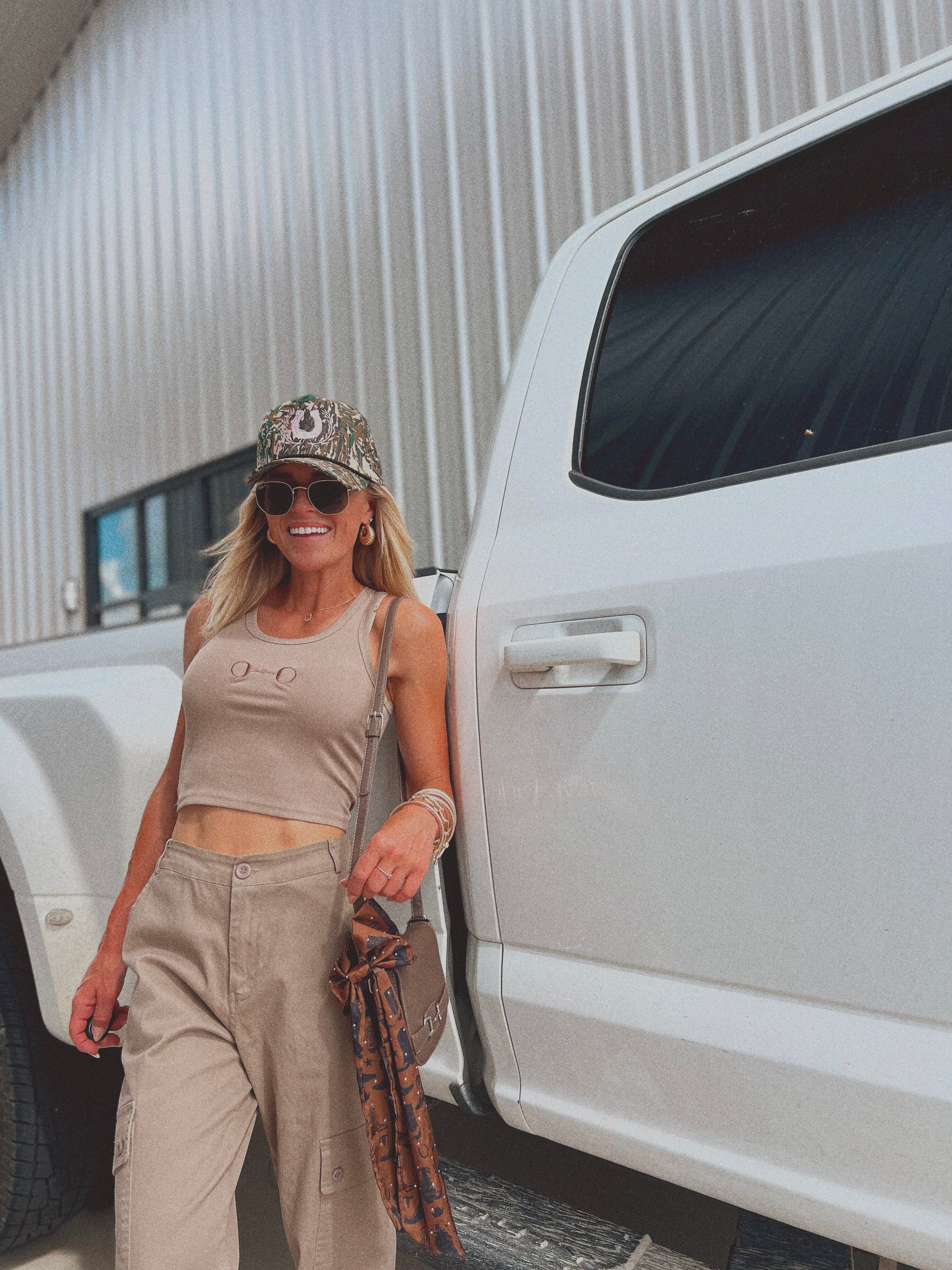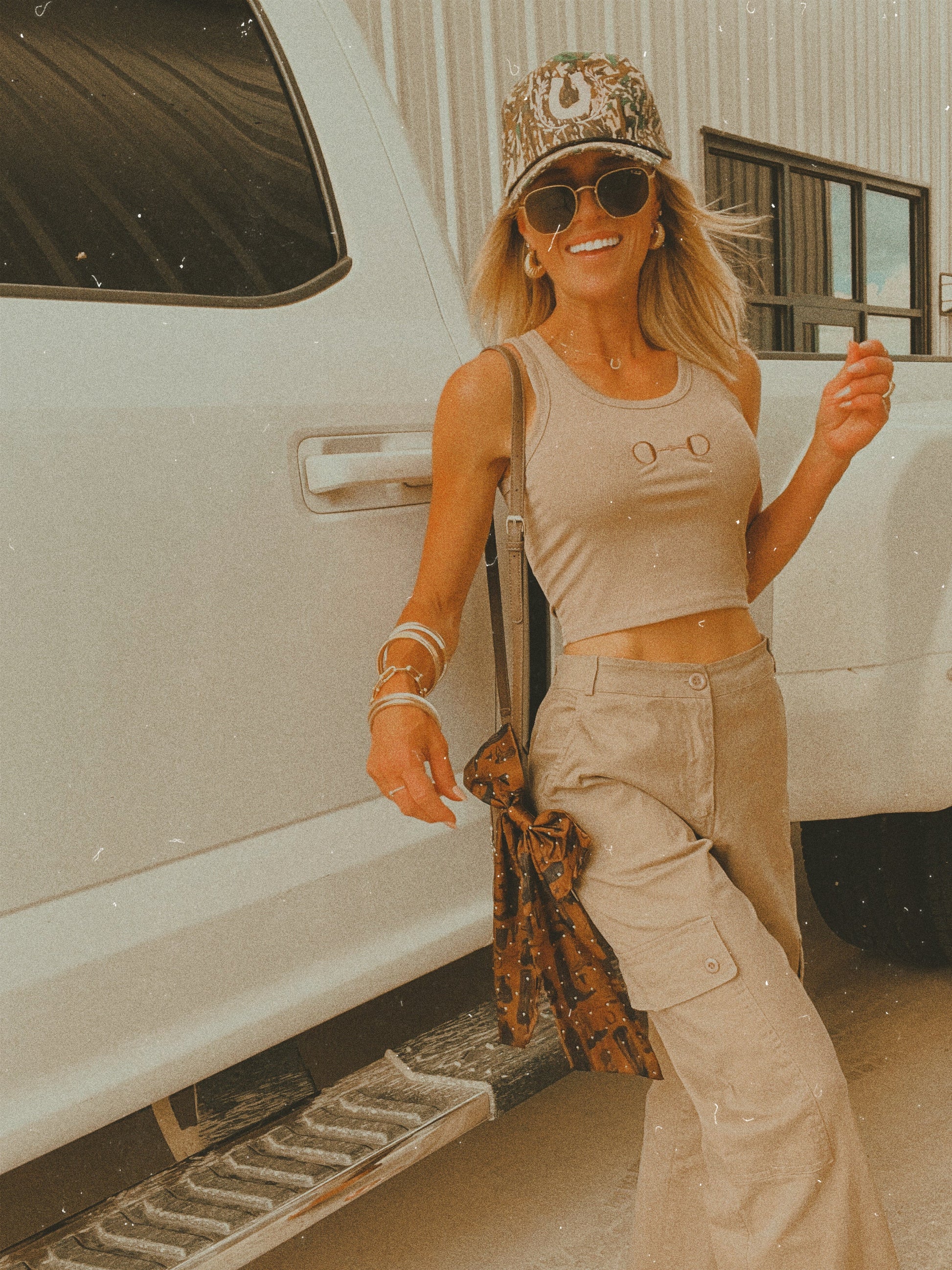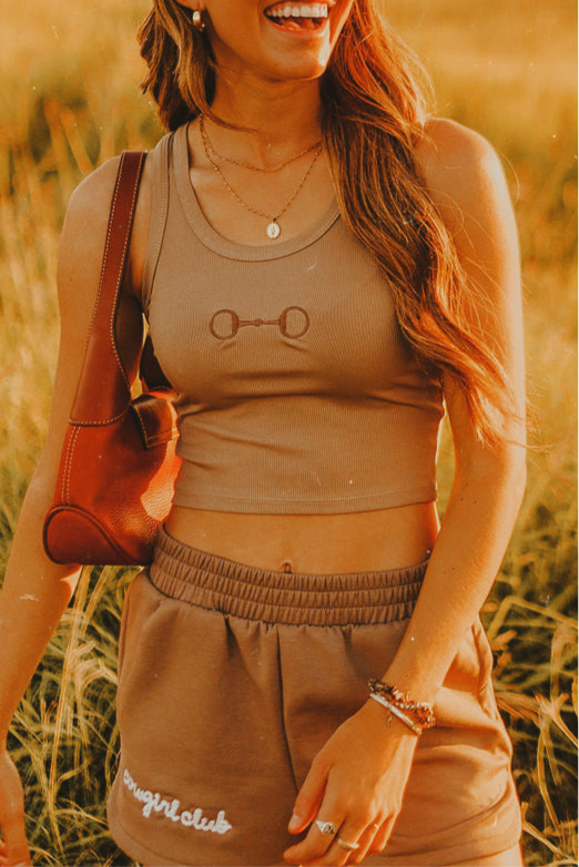 Classic with a Western twist. This cropped taupe ribbed tank features a brown embroidered horsebit front and center. Classic + clean silhouette, soft stretch, and just enough edge to make a statement—no matter what your plans are.