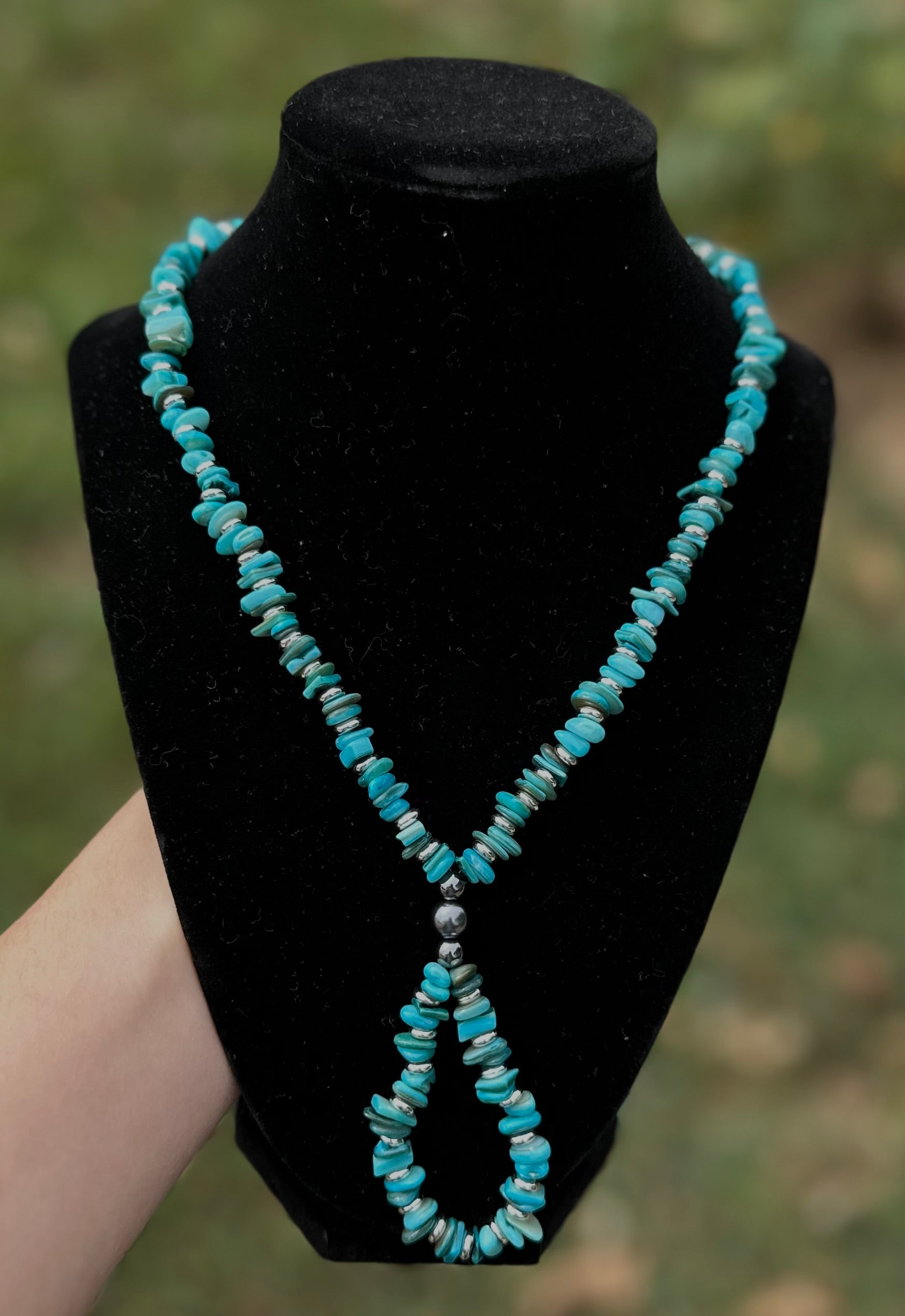 A modern take on a western classic. The Lariat is handcrafted with flat turquoise stones, dark silver beads, and silver spacers — finished with a silver lobster clasp and extender for the perfect fit. This design brings the rugged beauty of the West into a versatile everyday necklace.