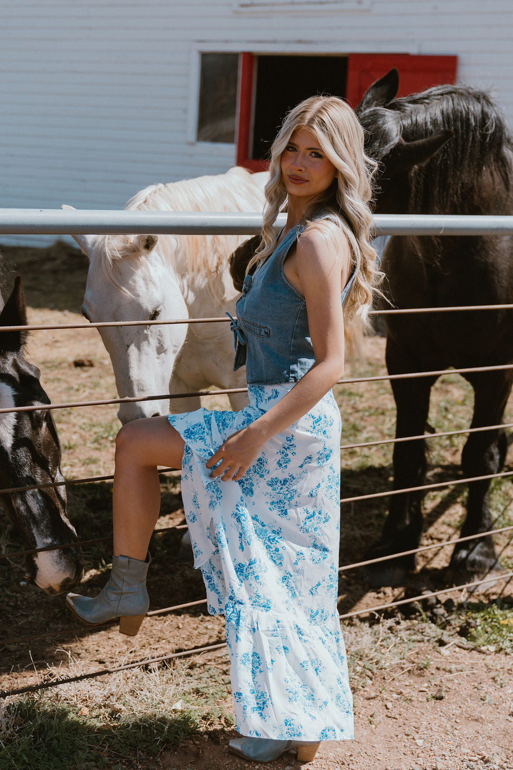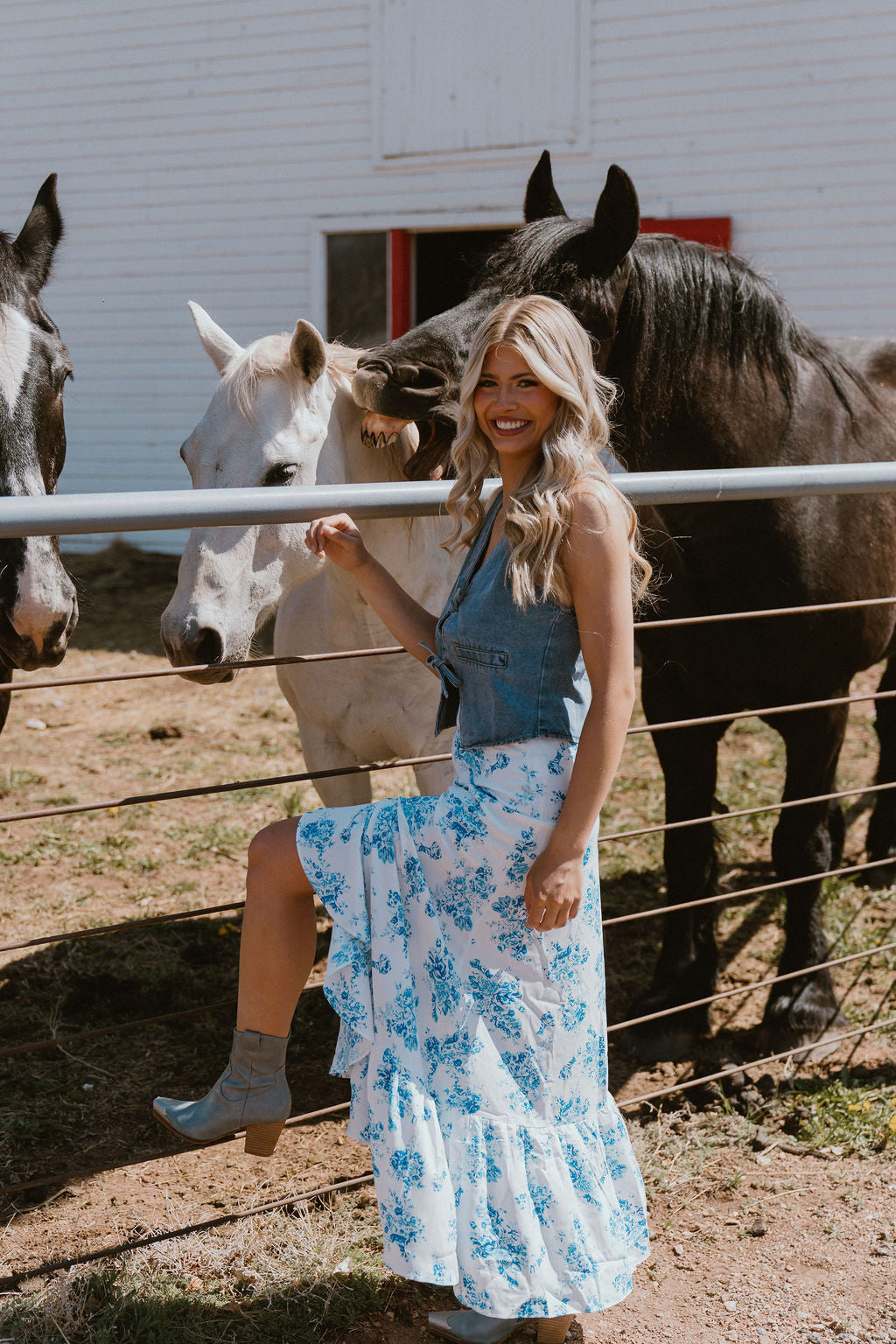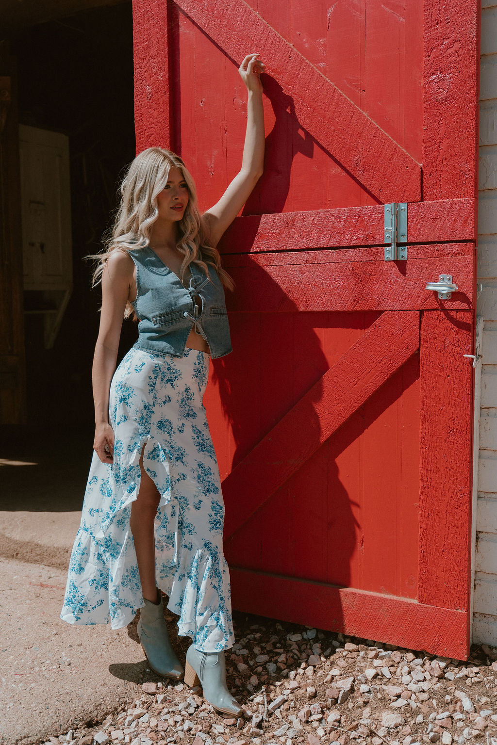 Introducing The Lilian - a charming blue floral maxi skirt. Graceful and versatile with its high waist design, it's easy to pull on and effortlessly stylish. The side split with ruffled edge adds a touch of western charm.