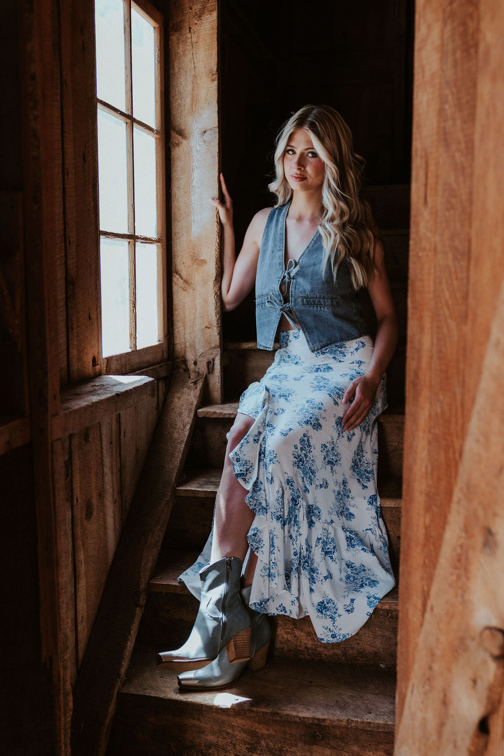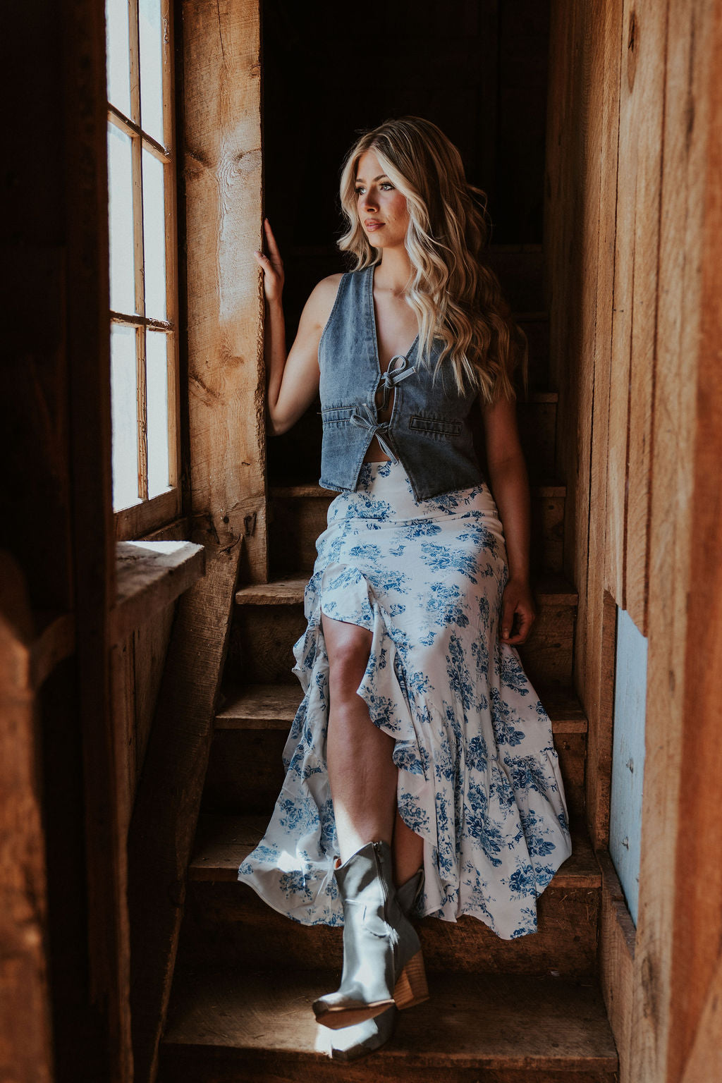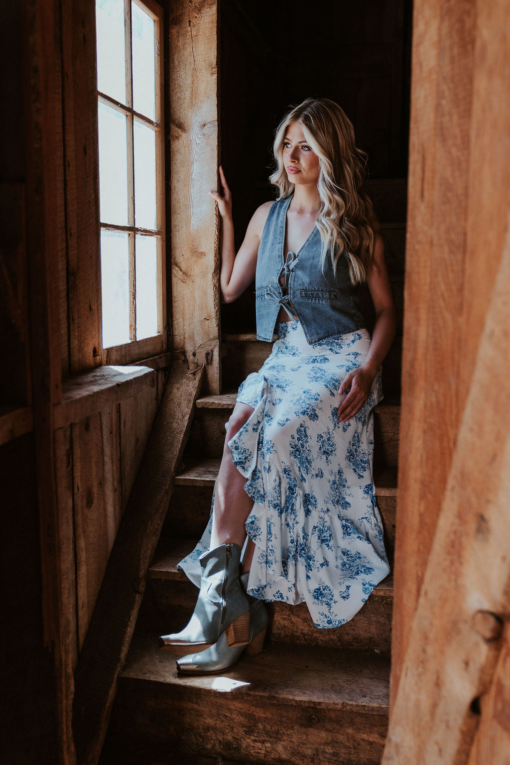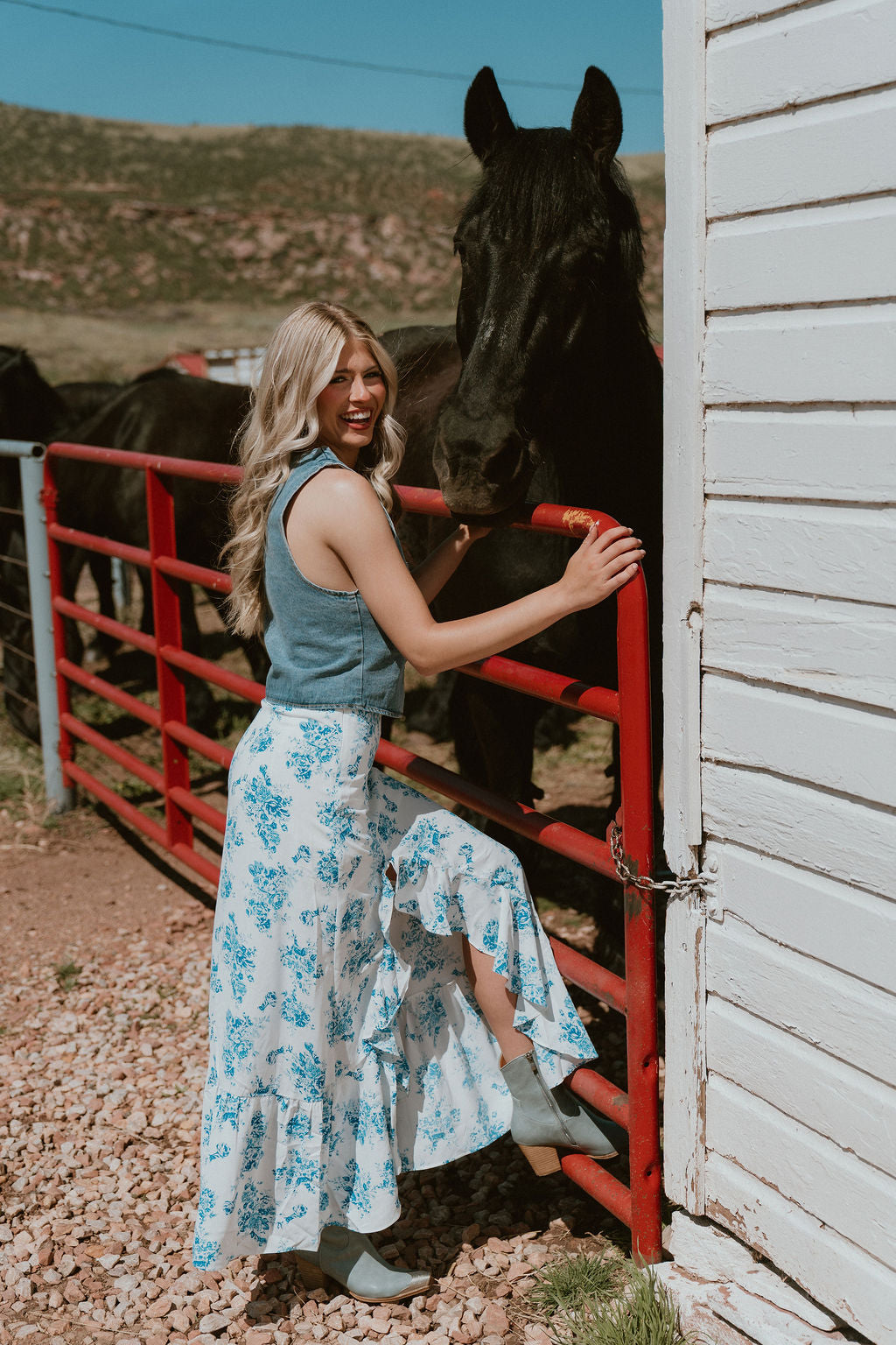 Introducing The Lilian - a charming blue floral maxi skirt. Graceful and versatile with its high waist design, it's easy to pull on and effortlessly stylish. The side split with ruffled edge adds a touch of western charm.