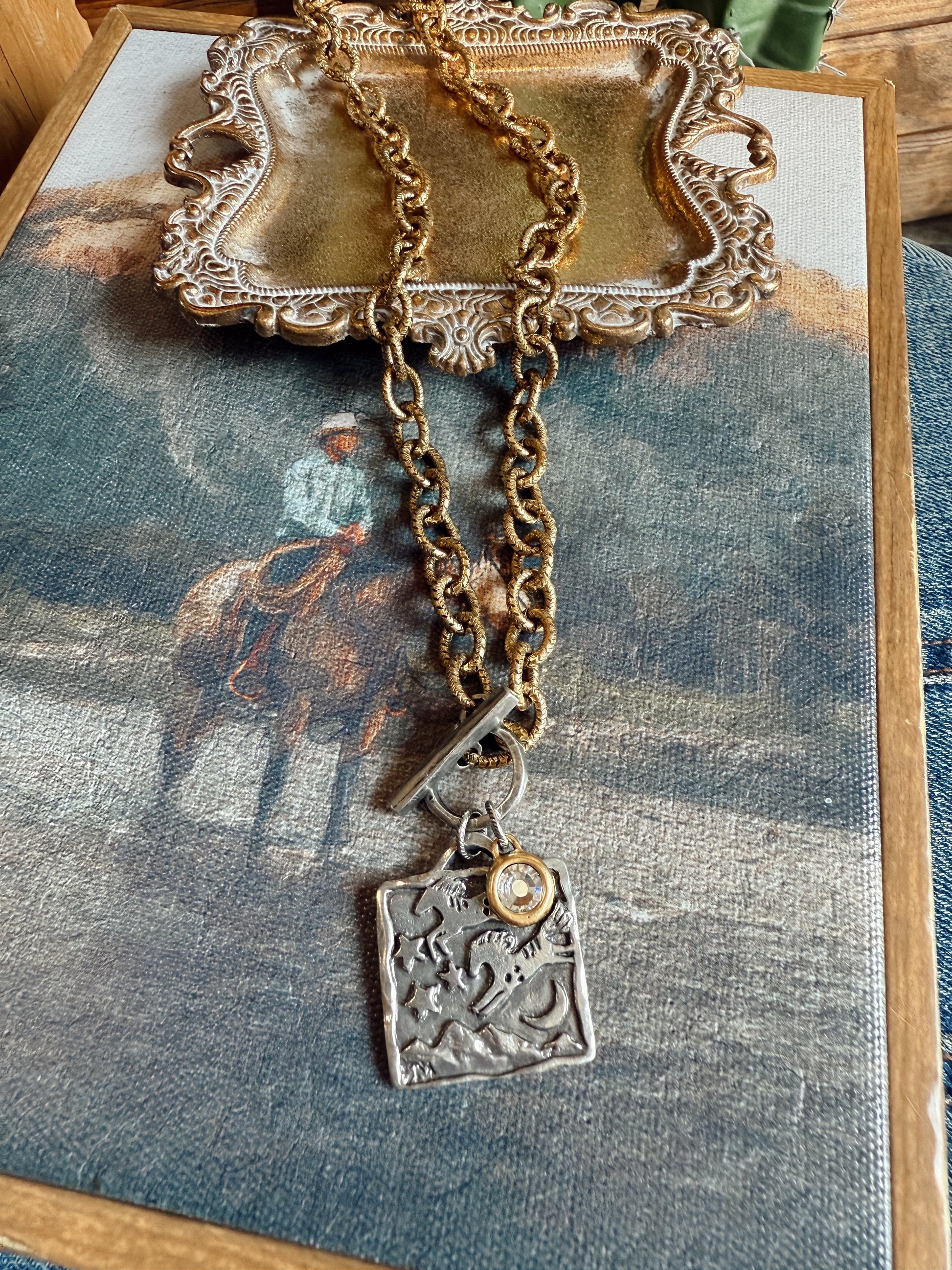 Designed and created by me, a rodeo wife in Texas, USA, the “Painted Pony” necklace captures whimsical western charm. An 18" textured antique gold-plated chunky chain meets an antique silver-plated toggle clasp, holding a pewter pendant adorned with painted ponies and a crescent moon. The back is engraved with “my ponies jumped over the moon,” adding a sweet surprise for the wearer. A sparkling Swarovski crystal charm completes the design. Most materials are sourced from the USA, and my rodeo roots inspire every detail. All materials are artisan and handmade, so slight variations add unique character. Normal jewelry care for plated pieces applies — avoid water, lotions, and perfumes to keep it looking its best.