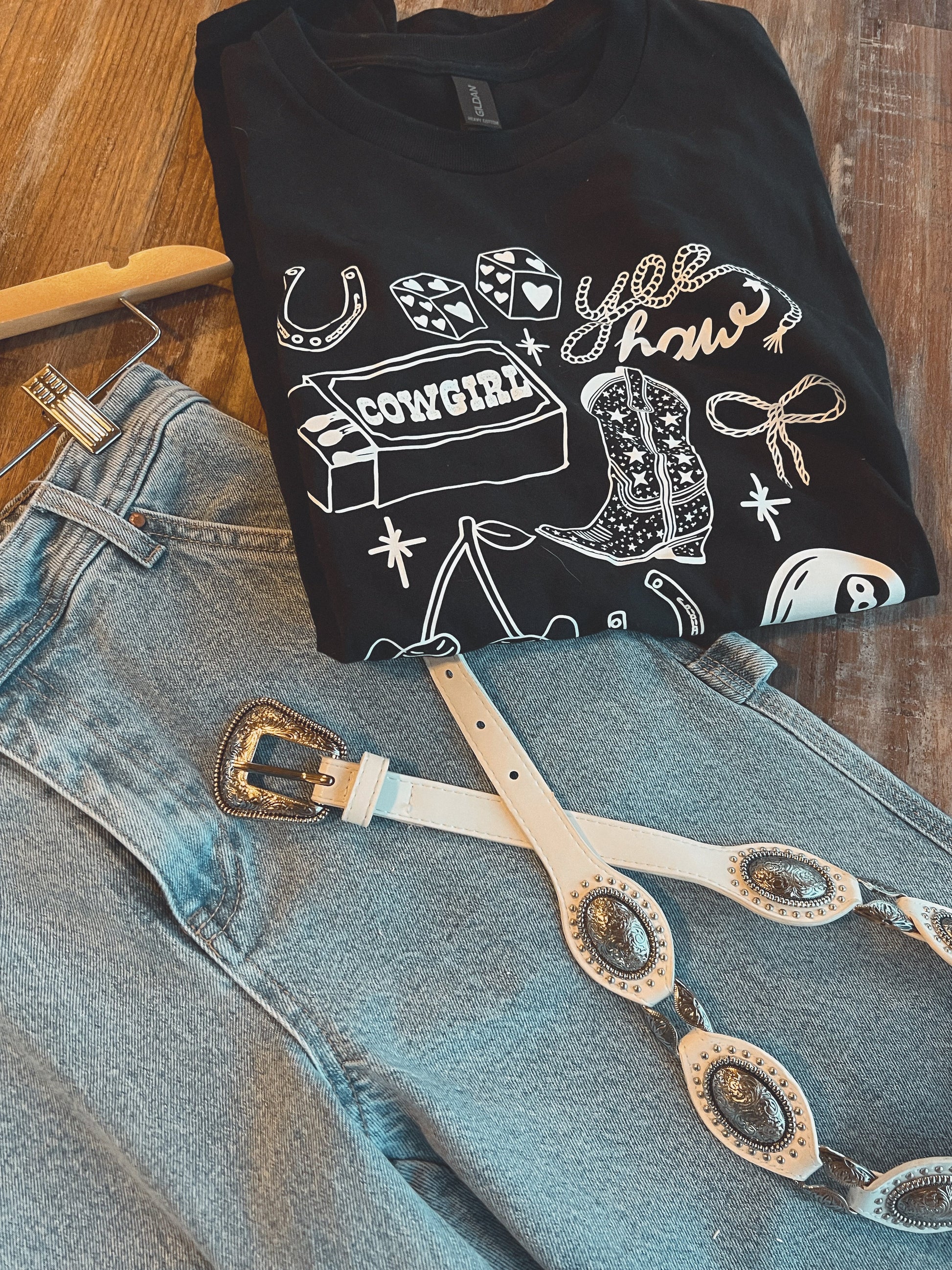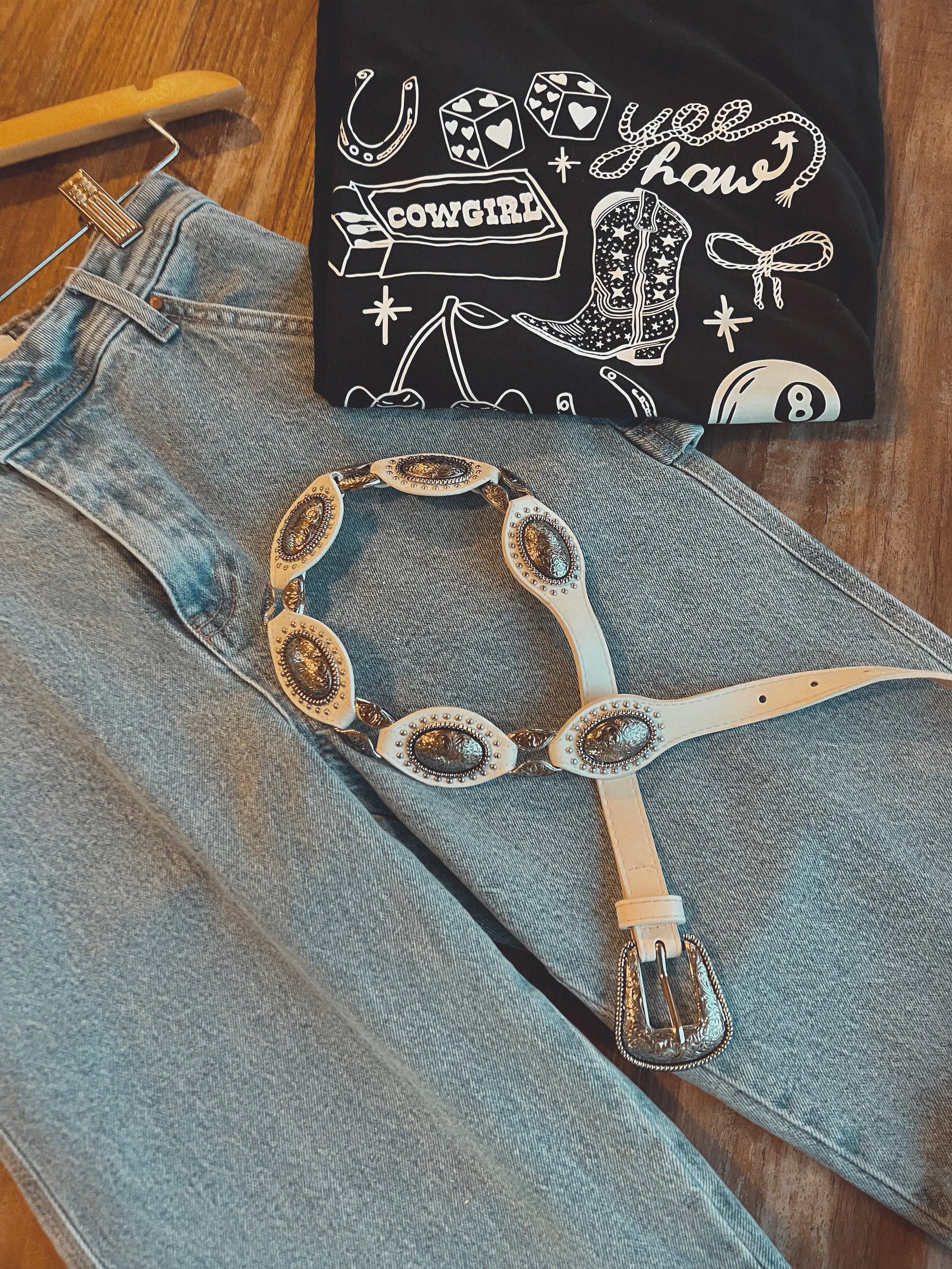 A classic staple with western flair. The Talia features detailed silver conchos along a sleek white leather strap, blending classic style with a modern edge. Whether cinched over denim or layered with a flowy dress, this belt adds the perfect finishing touch to any look.