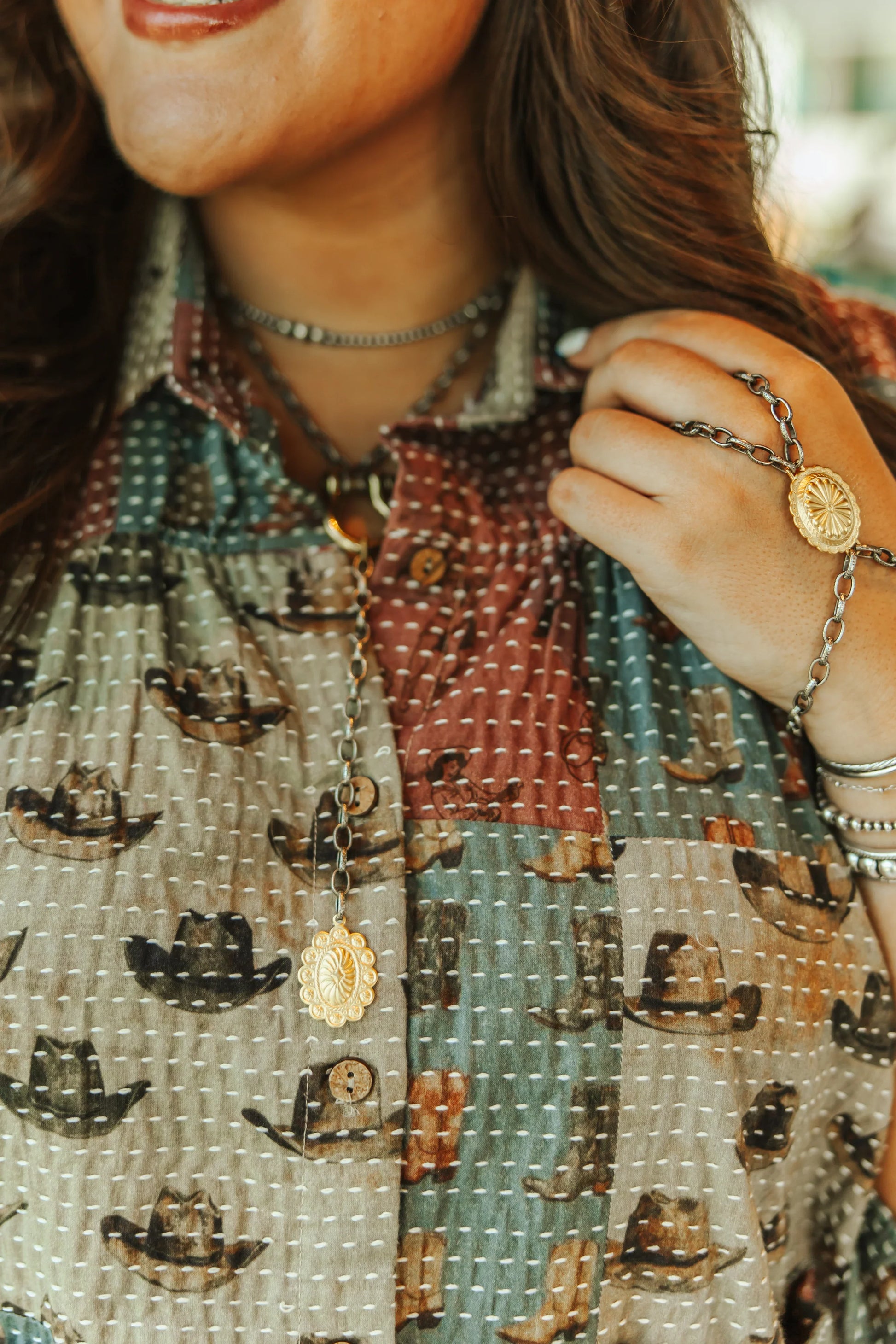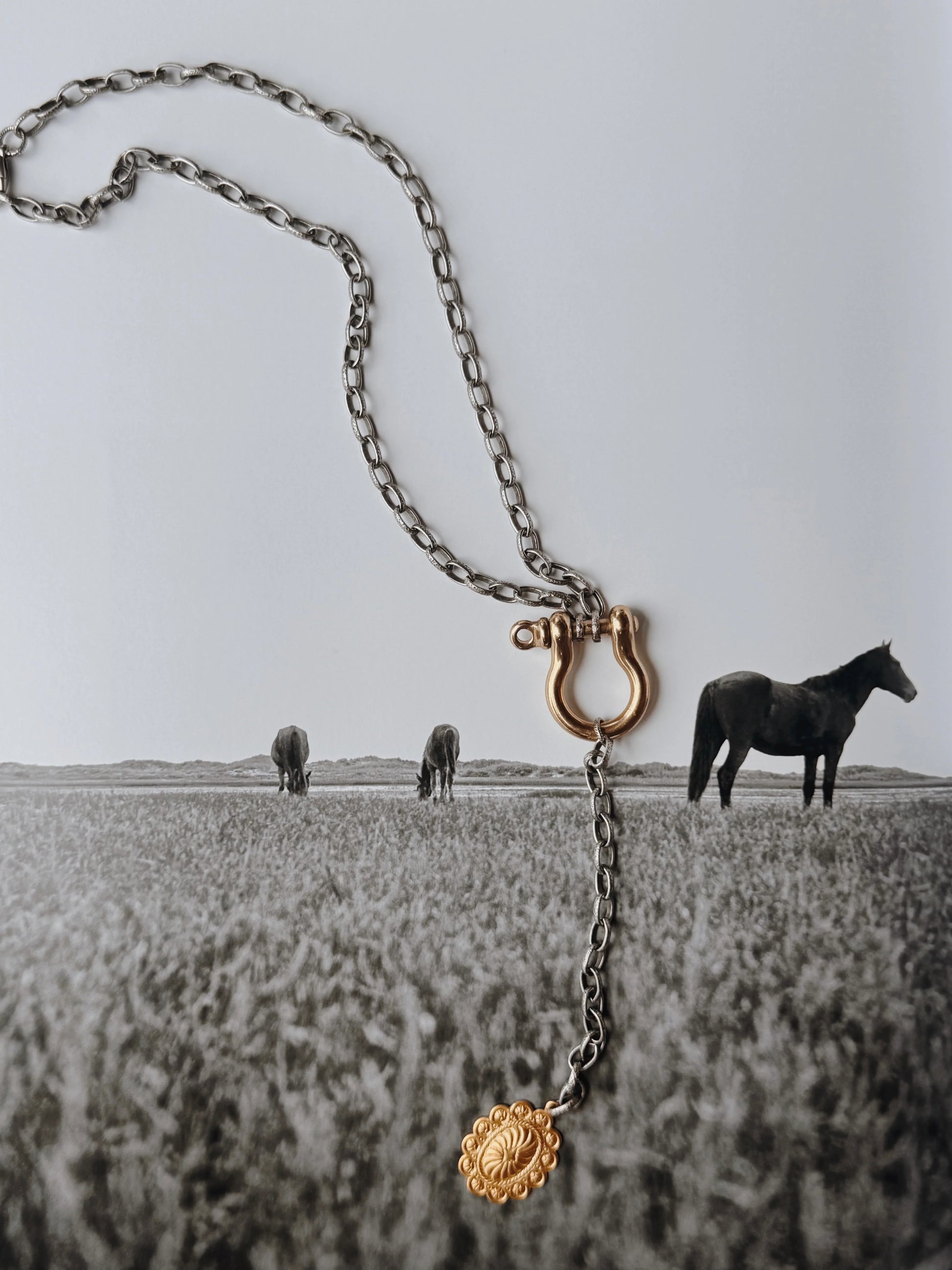 Designed and created by me, a rodeo wife in Texas, USA, this lariat features a textured paperclip chain in antique German silver — a rare material with a timeless western feel. Finished with a mixed-metal horseshoe pendant and concho charm, it pairs perfectly with the matching hand chain made from the same artisan materials. Most components are sourced from the USA, and my rodeo roots inspire every design. All materials are artisan and handmade, so slight variations add character. Normal jewelry care for plated pieces applies — avoid water, lotions, and perfumes to keep it looking its best.