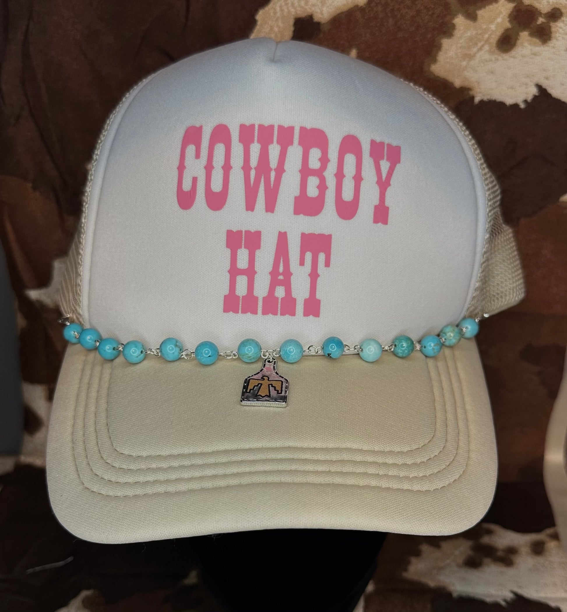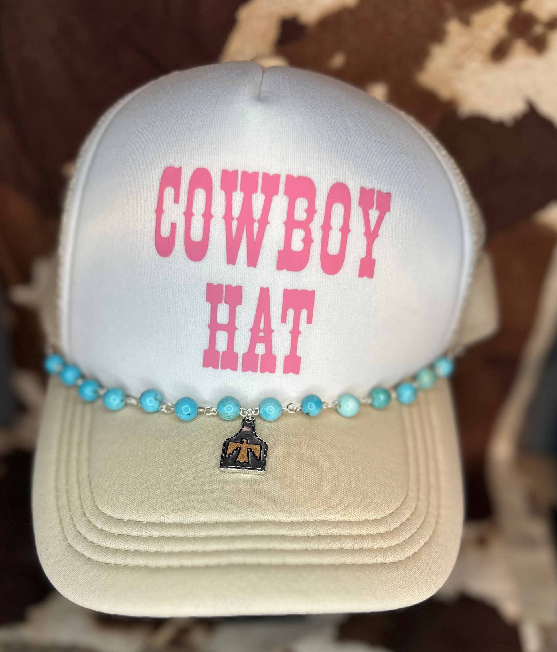 Add a bold southwestern flair to your favorite trucker hat with the Thunderbird Trails hat band. Handcrafted with care, this unique accessory features vibrant round turquoise beads strung together with durable, hand-wrapped wire. At the center, a striking Thunderbird charm adds a symbolic touch of power and freedom, making it a standout piece for any outdoor adventure or casual look. Finished with secure lobster clasps on each end, this hat band is easy to attach and remove, combining style with practicality in one stunning accessory.