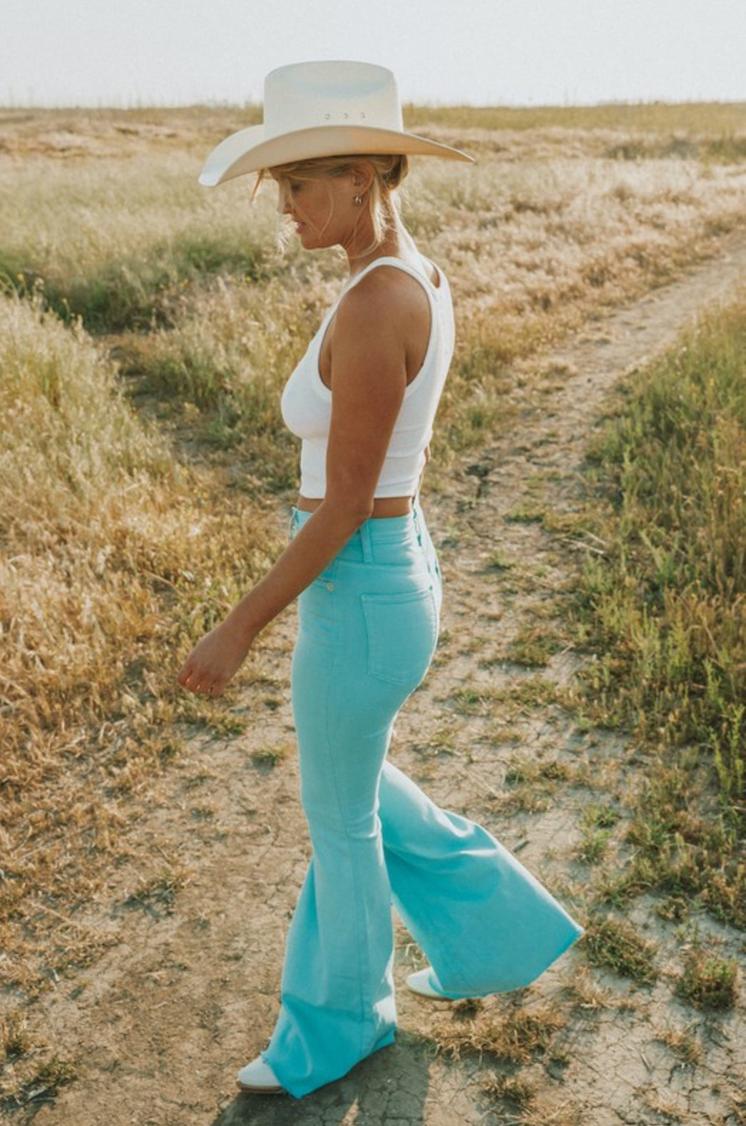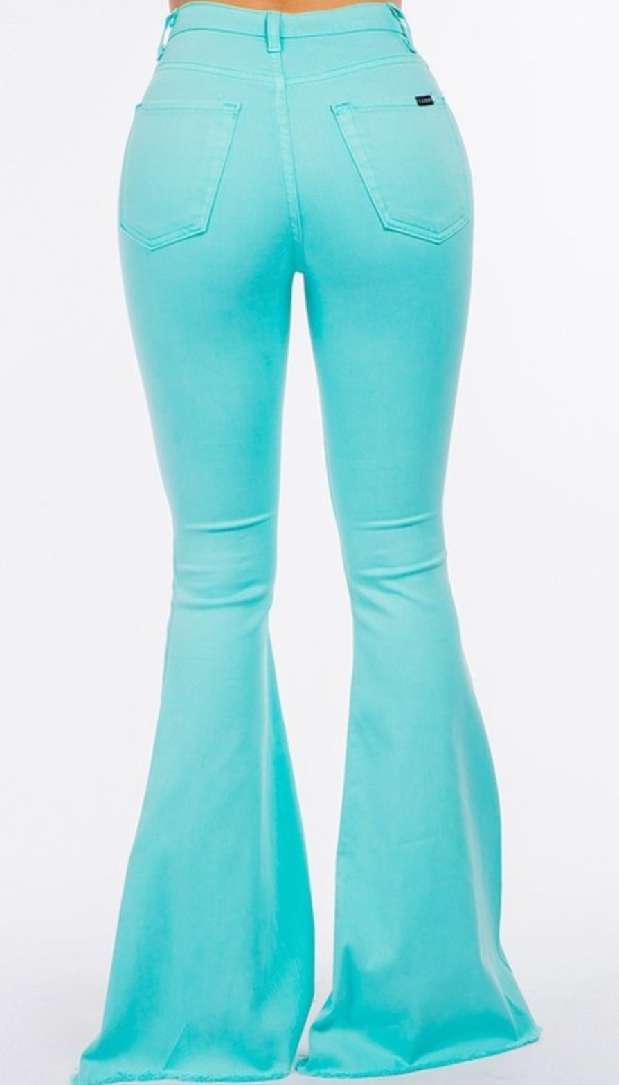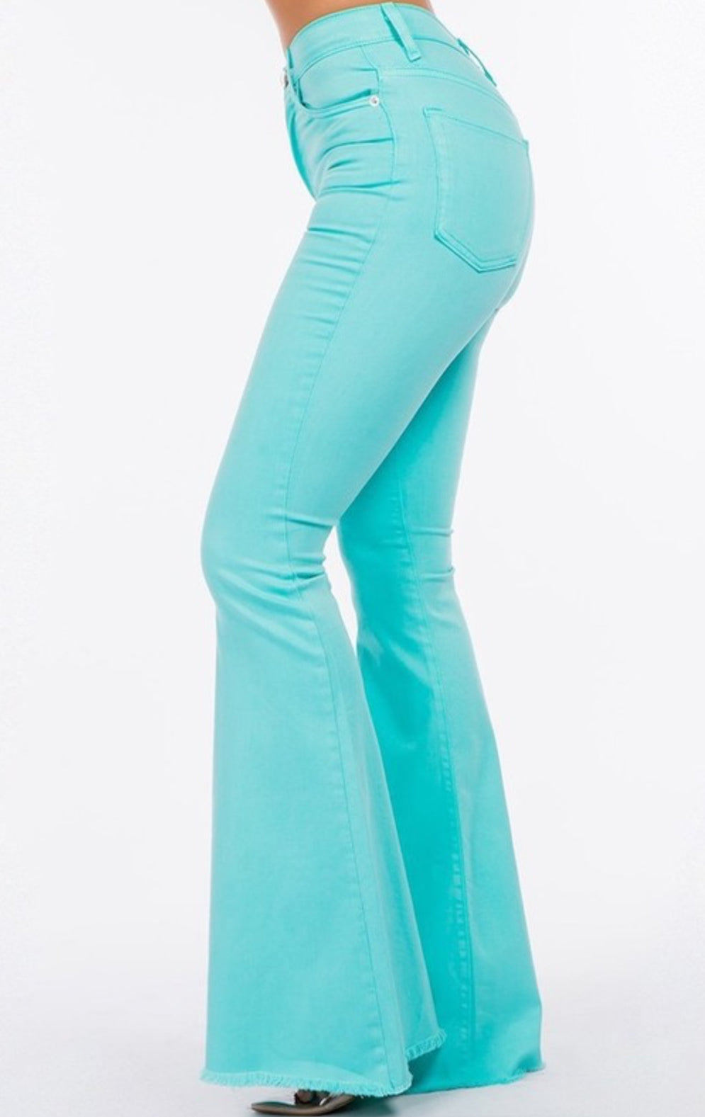 Make a vibrant style statement with these Turquoise High Waist Bell Bottom Jeans, designed to elongate your silhouette and add a pop of color to your wardrobe. These jeans feature a classic 5-pocket design, functional front and back pockets, and a front button and zipper closure for a timeless yet bold look. The stretch denim ensures a flattering, flexible fit, while the frayed hem adds a touch of vintage edge.