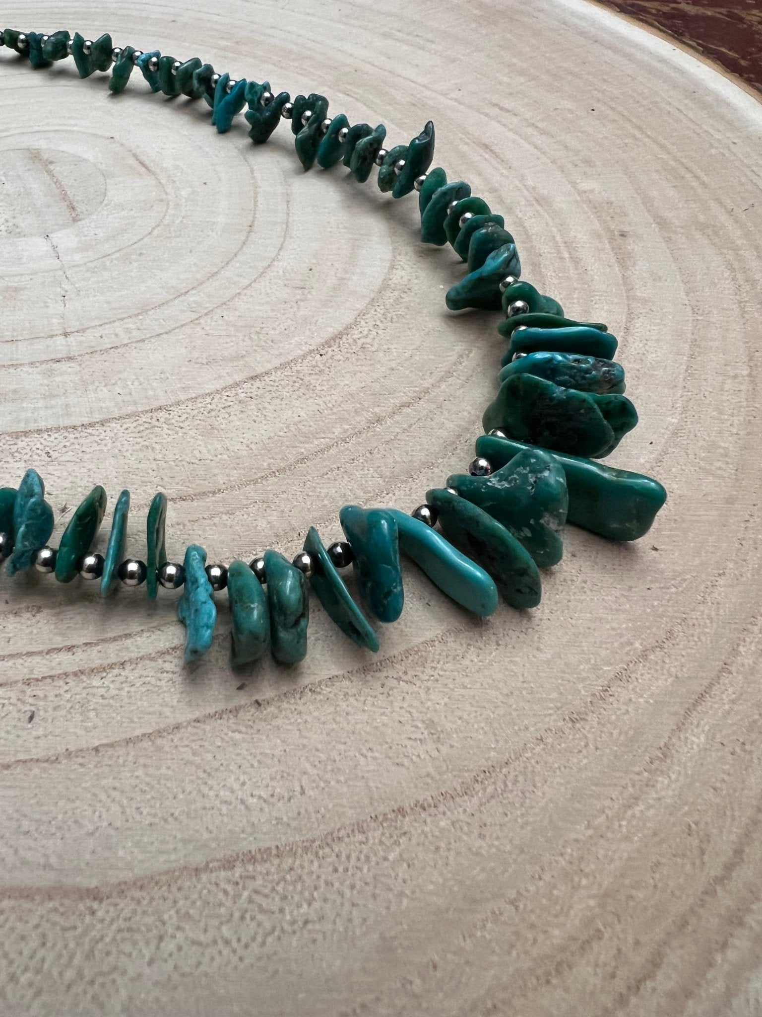 Indulge in this amazing necklace! American turquoise paired with 3 mm sterling silver pearls, creating a unique and versatile 18-inch necklace. Each handcrafted piece is one-of-a-kind, varying in size and color. Complete the look with a tarnished hook clasp. Perfect for any occasion, from weddings to Western fashion, this authentic and carefully crafted jewelry is the perfect addition to any collection.