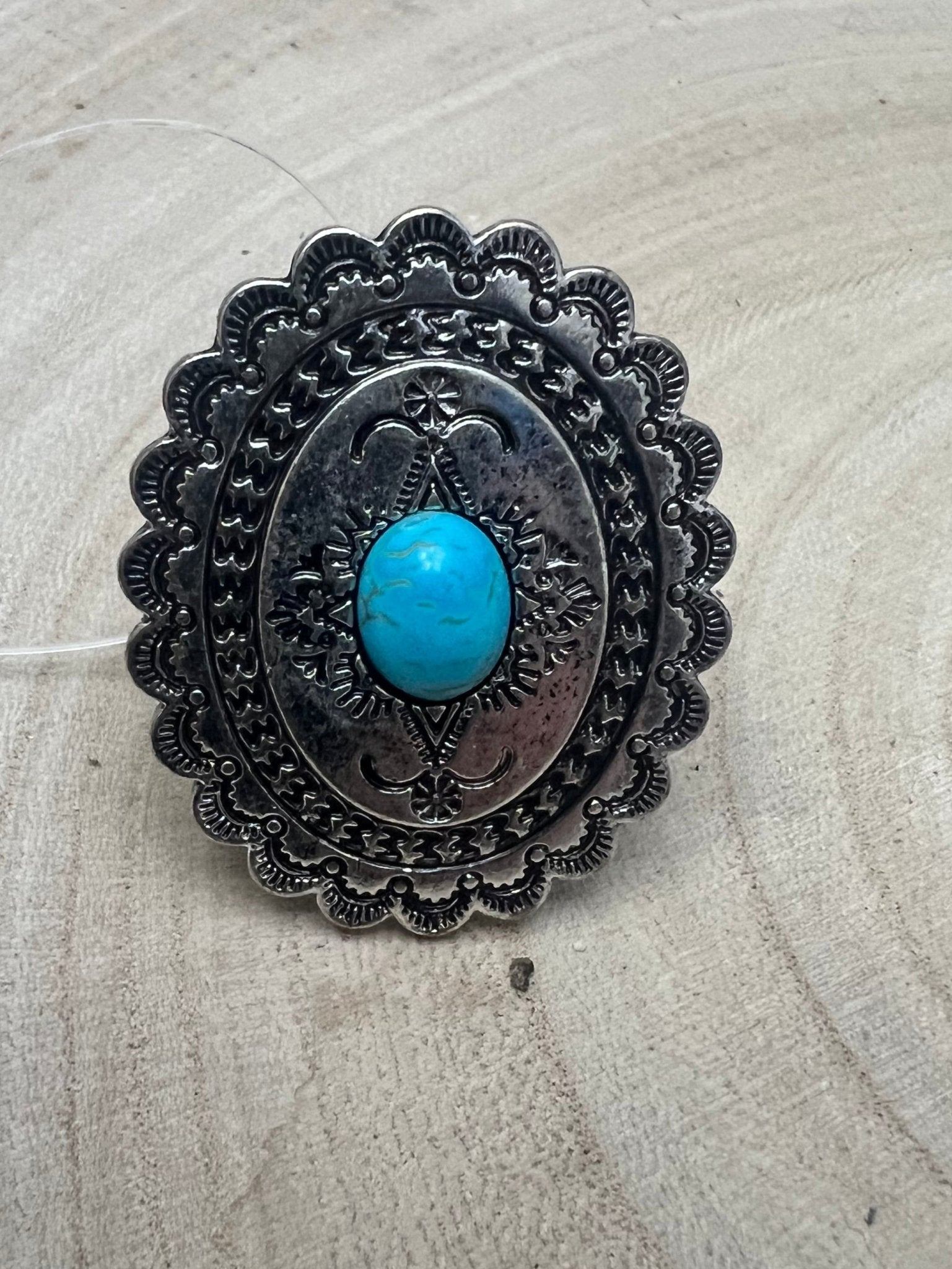 This Western Concho and Faux Turquoise Stretch Ring makes a bold statement with its impressive 1 1/2 inch size.