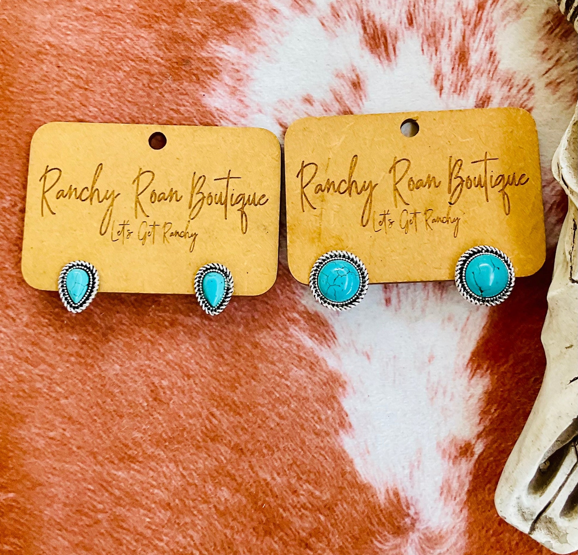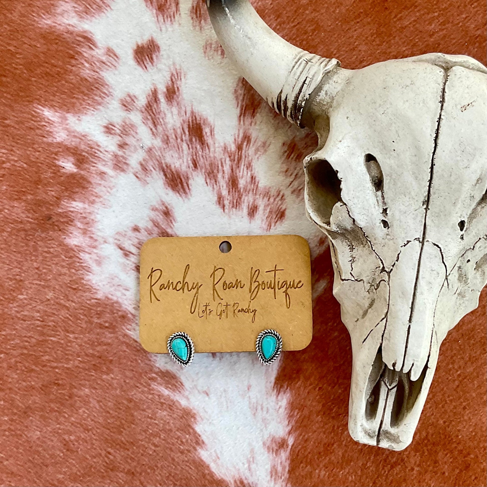 Add a touch of Western elegance to your boutique collection with these 10mm Drop Turquoise Stud Earrings. Featuring natural turquoise stones in an antique silver plate setting, these earrings are lightweight, stylish, and perfect for customers seeking unique Western-inspired accessories.